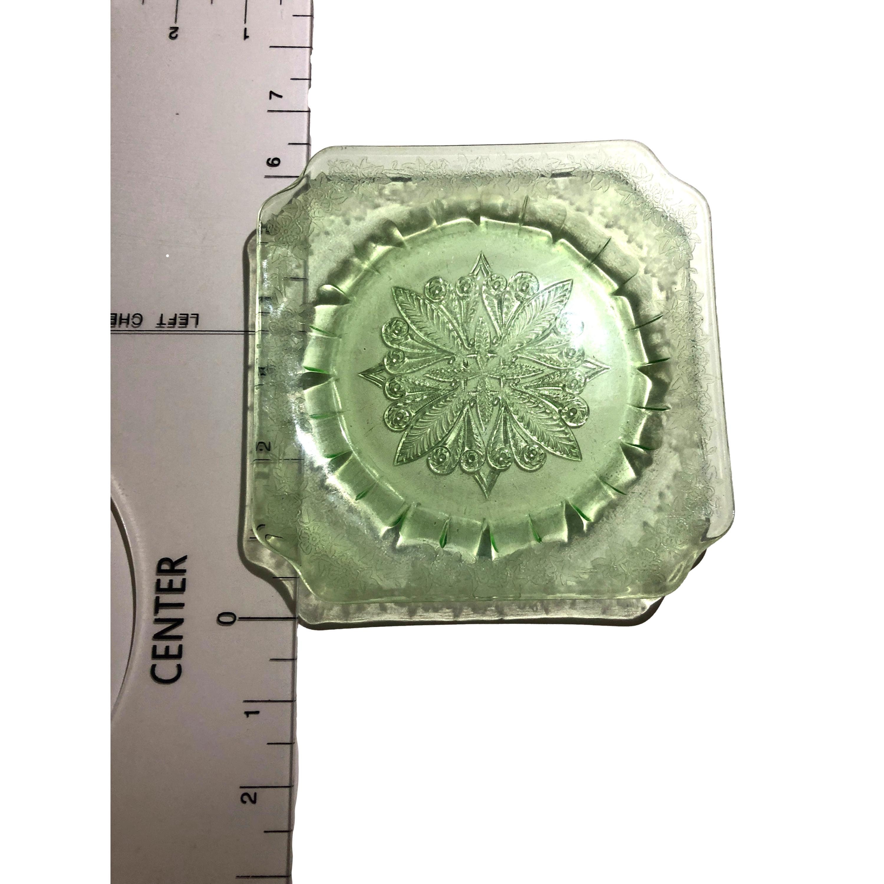 This is a Depression green glass square bread and butter plate by Jeanette Glass in the Adam green pattern. It was made from 1932-1934. The pressed glass is uranium vaseline glass that measures six (6) inches square. There may besome minor scratches due to age, vintage condition. The green glass plate from the 1930s.