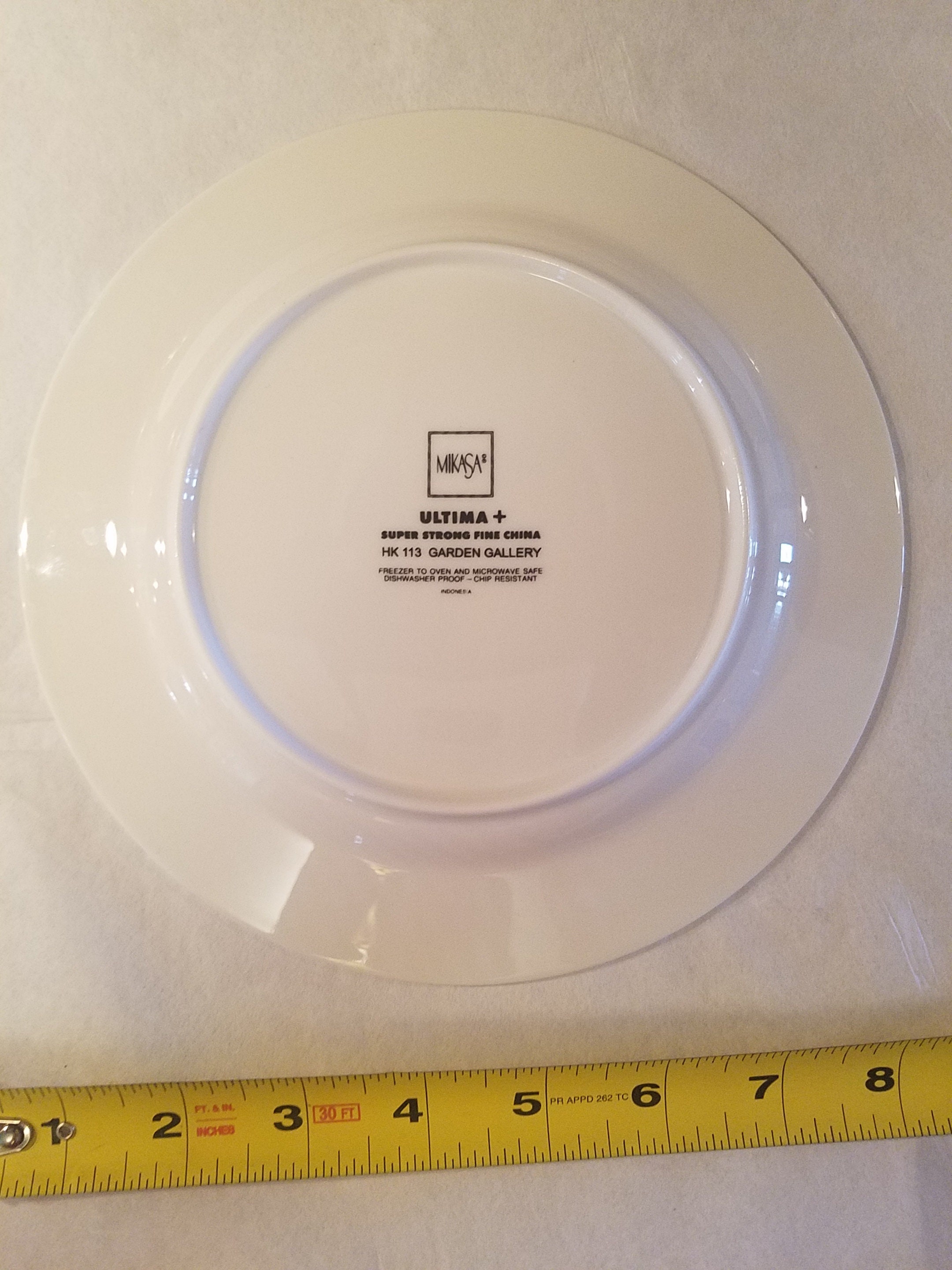 Set of (4) four vintage salad plates by Mikasa China. This replacement china is the Garden Gallery pattern. These small salad plates are now available in our shop. The floral dessert plates measure 7.75 inches in diameter. The Mikasa plates have a green border design with a center of iris and other flowers. These are great replacement dishes for your collection or a great starter set. Made between 1999-2002, now discontinued Mikasa.
