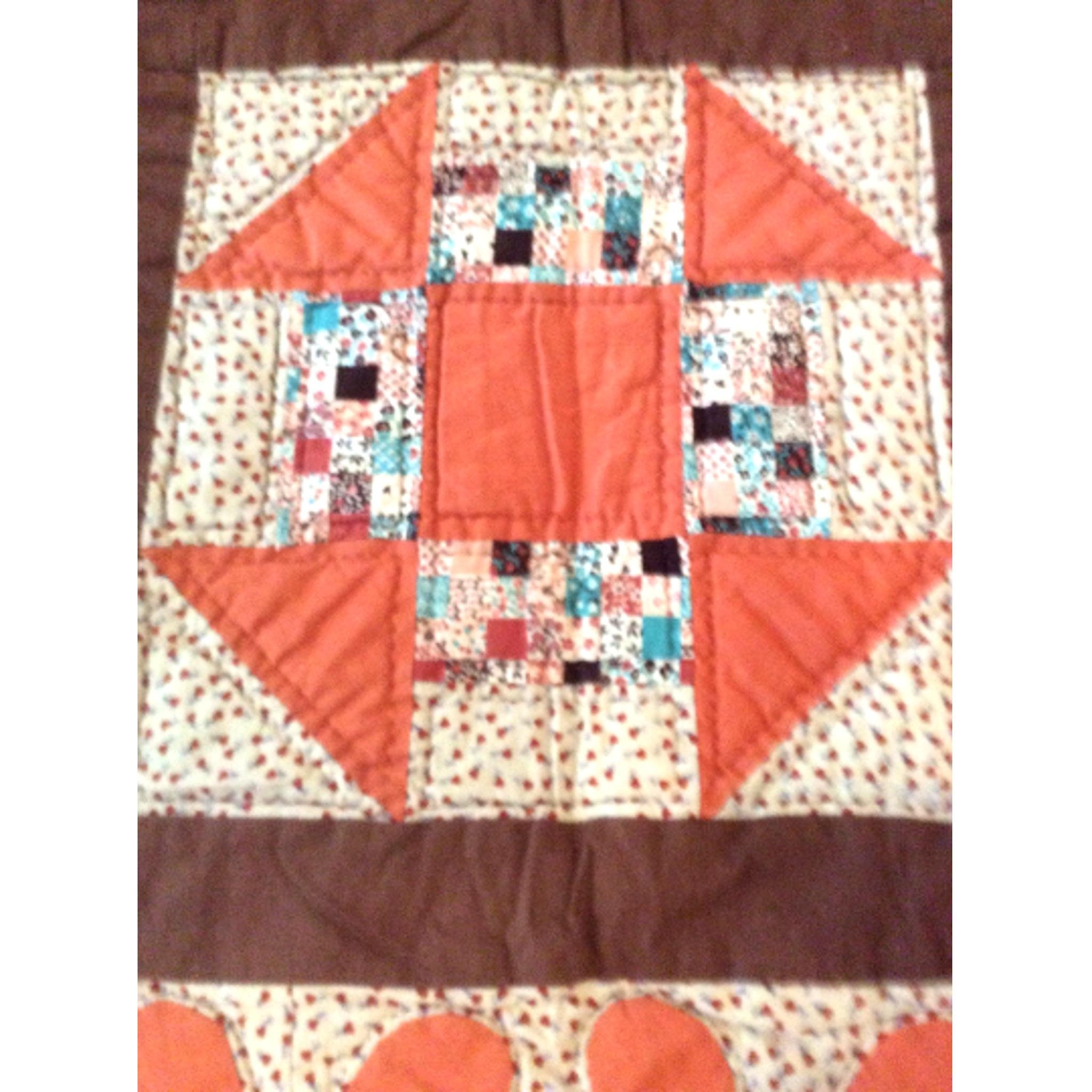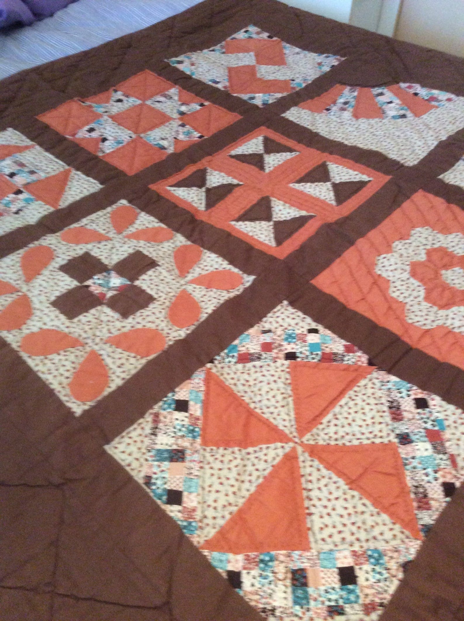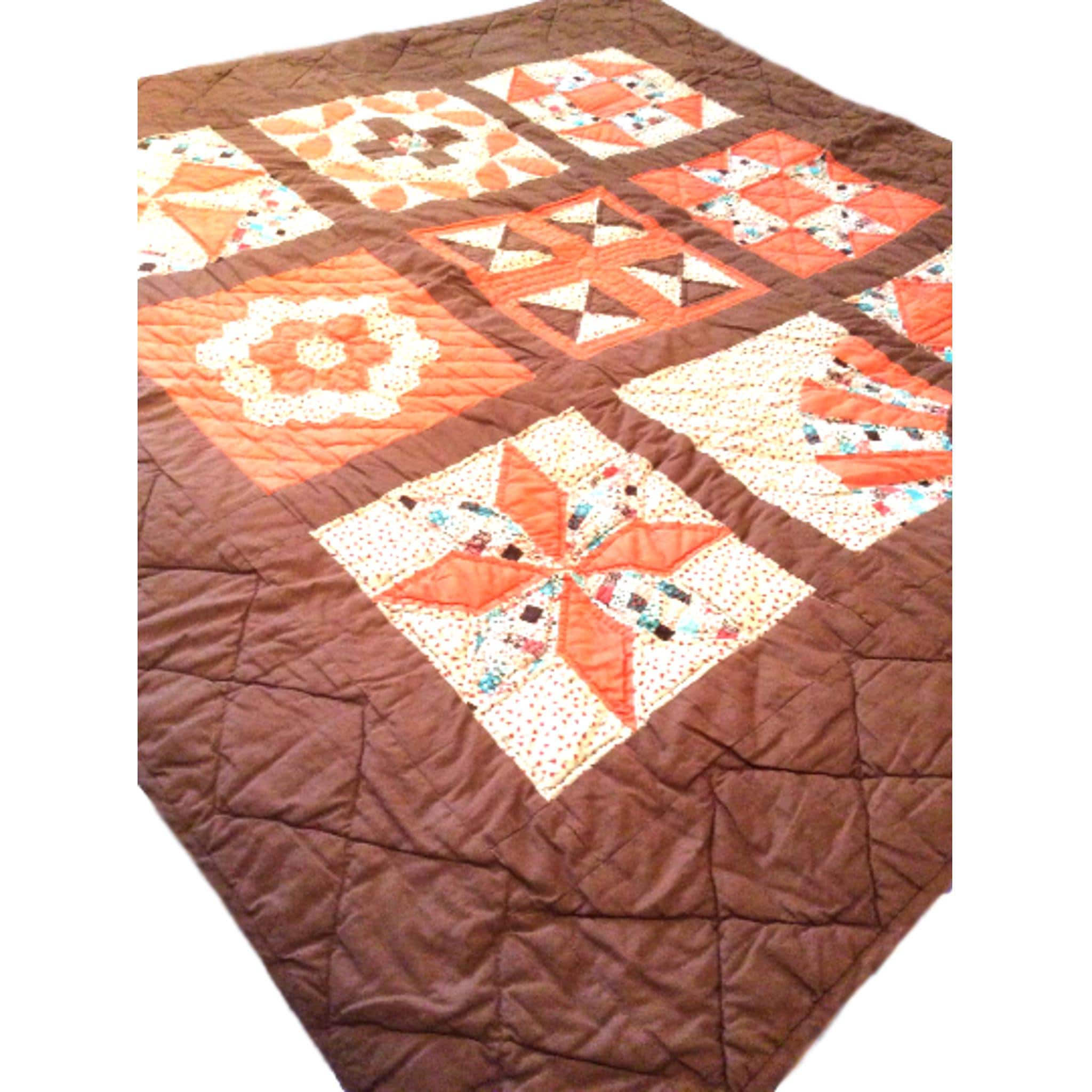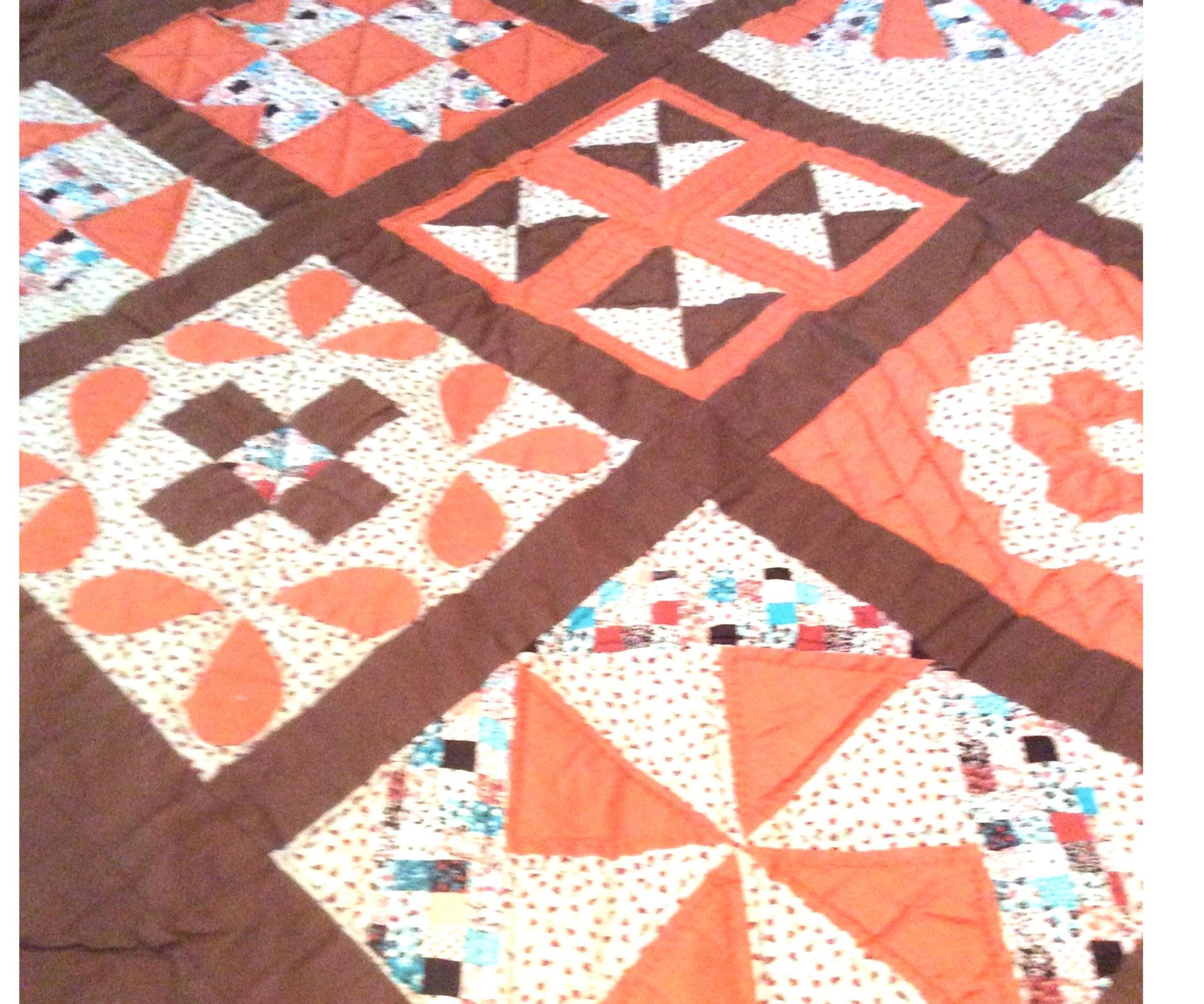This vintage farmhouse style hand made quilt coverlet has (9) nine different blocks all hand stitched. The traditional quilt color is warm brown and orange cotton . Washable on gentle cycle and dry on light heat cycle. This is definitely a quilt for Mom. It was crafted in the 1980s.