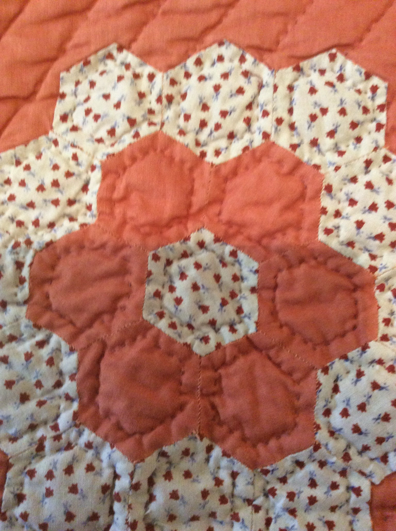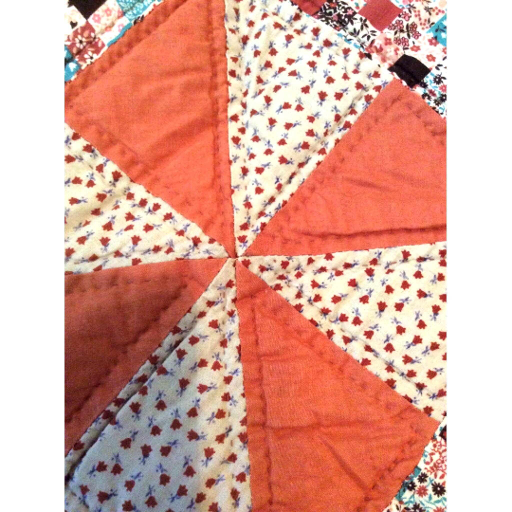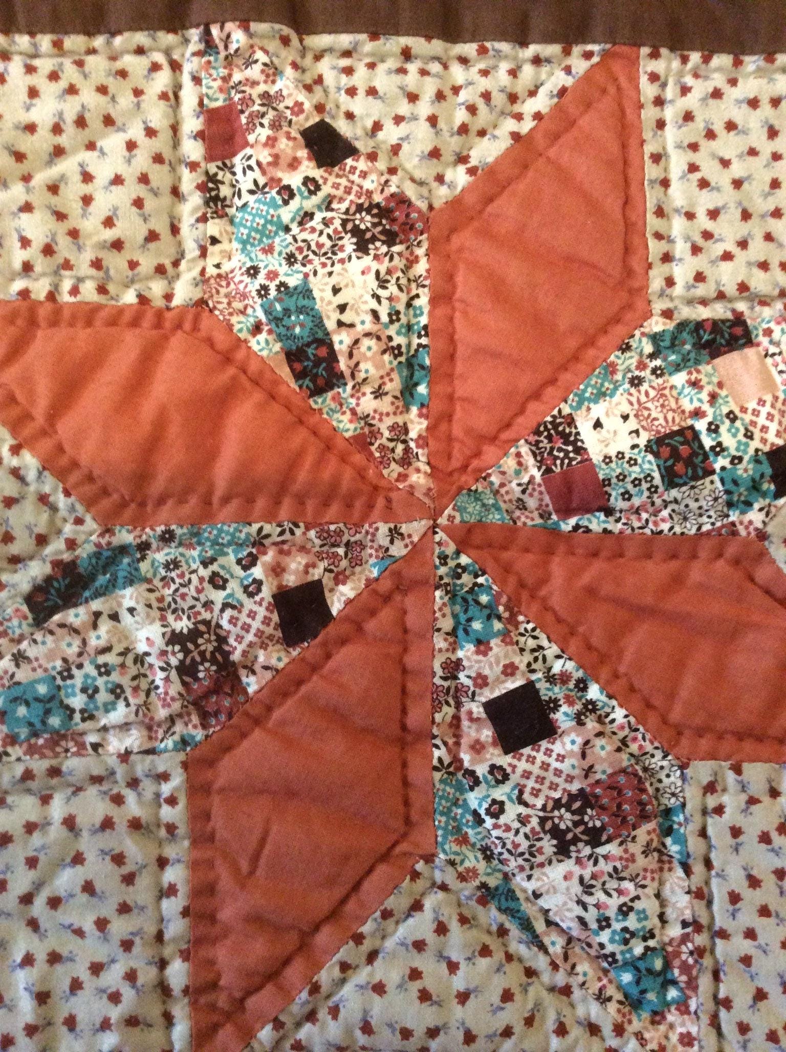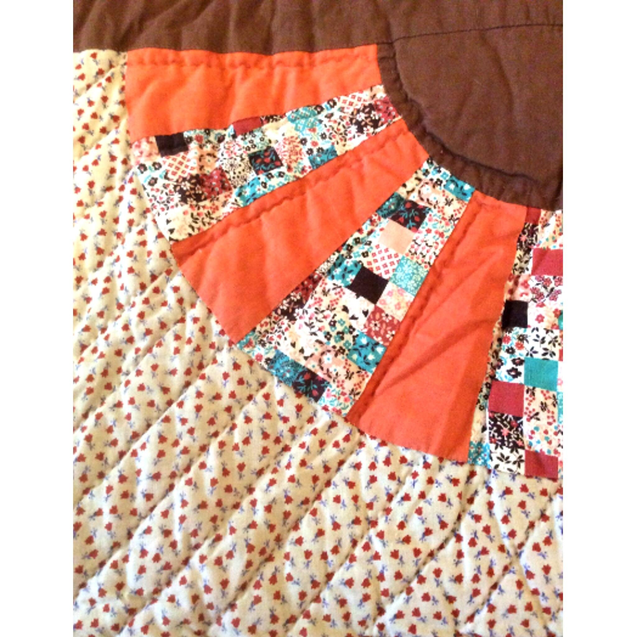 This vintage farmhouse style hand made quilt coverlet has (9) nine different blocks all hand stitched. The traditional quilt color is warm brown and orange cotton . Washable on gentle cycle and dry on light heat cycle. This is definitely a quilt for Mom. It was crafted in the 1980s.