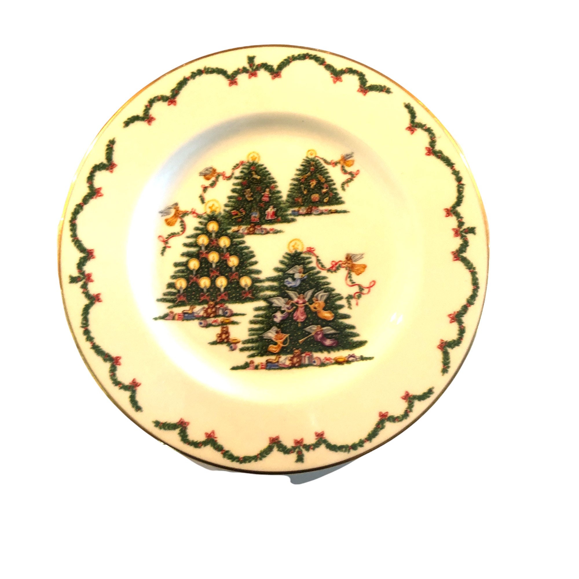 Celebrate the spirit of the season with our Joy Of Christmas Trees Salad Plate, a beautifully crafted festive ceramic dish that adds a touch of holiday charm to your dining table. Perfect for serving salads or as a delightful décor piece, this Xmas tableware essential makes an ideal gift for family and friends, inviting warm memories of joyful gatherings—order yours today and make your holiday moments even more special!presents a Joy of Christmas salad plate that measures 8.25" in diameter. This beautiful plate is decorated with Christmas trees holly garlands and angels. This new plate is no longer in production.