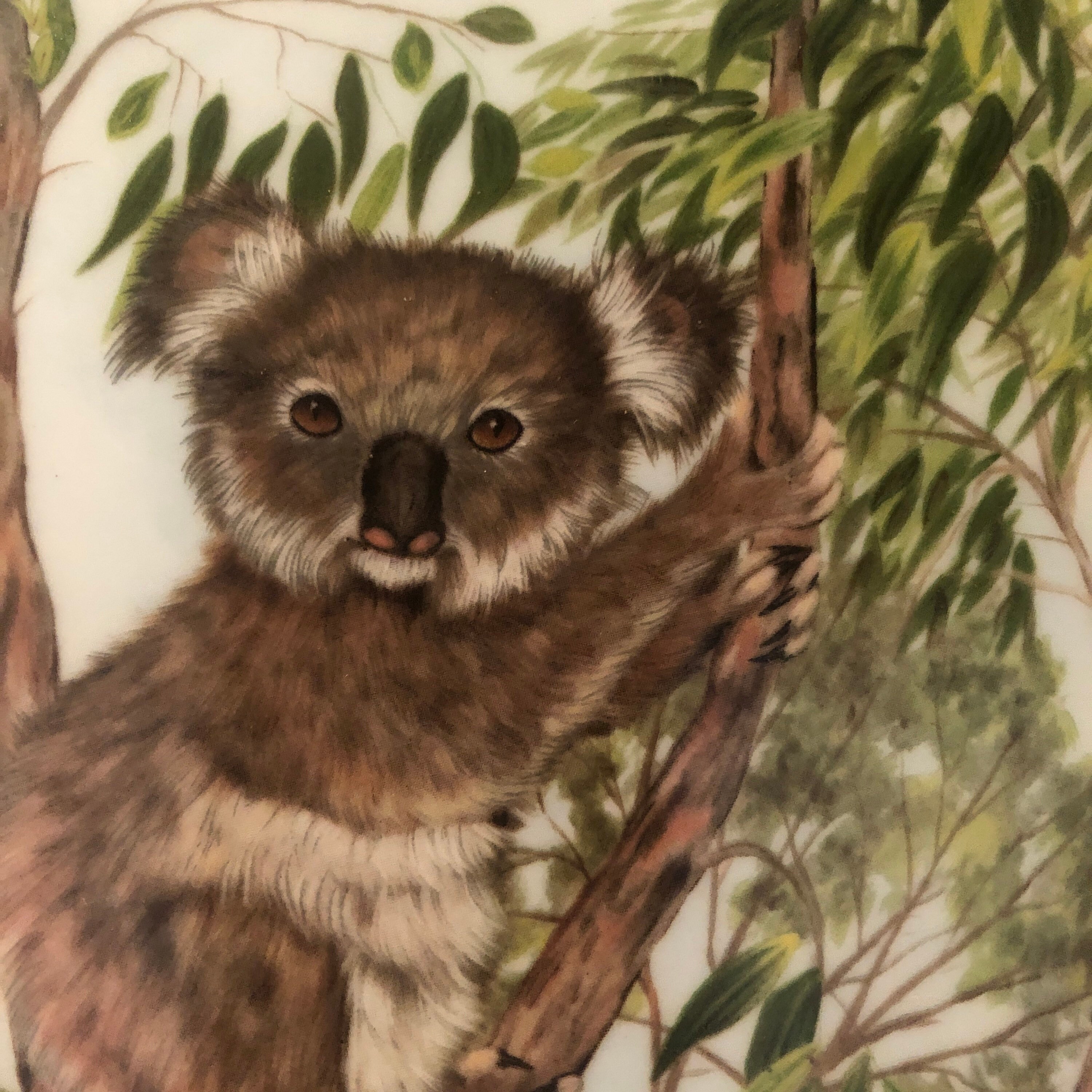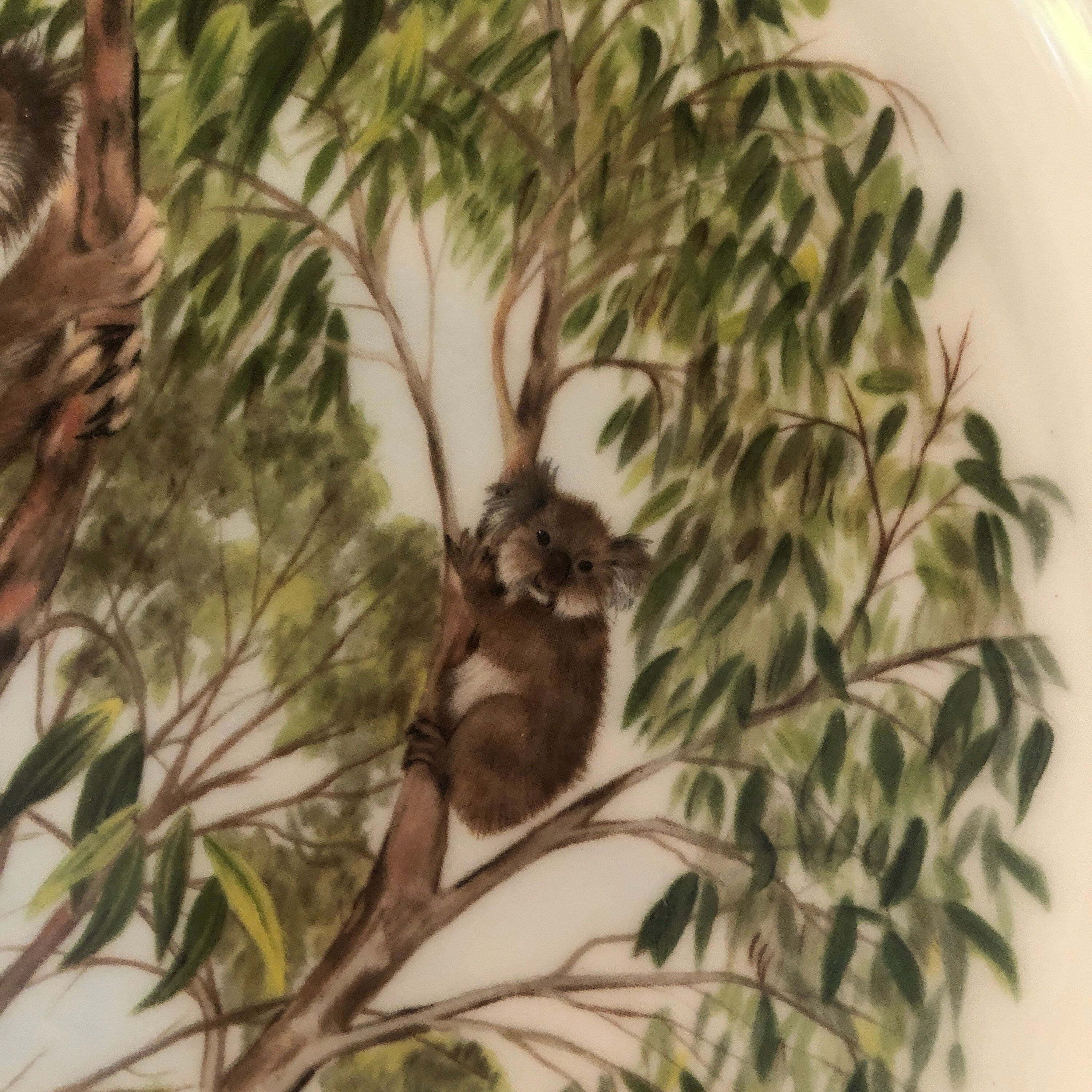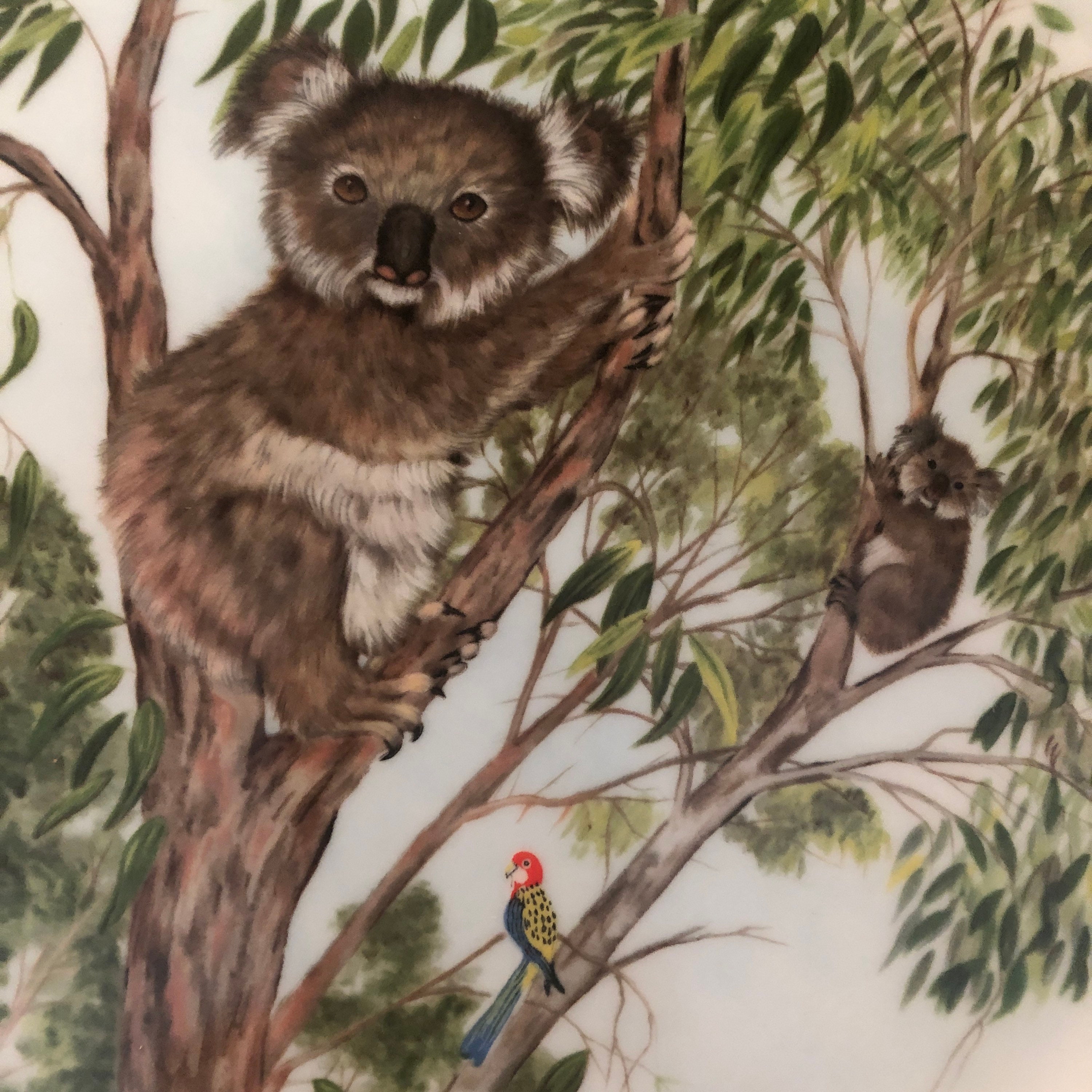 The nature wall plate comes as a boxed gift. From the upper canopy of a red gum eucalyptus tree, a young koala peers innocently at this Australian world.