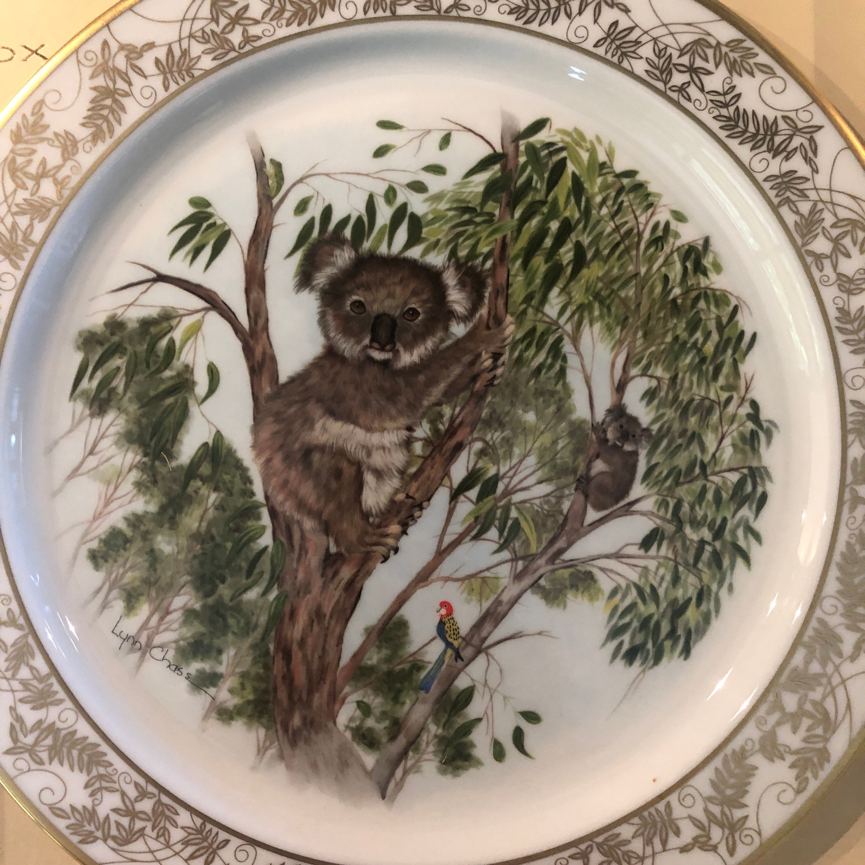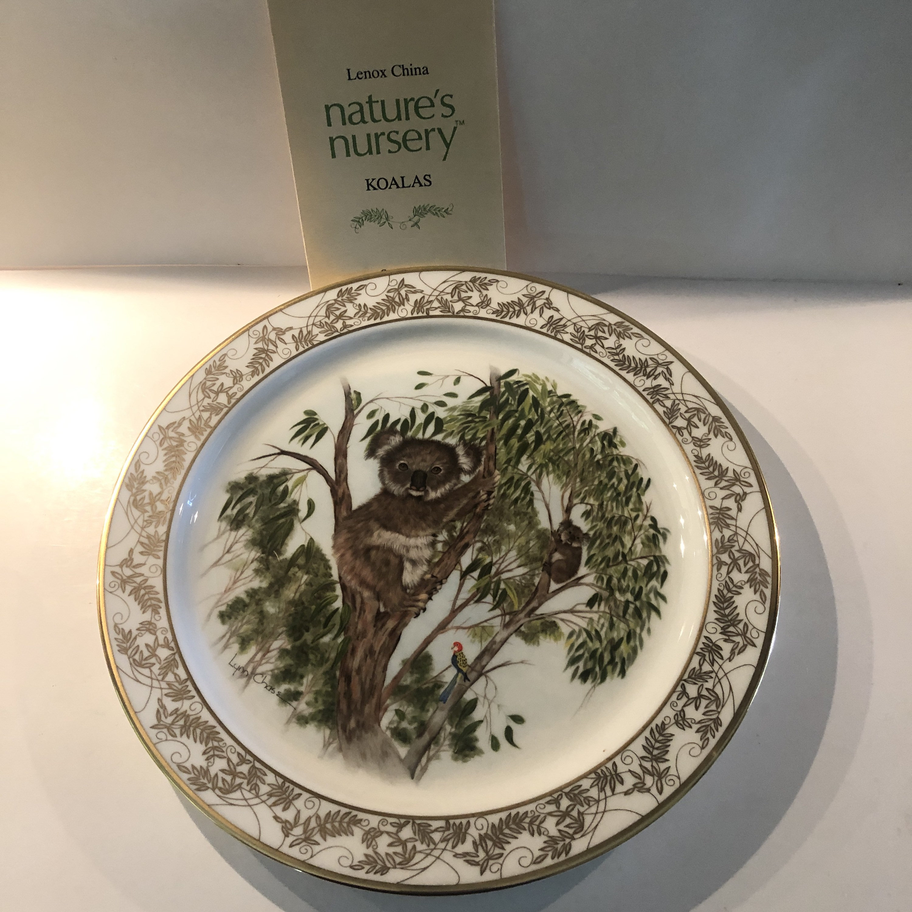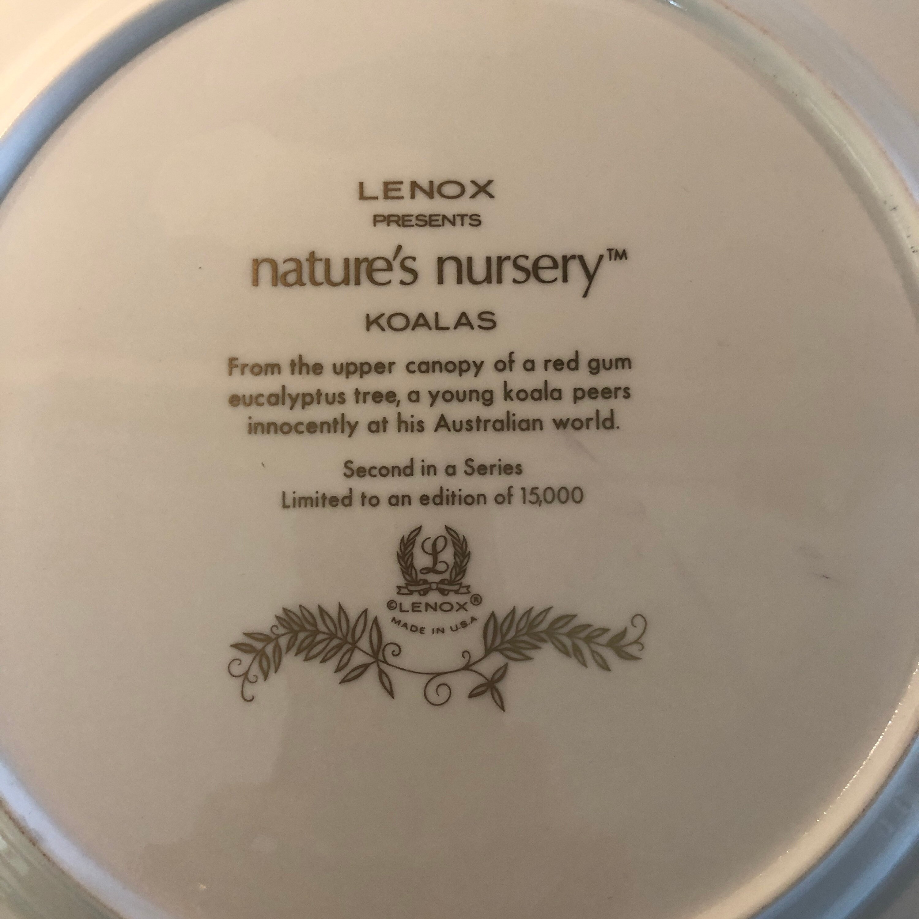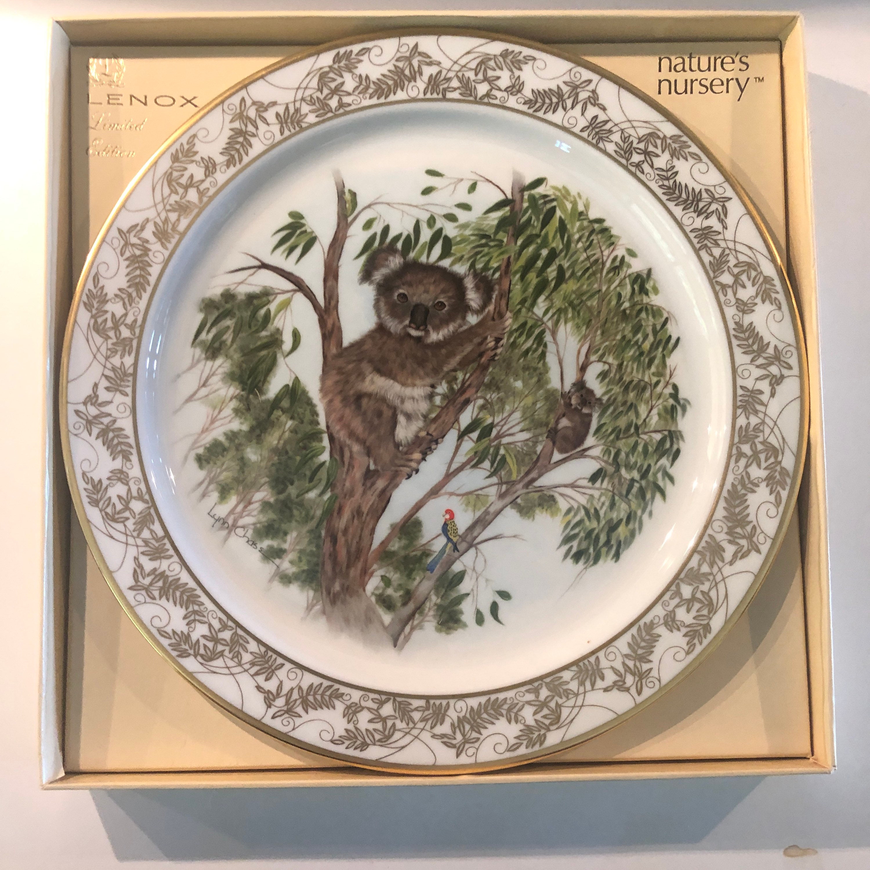 This Lenox wall hanging plate features a koala bear. The wall art plate is from the 1980s. The limited-edition plate is titled Nature's Nursery. It measures 10.5 inches in diameter. Perfect, unused condition. Designed by Lynn Chase. 24K gold trim.