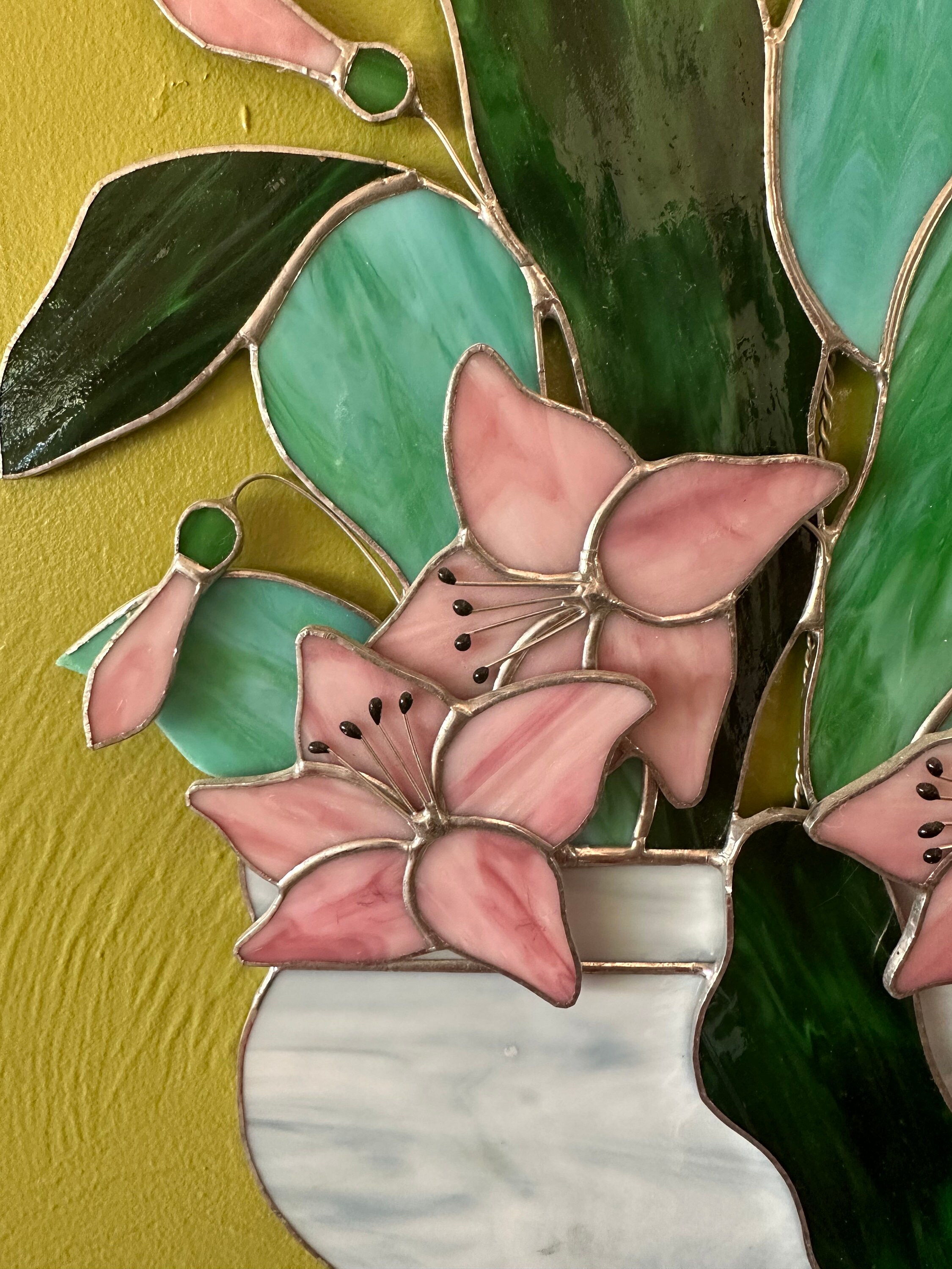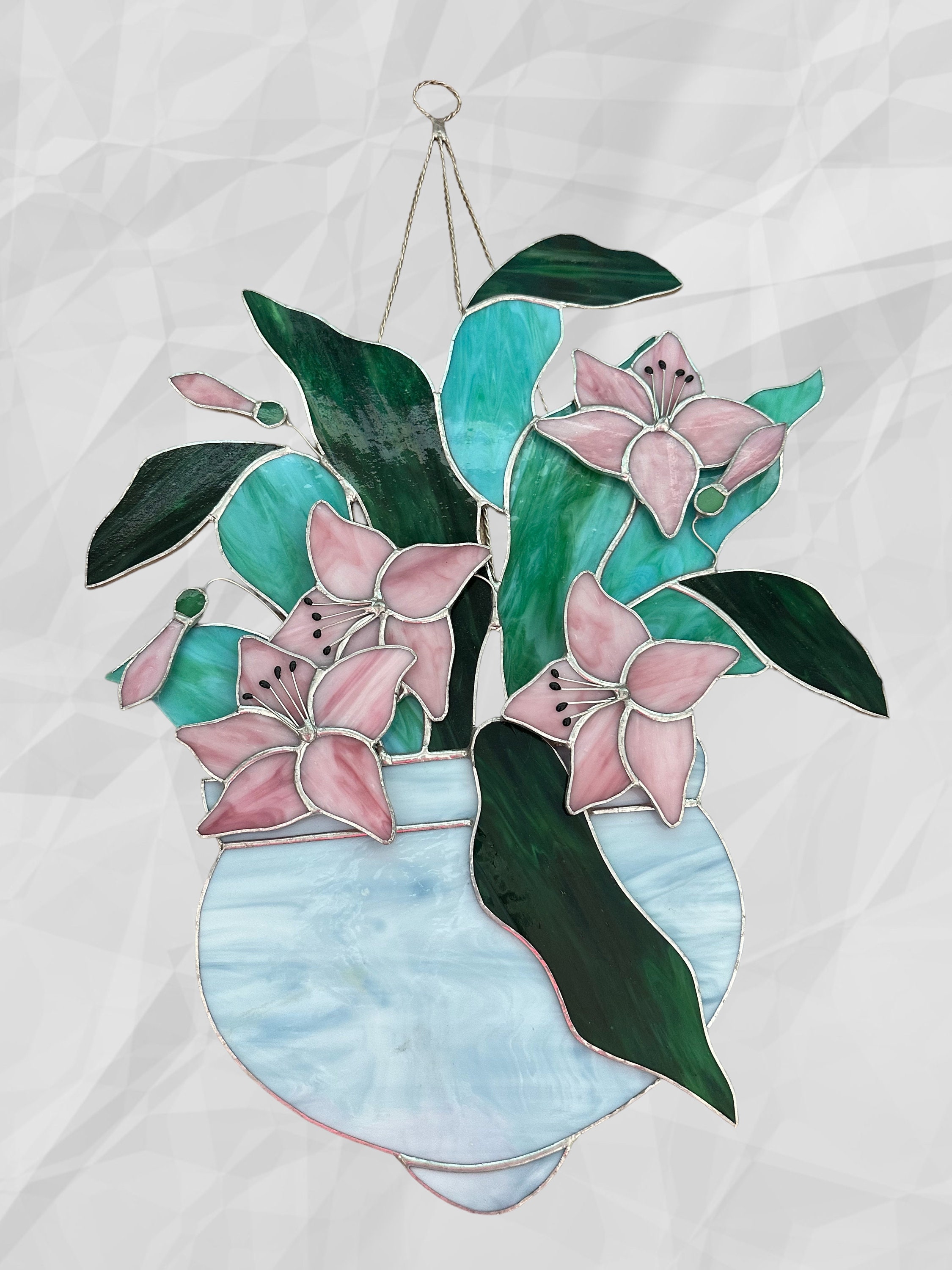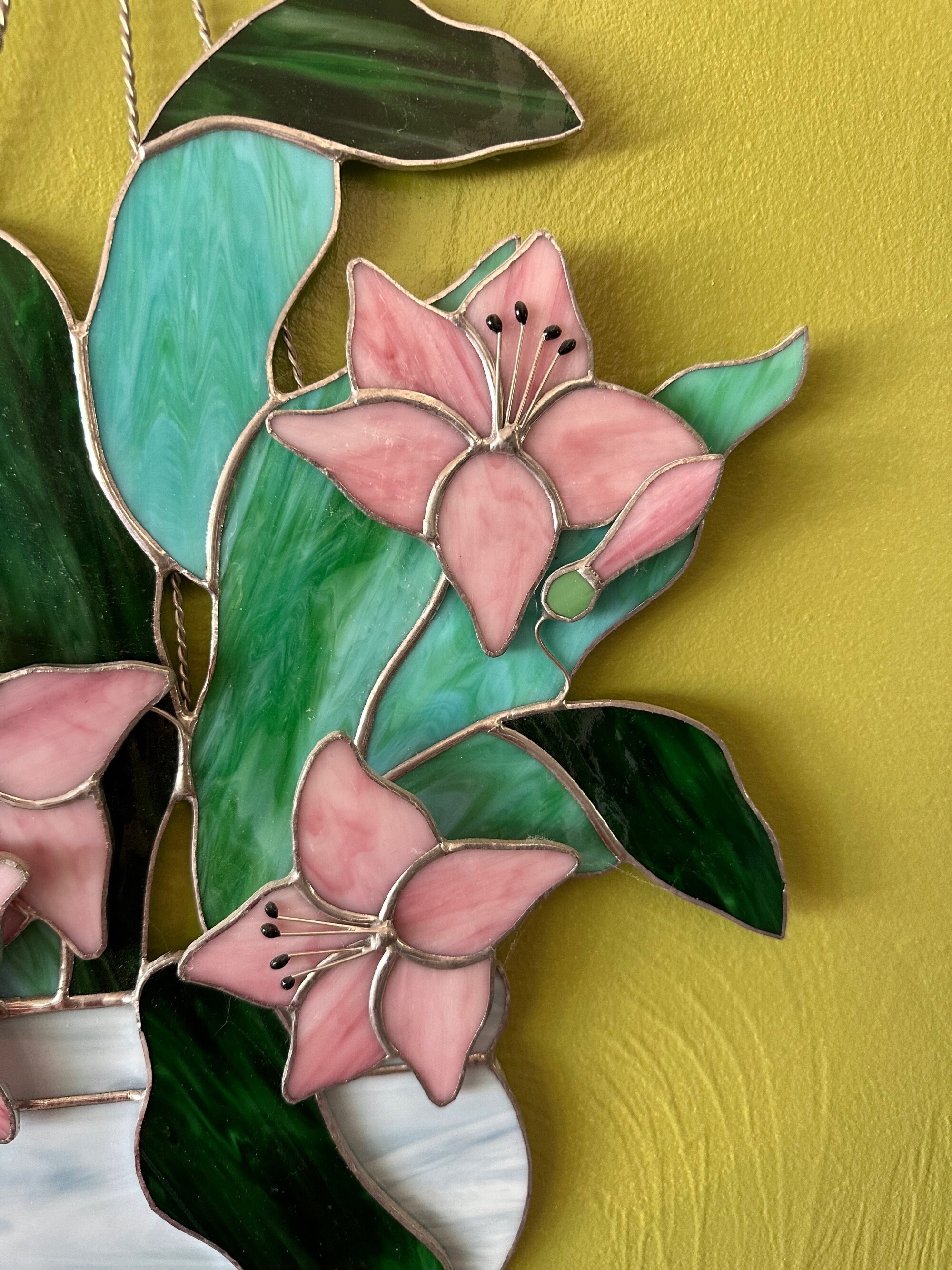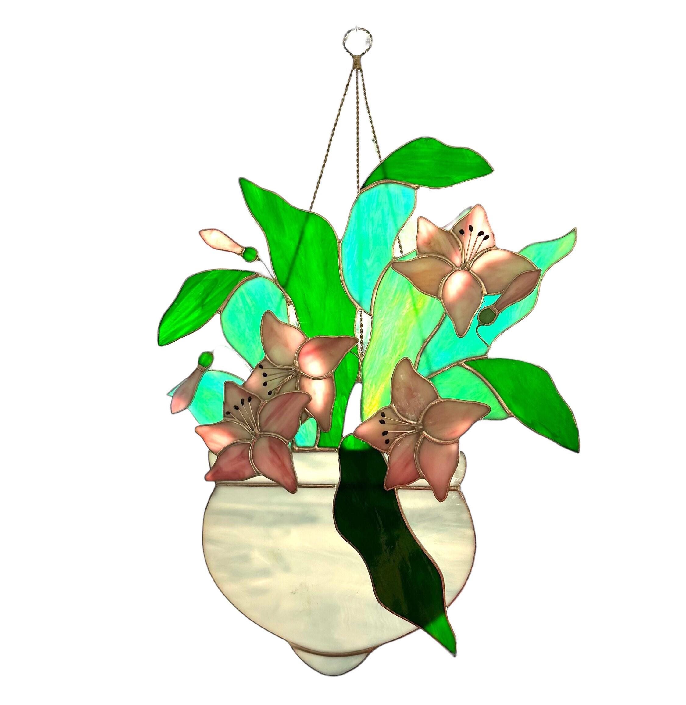 Floral Stained Glass Window Hanging: Pink Lilies Sun Catcher