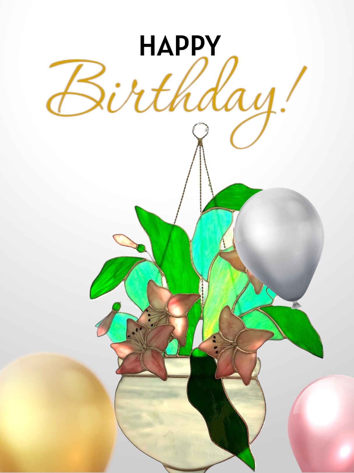 Here are beautiful pink lilies and green leaves arranged in a white basket large stained glass window hanging sun catcher. This stunning leaded glass ornament is the perfect birthday gift! It measures 20" x 8". It is in excellent condition.