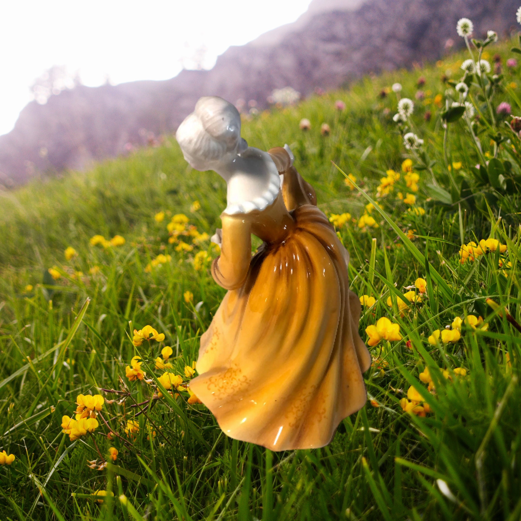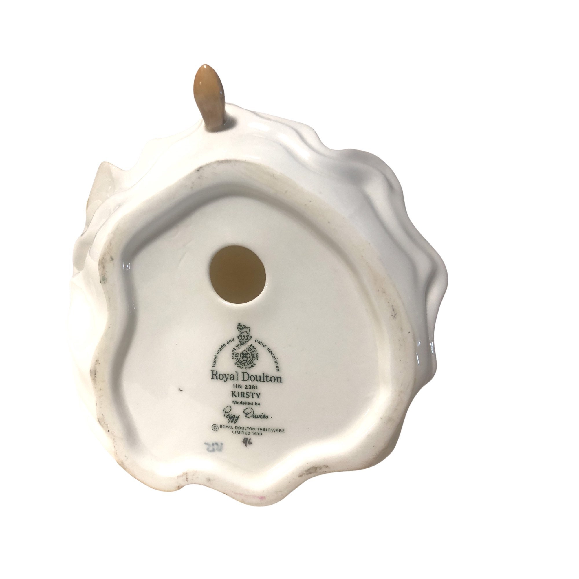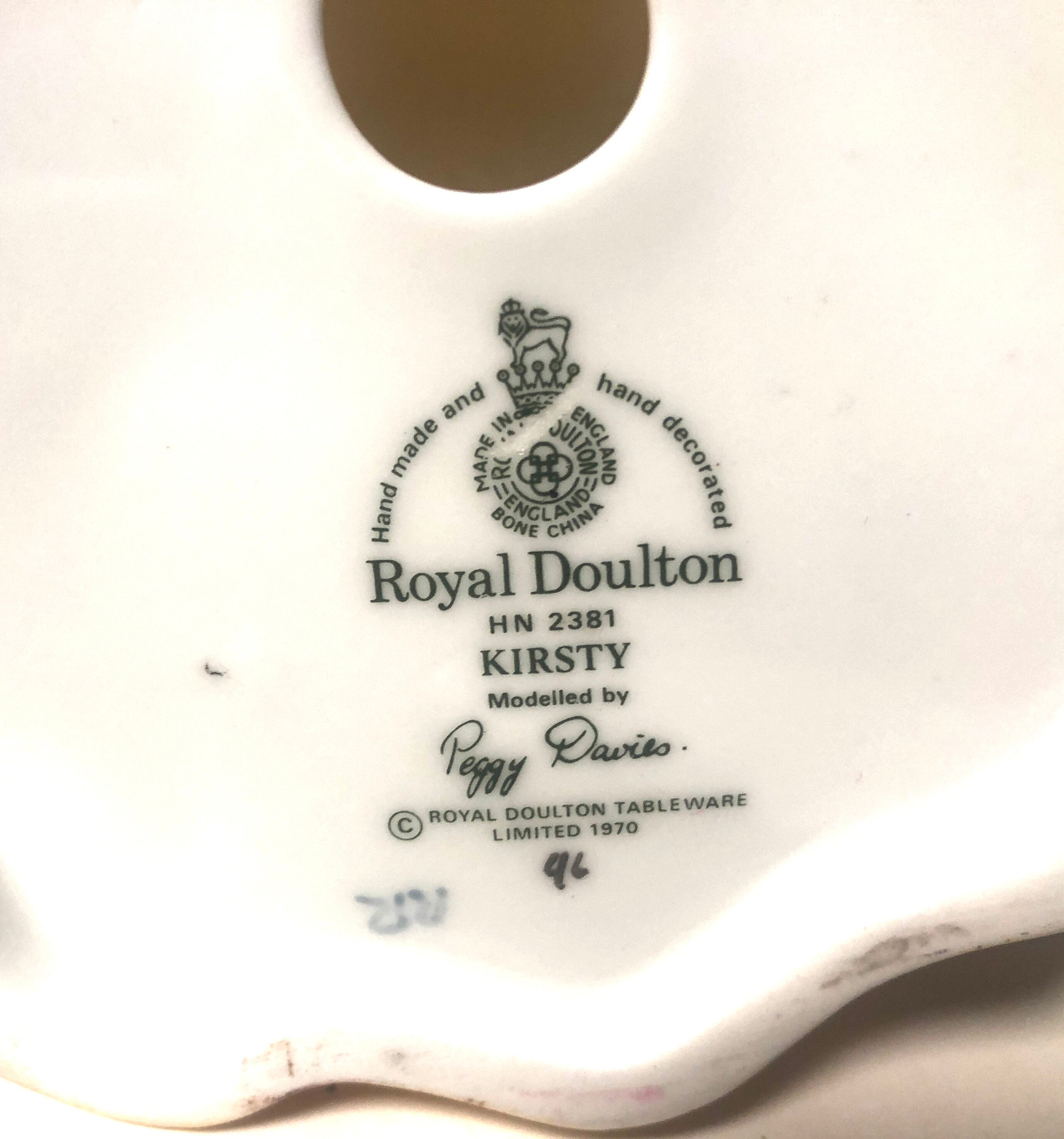 This is a hand painted, and hand decorated Royal Doulton English porcelain figurine of a woman called Kirsty HN2381. This figure is designed by Peggy Davies. She is a limited edition from 1970. It is number HN-2381 There is no box for this fine bone china female figurine.