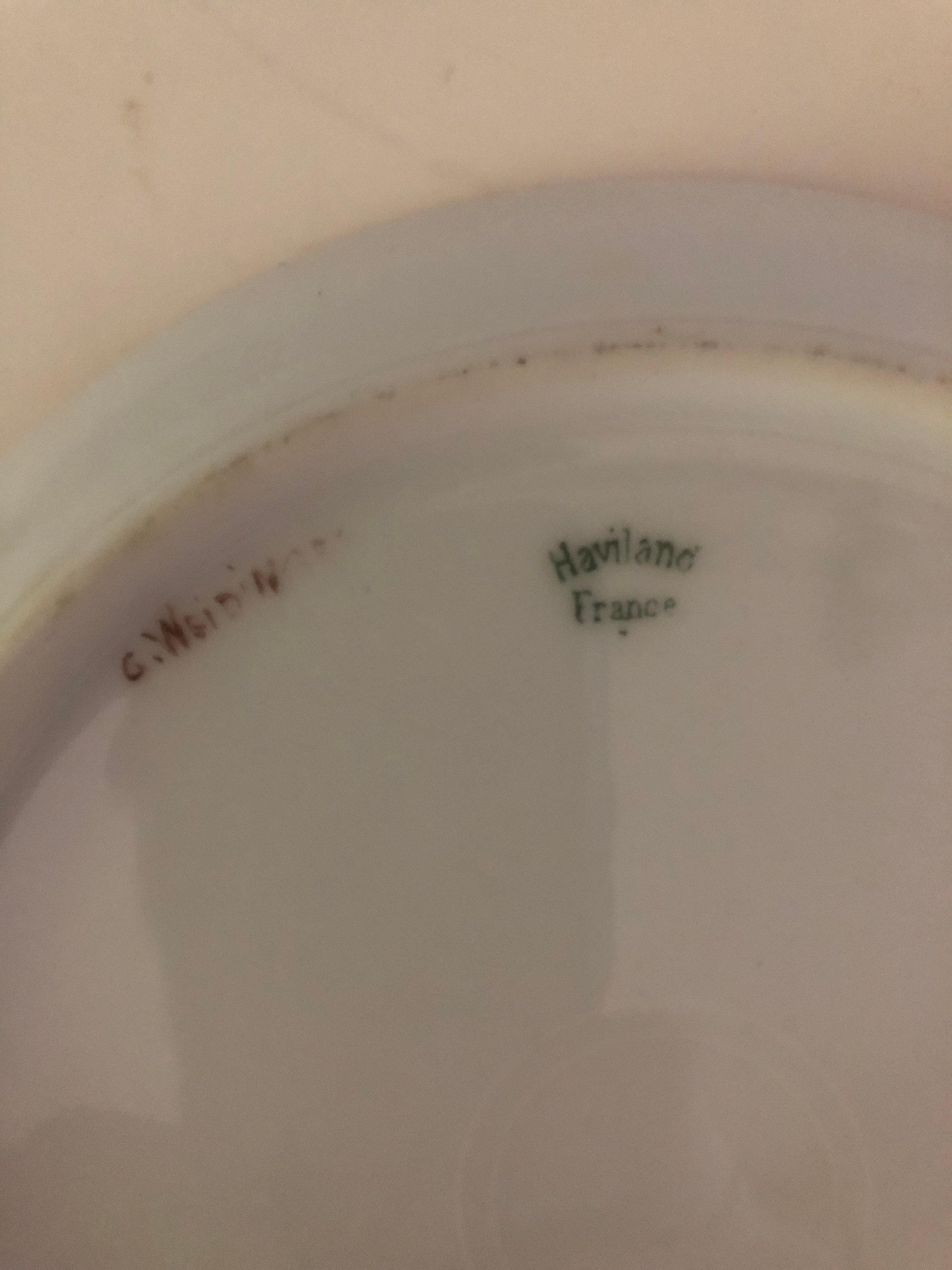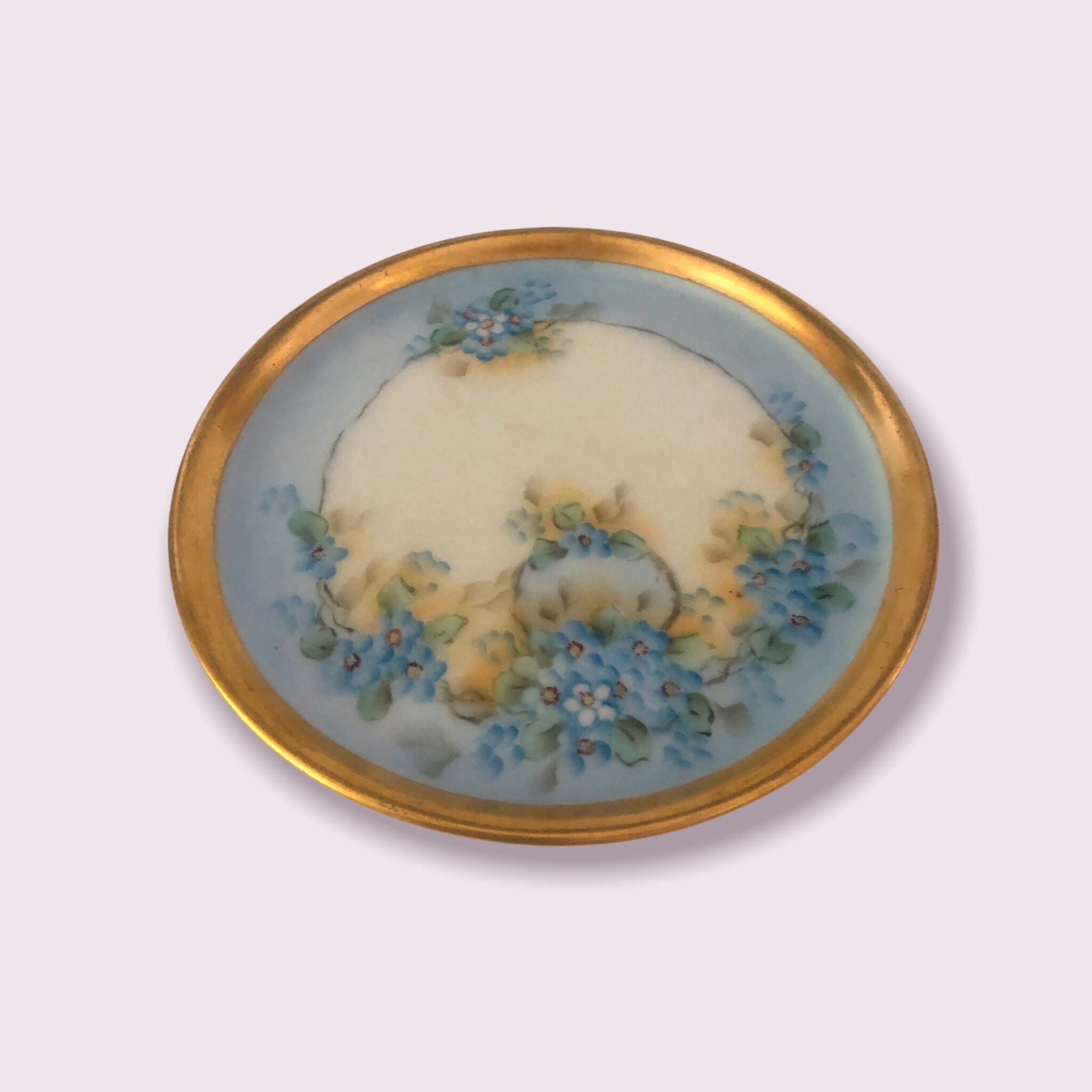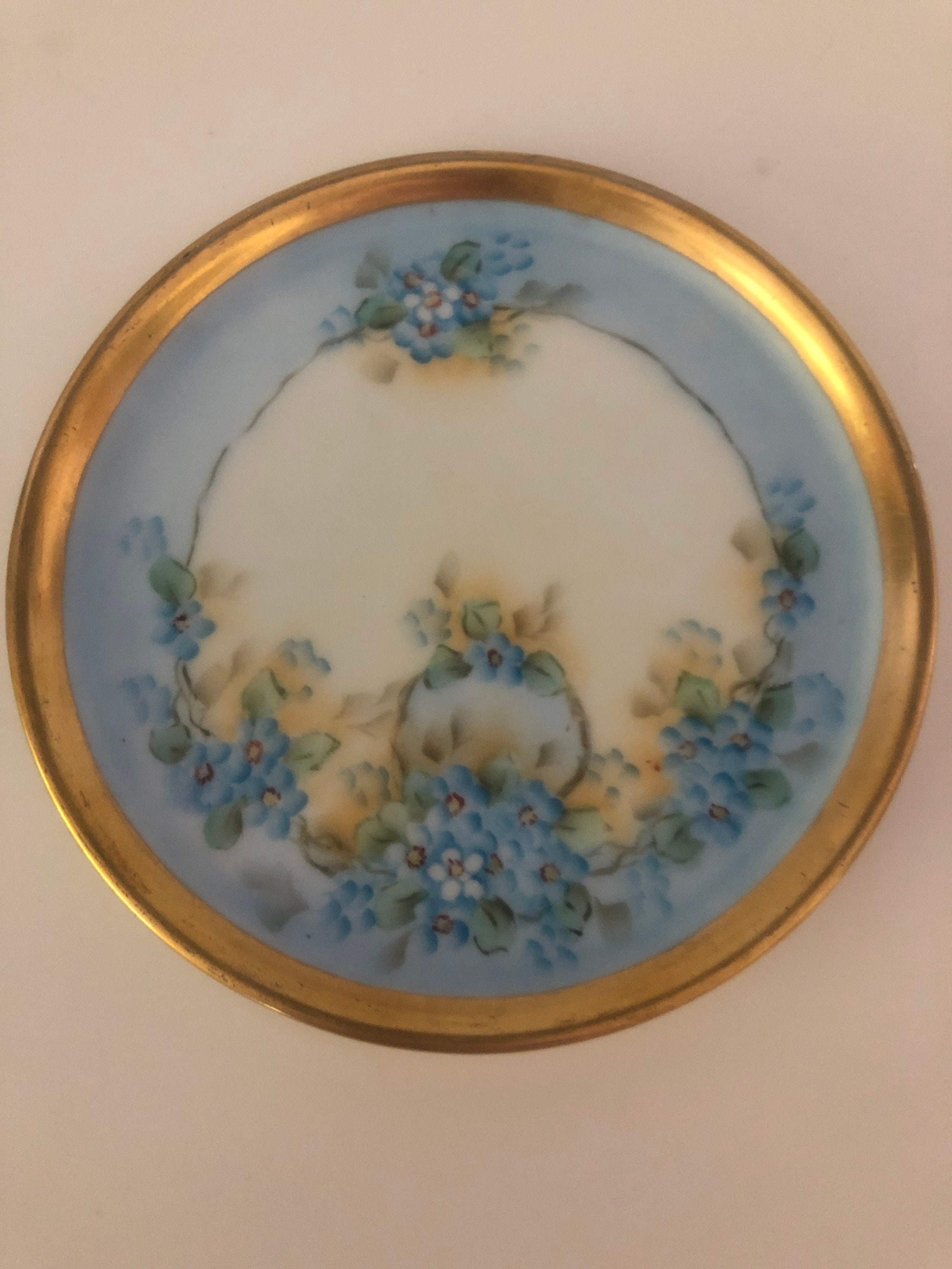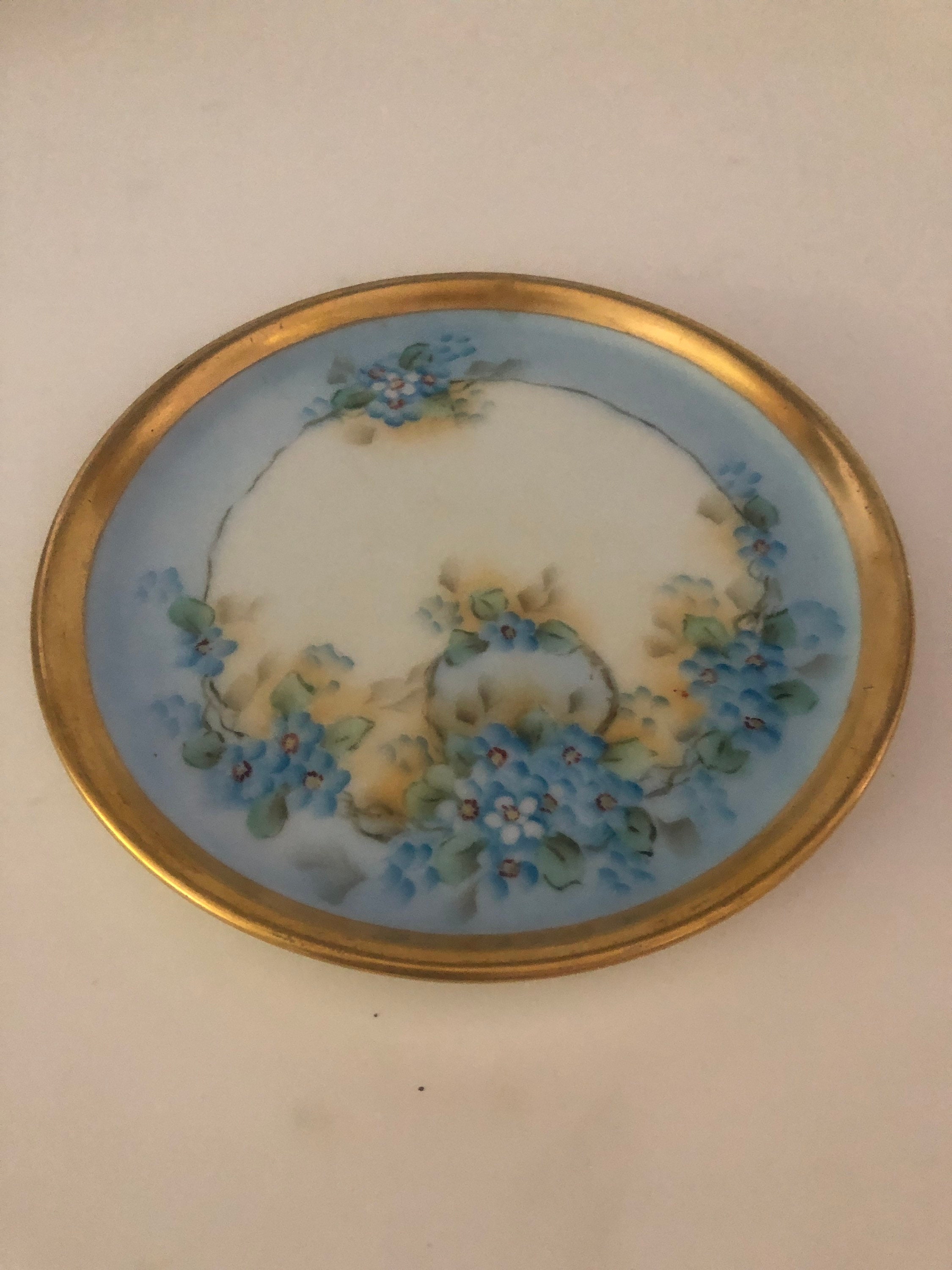 This is a heavy porcelain vintage round vanity decorative tray dish for the dresser. It is hand painted and edged in 24K gold paint. Very light surface scratches when tilted to the light. No chips, cracks or crazing. Use as a catch all tray. Signed by the artist on the back of the plate. It measures 6.5" in diameter. Haviland France