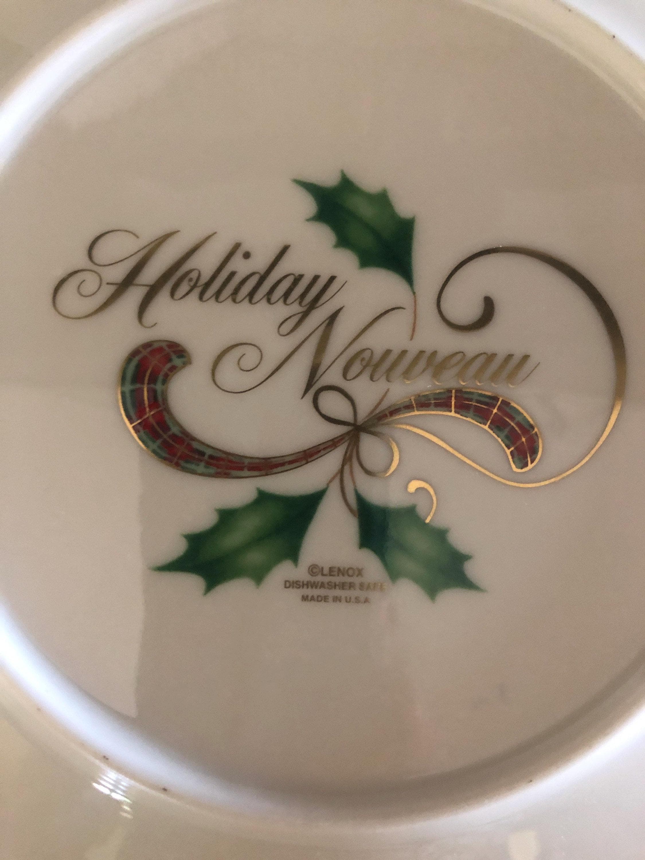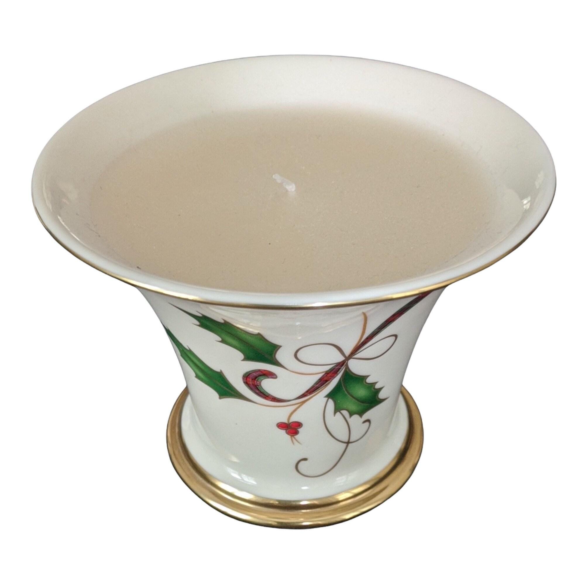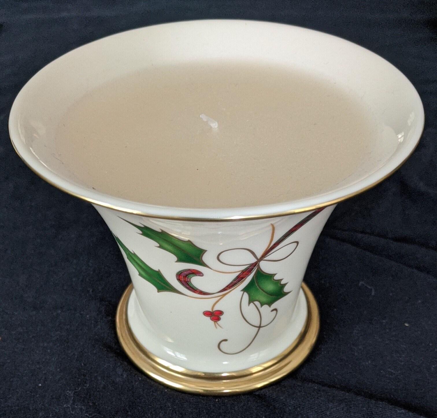This is the vintage Lenox Christmas candle holder with gold trim. This elegant holiday Nouveau holiday china piece measures 3-1/2" tall and 4-5/8" wide. It has a plaid ribbon and green holly design. This is new condition. It would look great on your holiday table.