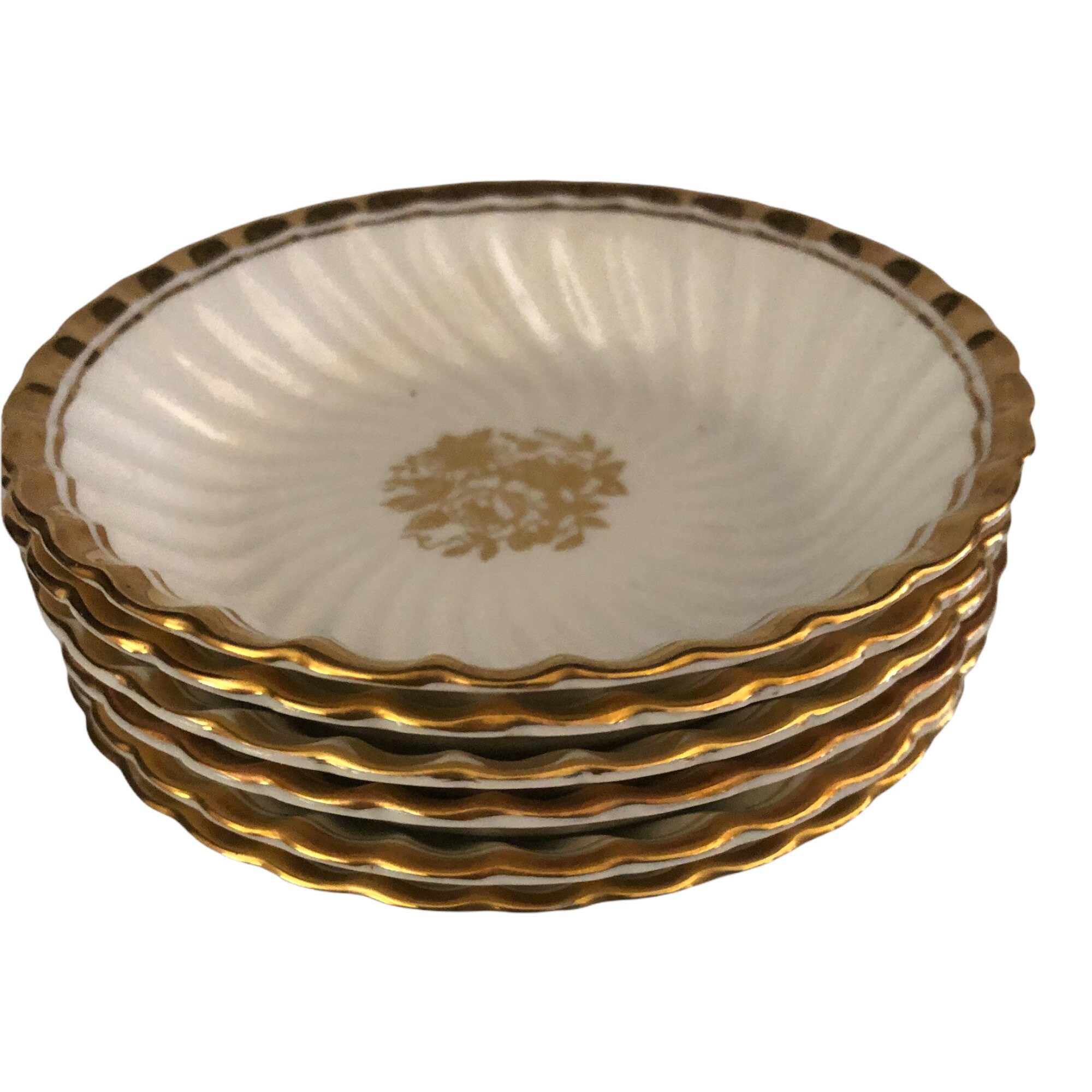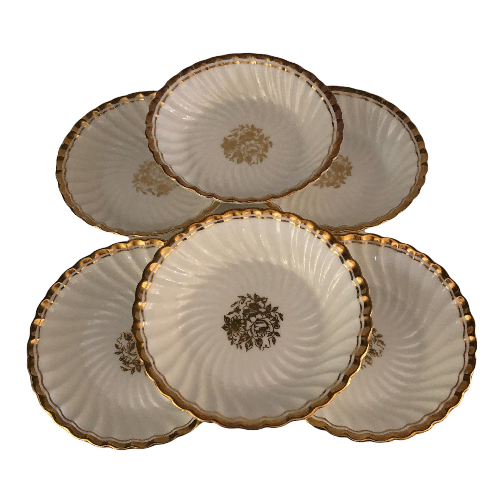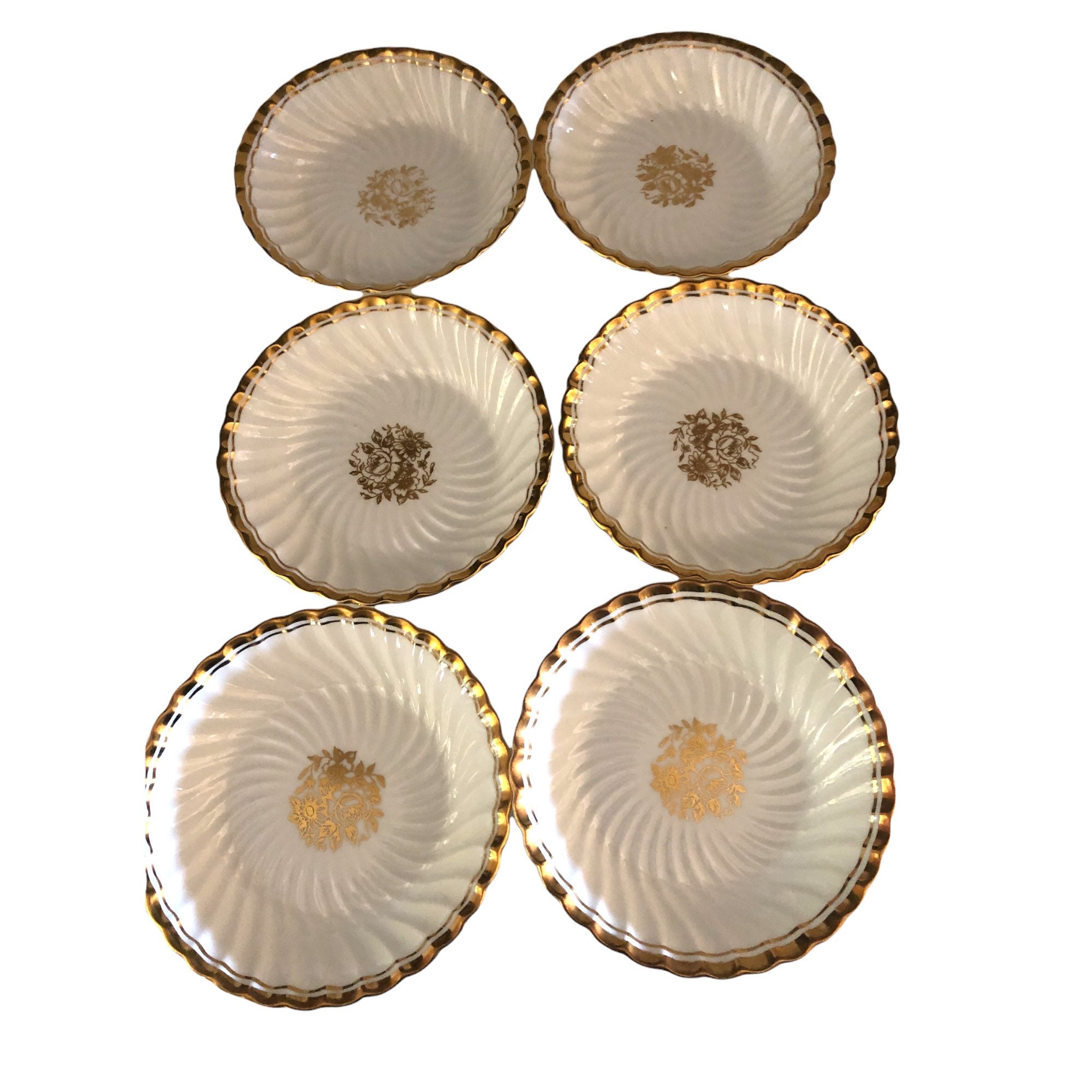 Here is a perfect set of (6) Aynsley china six dessert bowls in fine bone china. They are white with a gold floral center and gold rim. These stunning bowls were made in England. The is the Elegance pattern, C665. No chips, cracks or crazing. Use to celebrate special occasions such as a wedding!