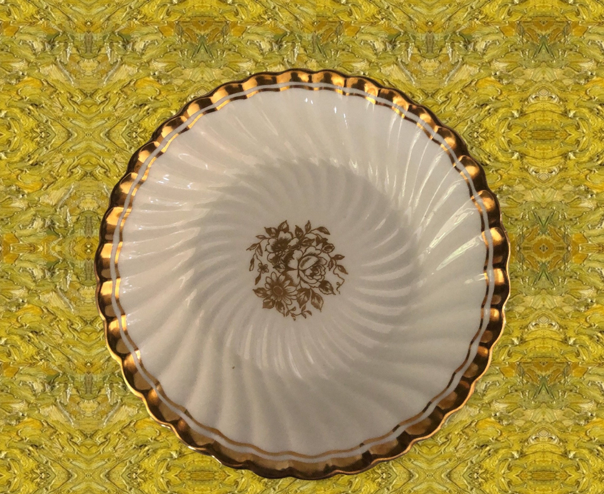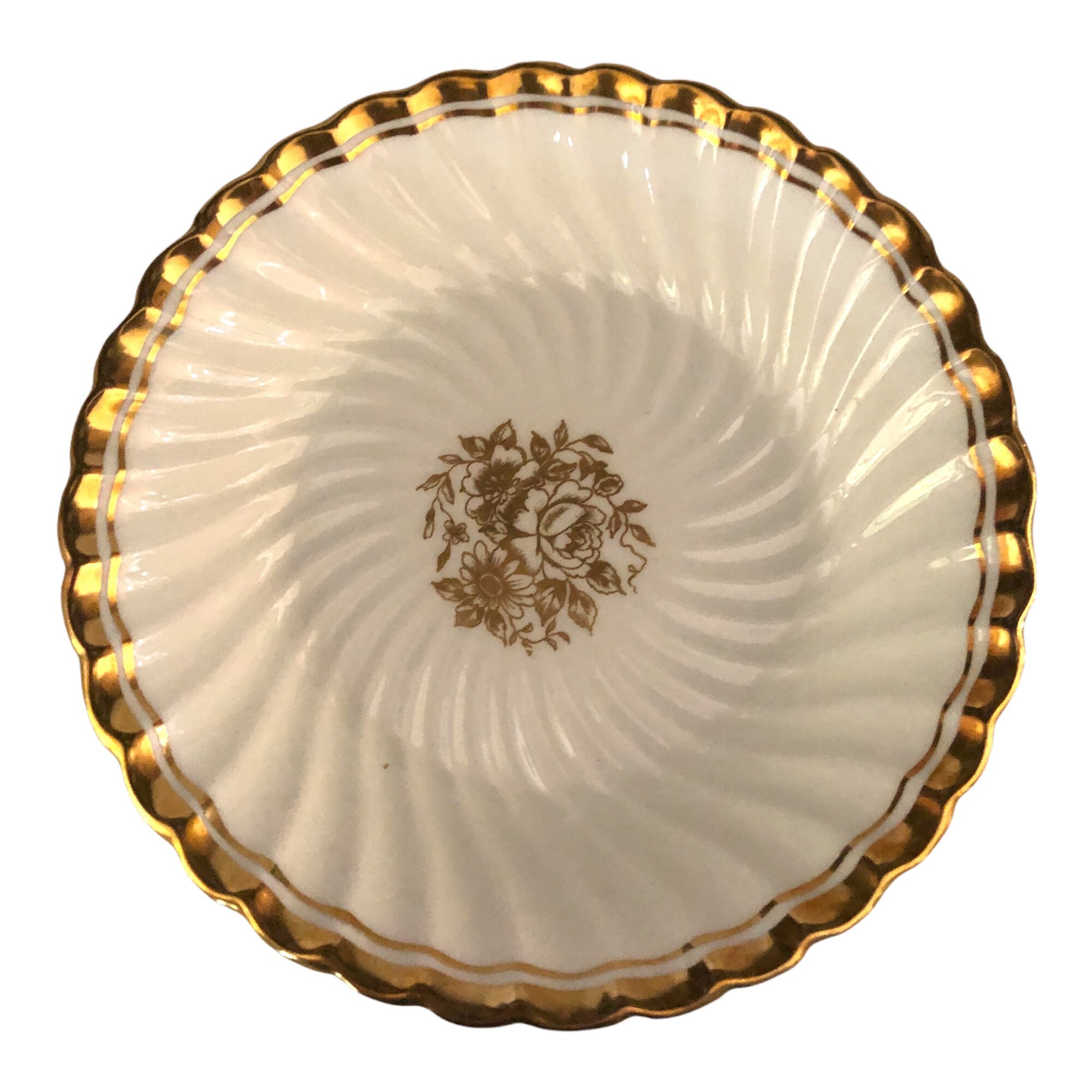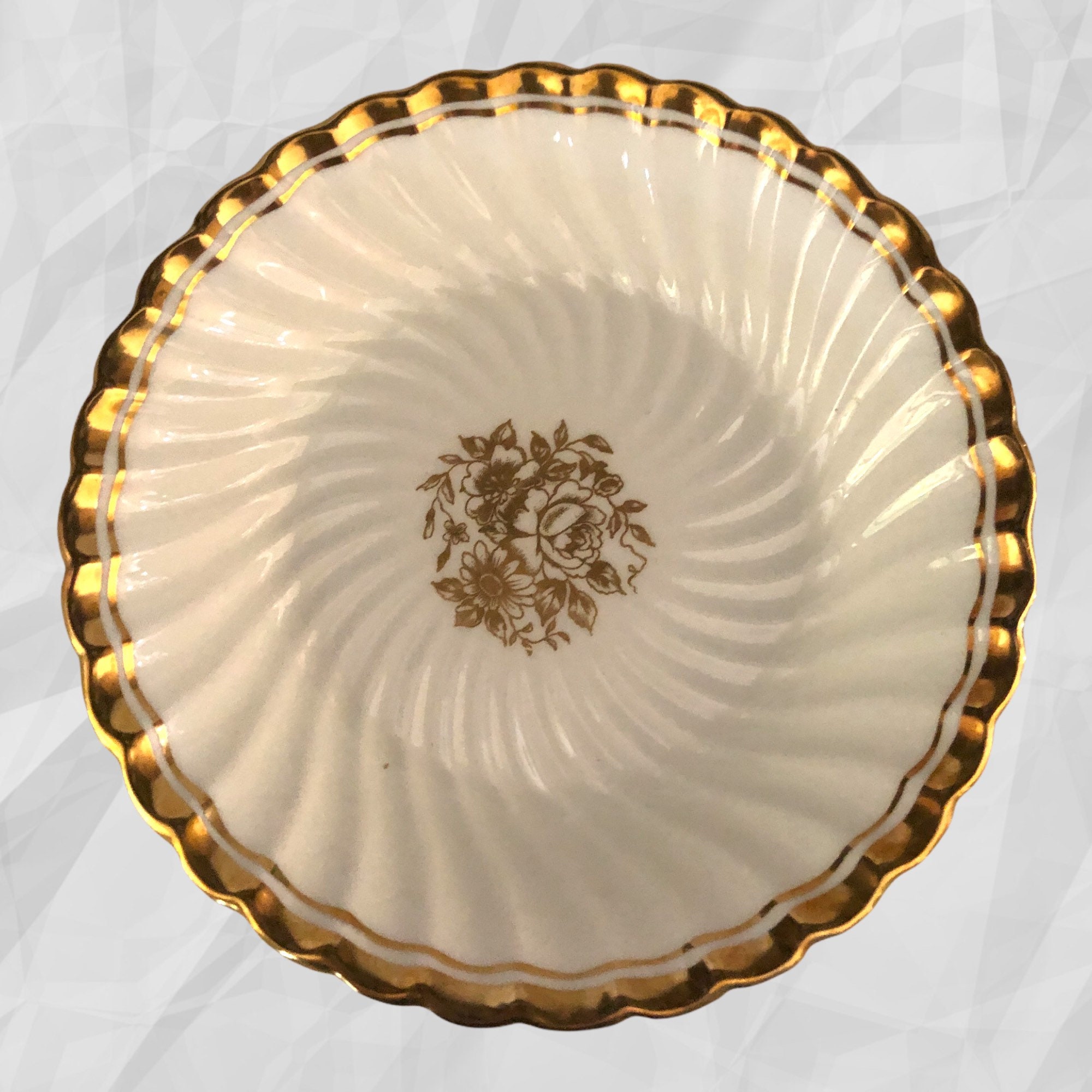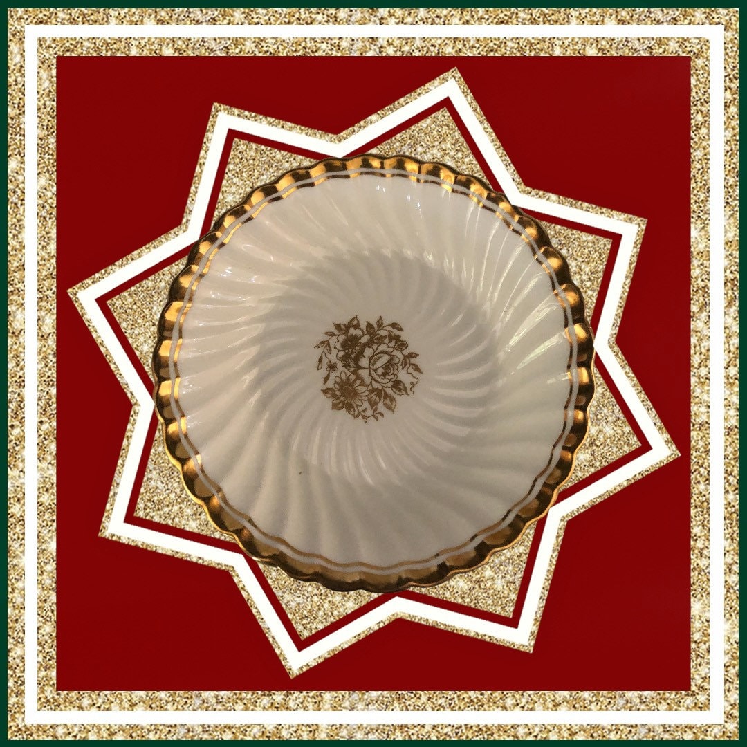 Here is a perfect set of (6) Aynsley china six dessert bowls in fine bone china. They are white with a gold floral center and gold rim. These stunning bowls were made in England. The is the Elegance pattern, C665. No chips, cracks or crazing. Use to celebrate special occasions such as a wedding!