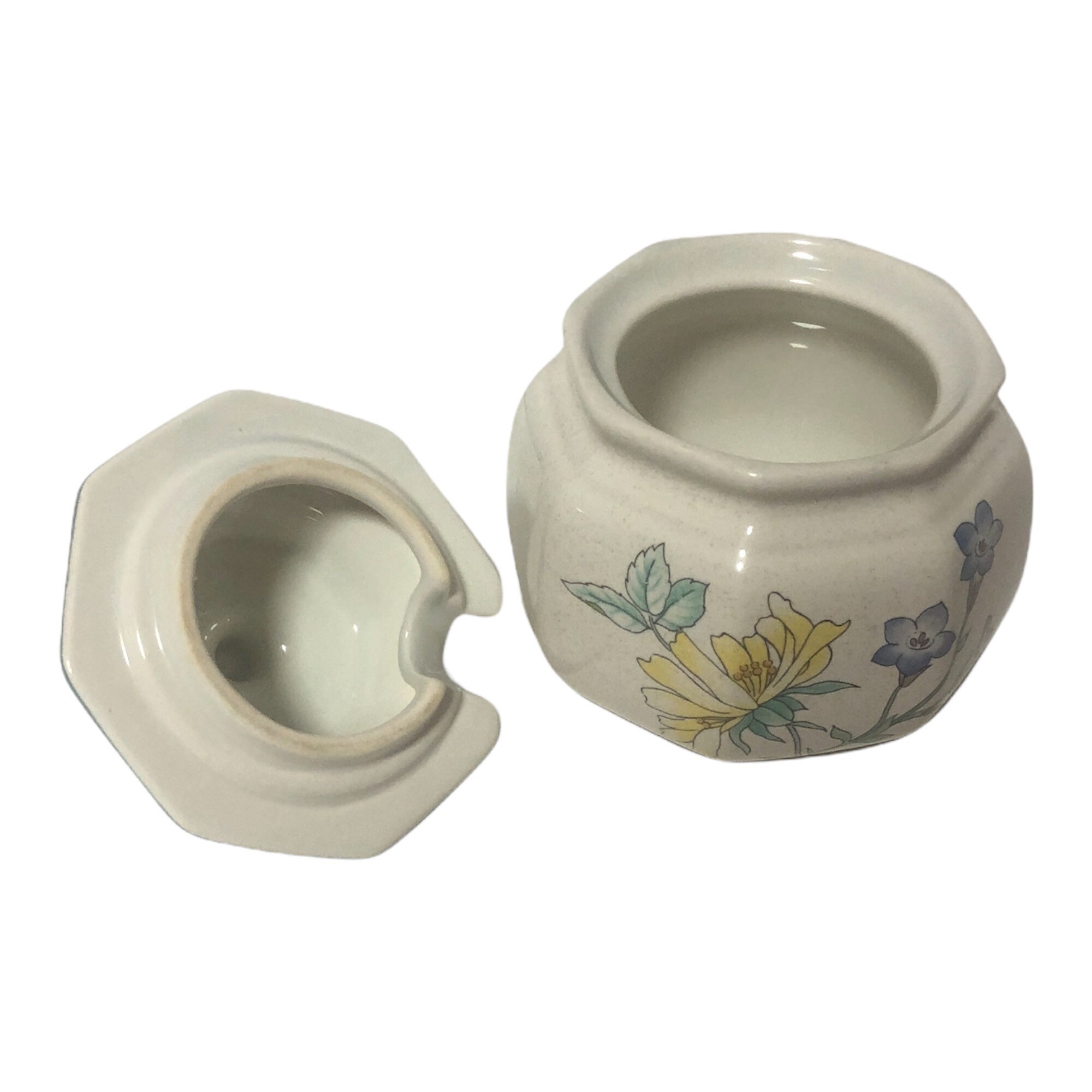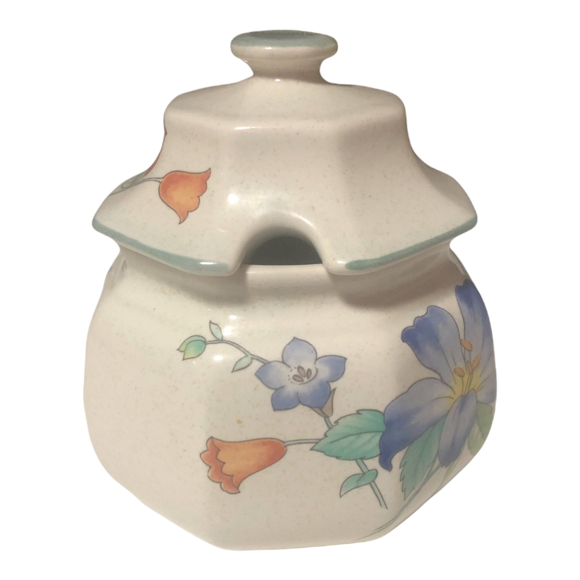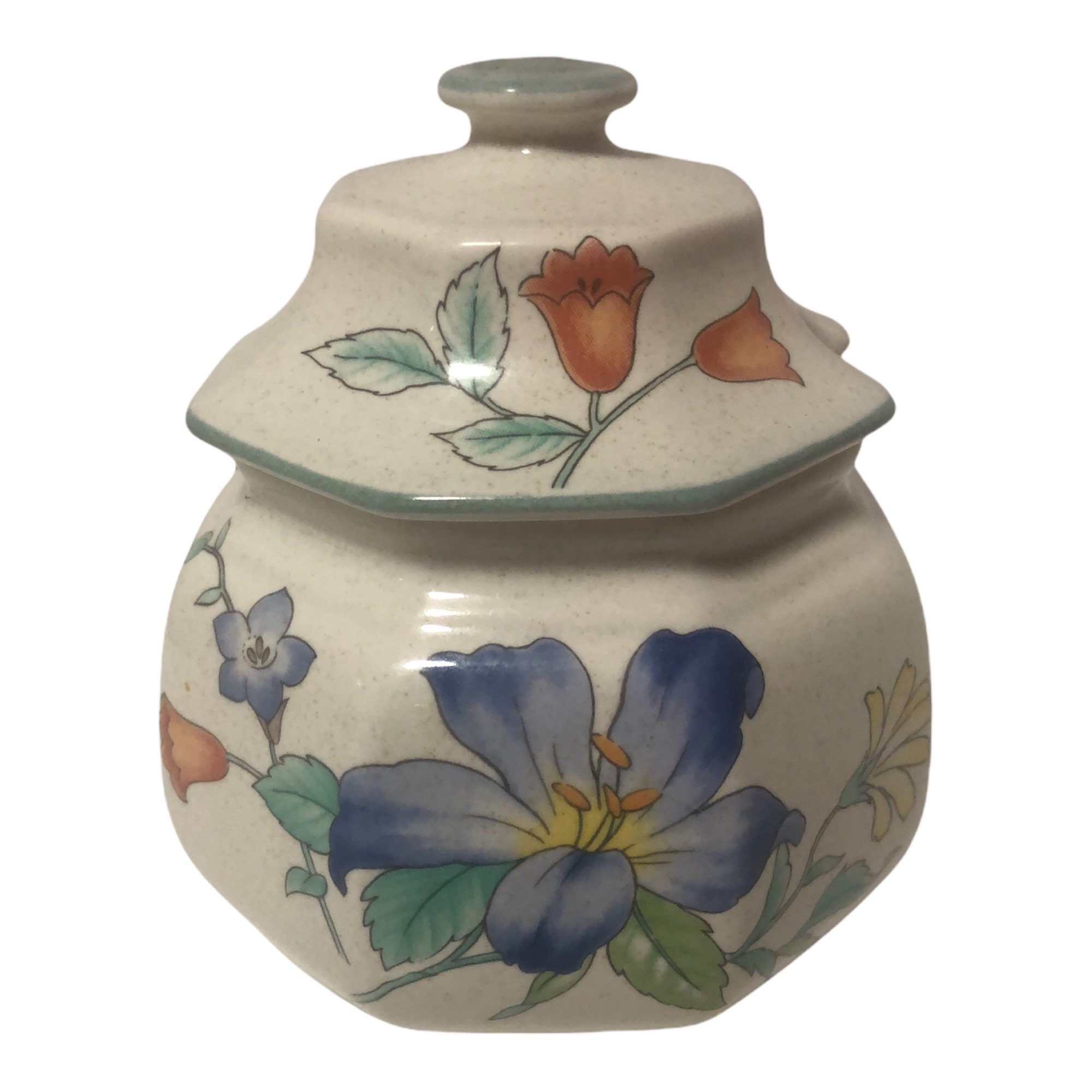 Beautiful vintage covered sugar bowl by Mikasa. is great kitchen decor. The pattern is called "Rose Hips". It was made in the 1990's. The sugar container is in excellent condition with no chips, cracks or crazing. It has a stunning, colorful floral design.
