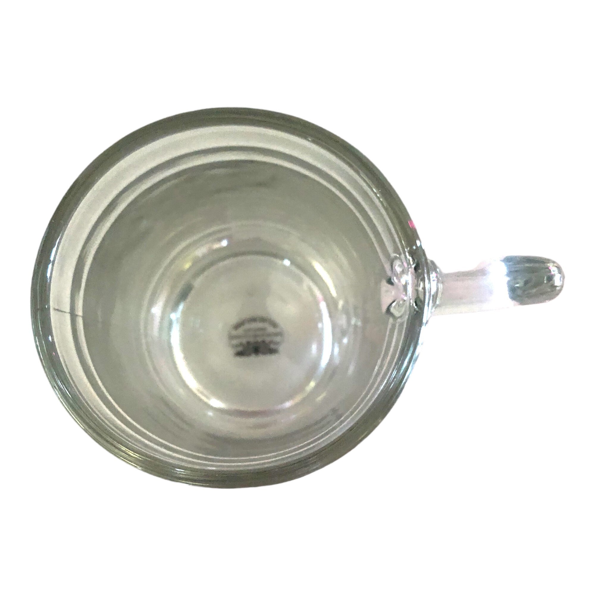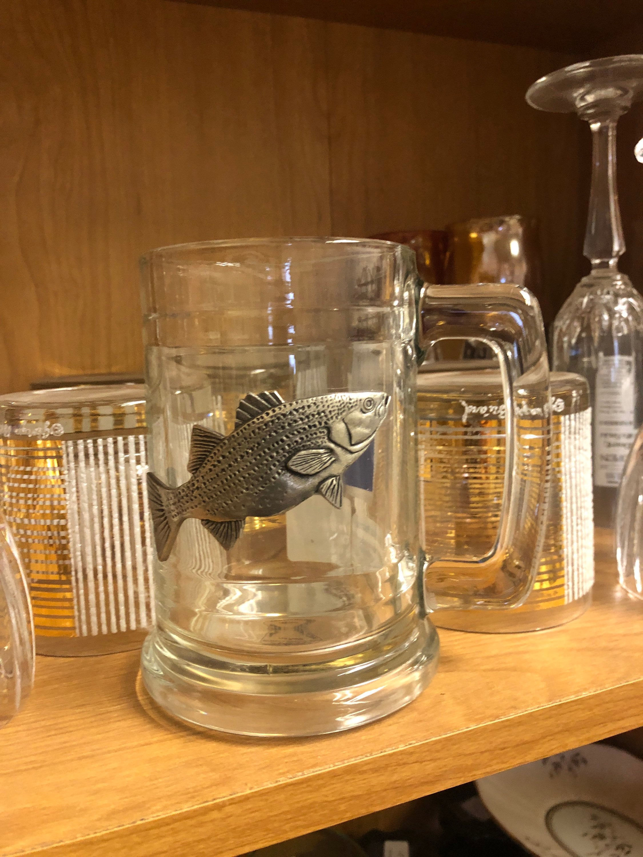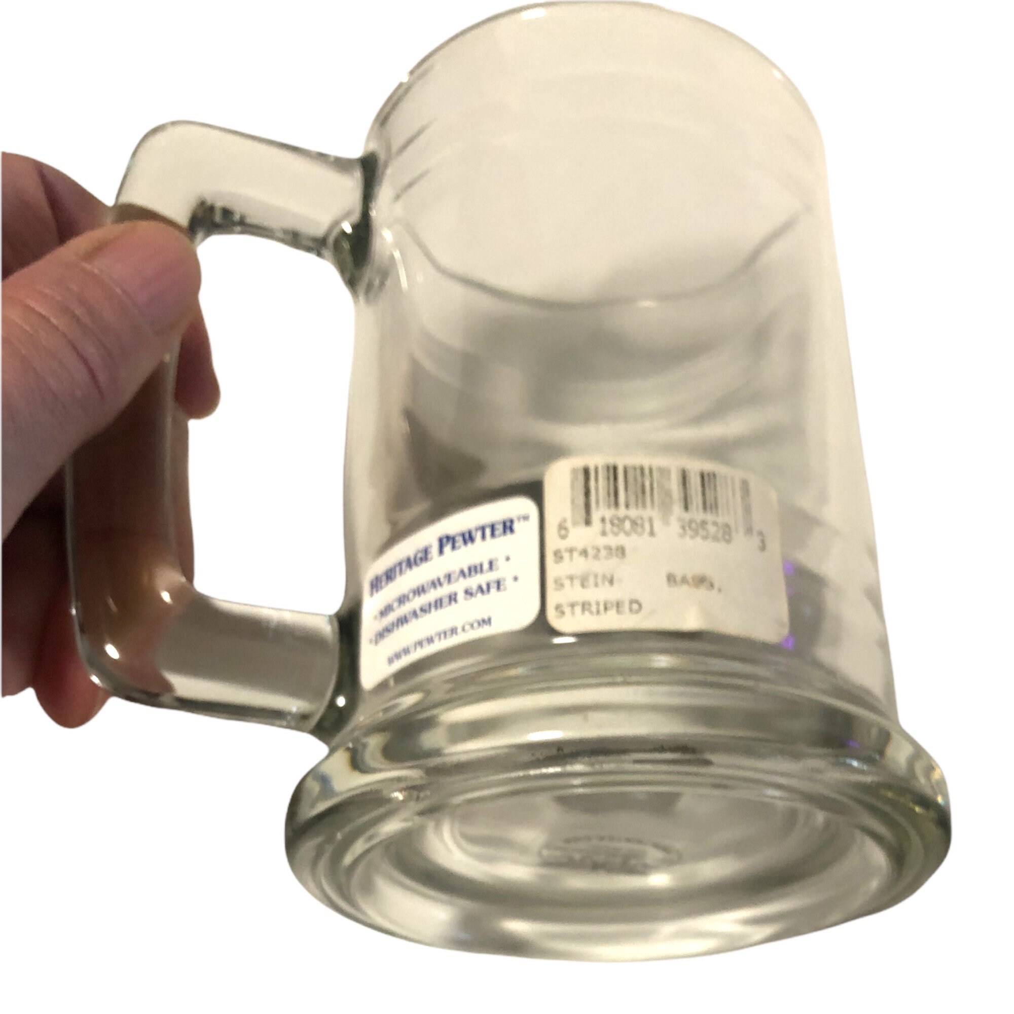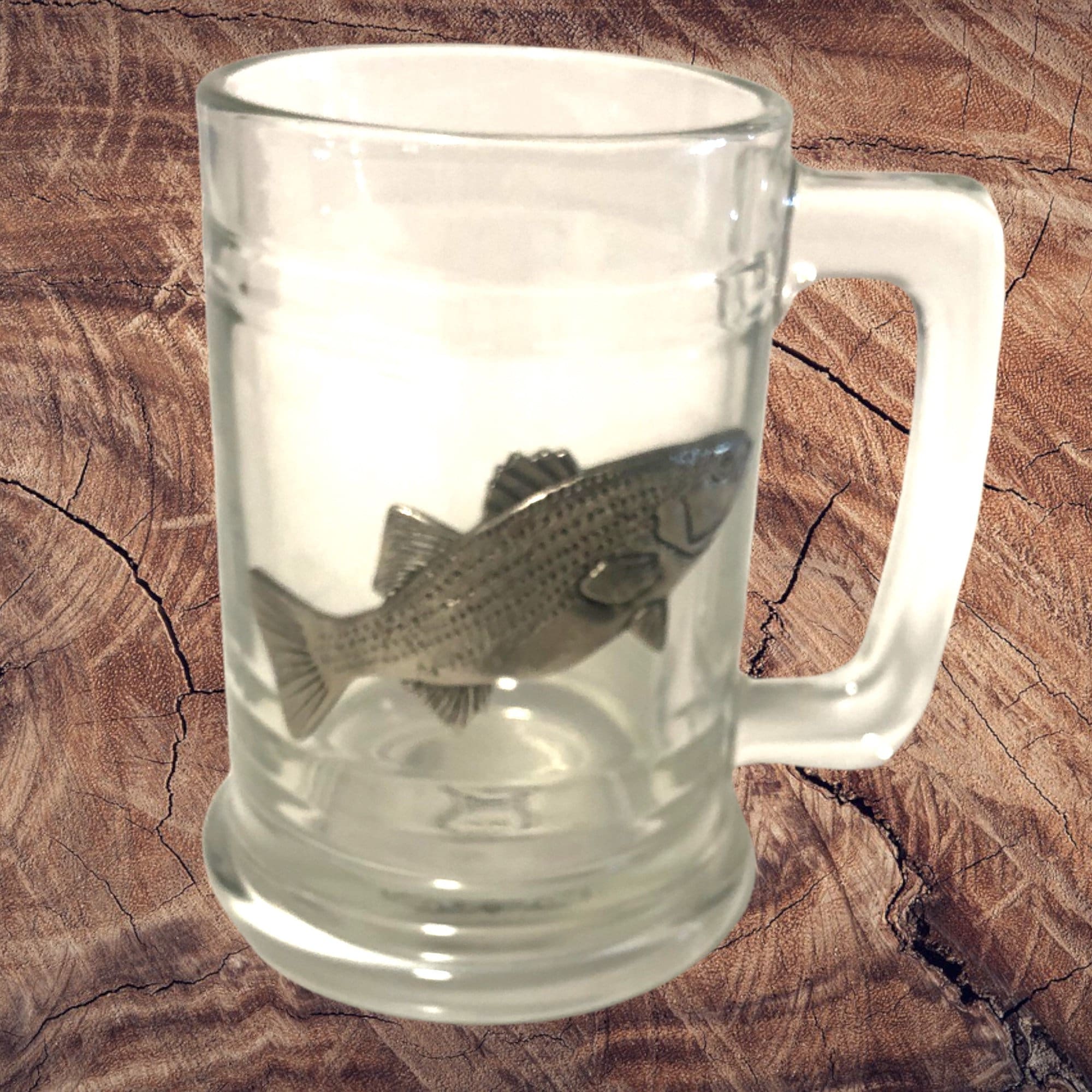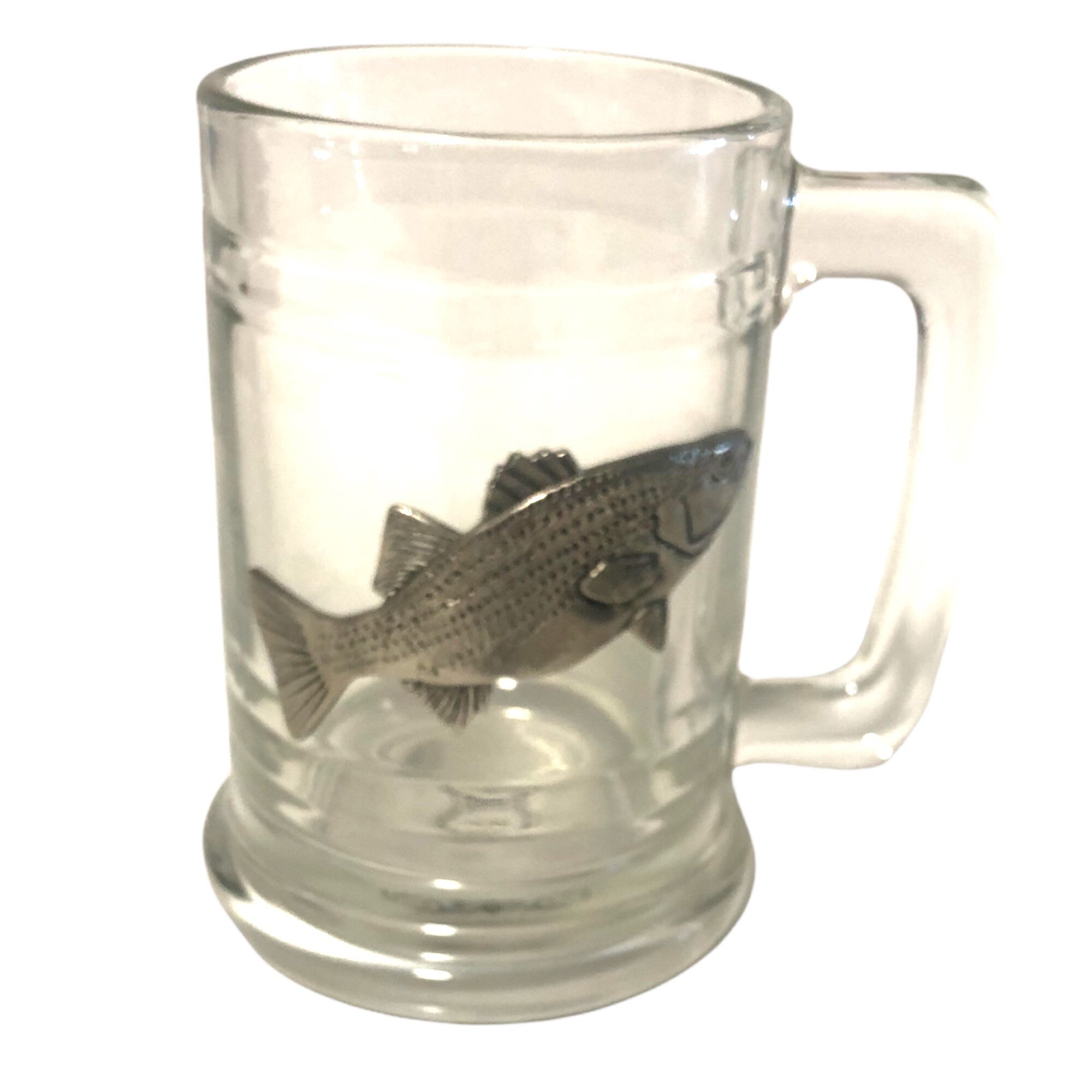 This is a beautiful crystal hand crafted Heritage Pewter crystal beer mug. It measures 5" in height and 3" across the rim. It holds 15 fluid ounces. It features a 3-d sculptured pewter striped bass fish on the front of it. The glass still has the original tags. This Heritage Metalwork fine pewter stein would make a great fisherman gift. This is not a frosted mug. It is a clear glass.