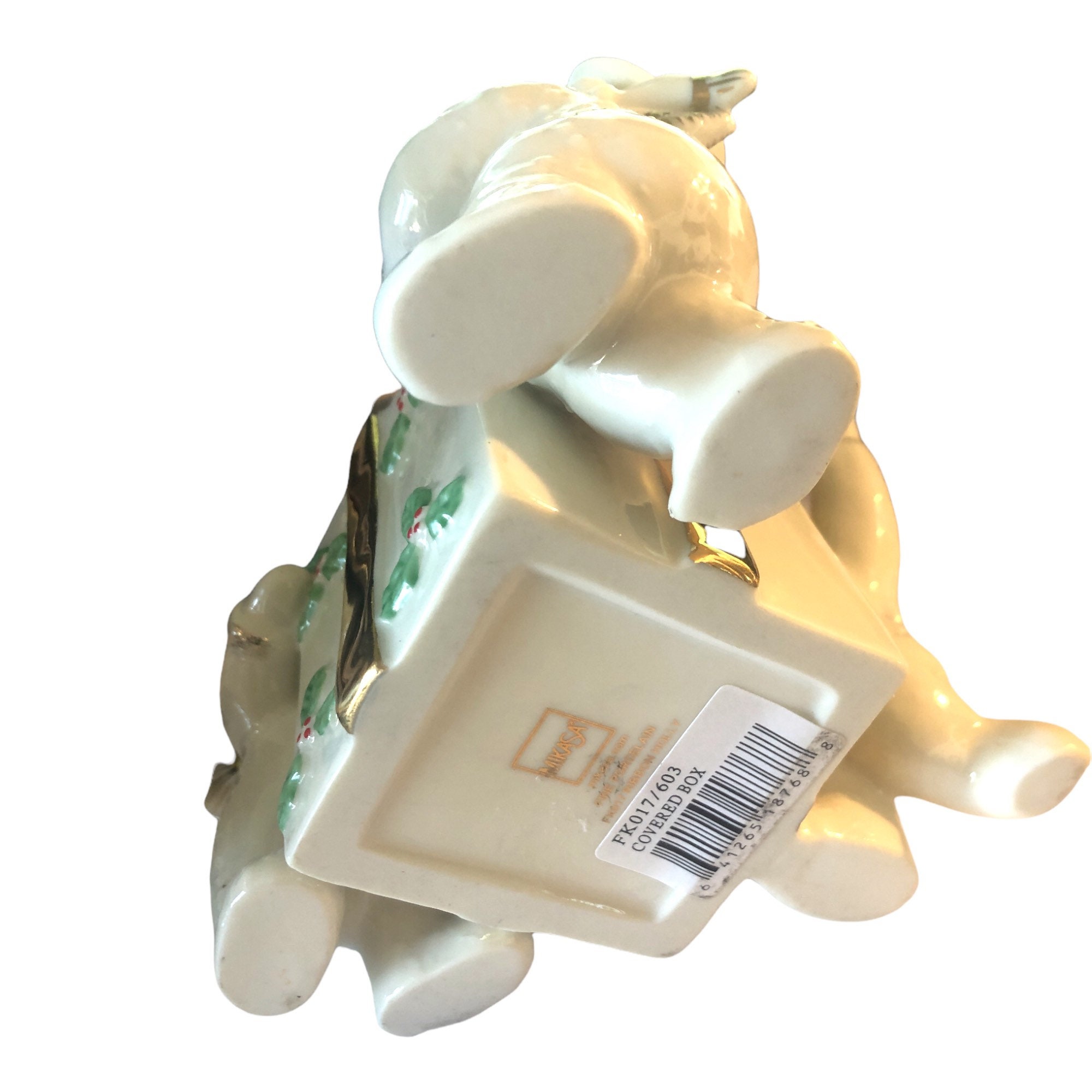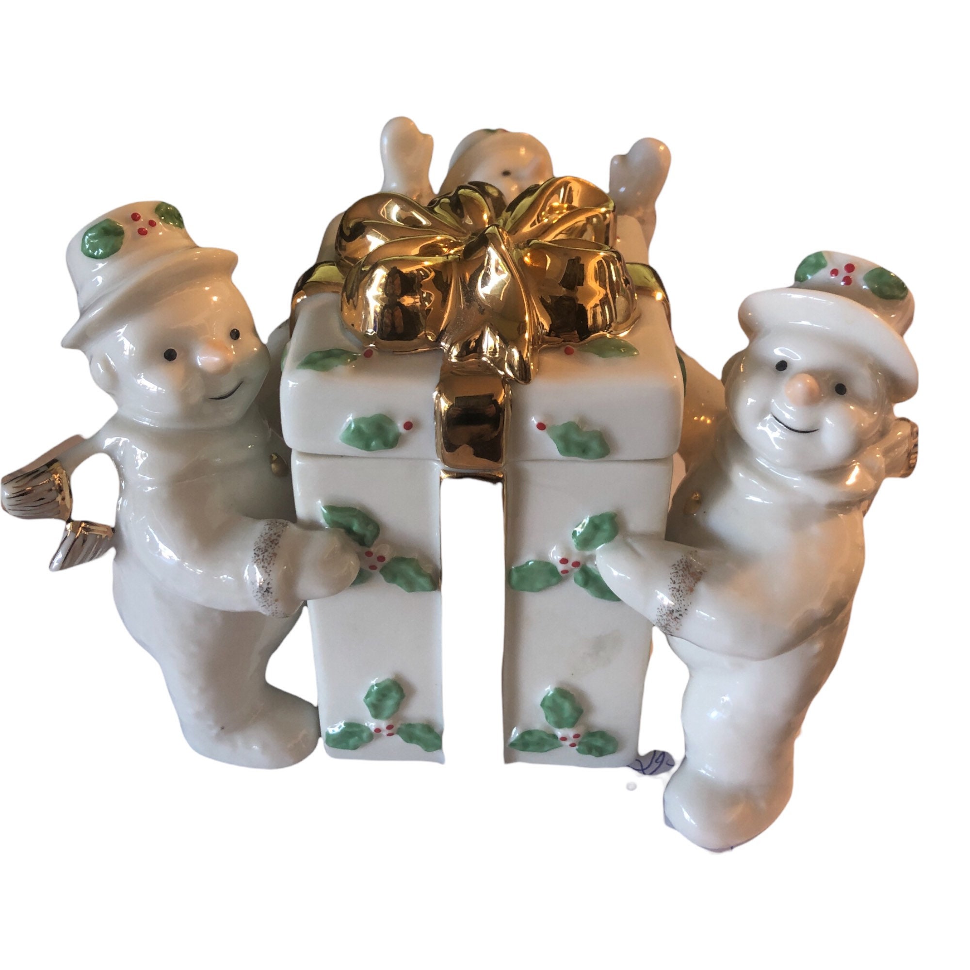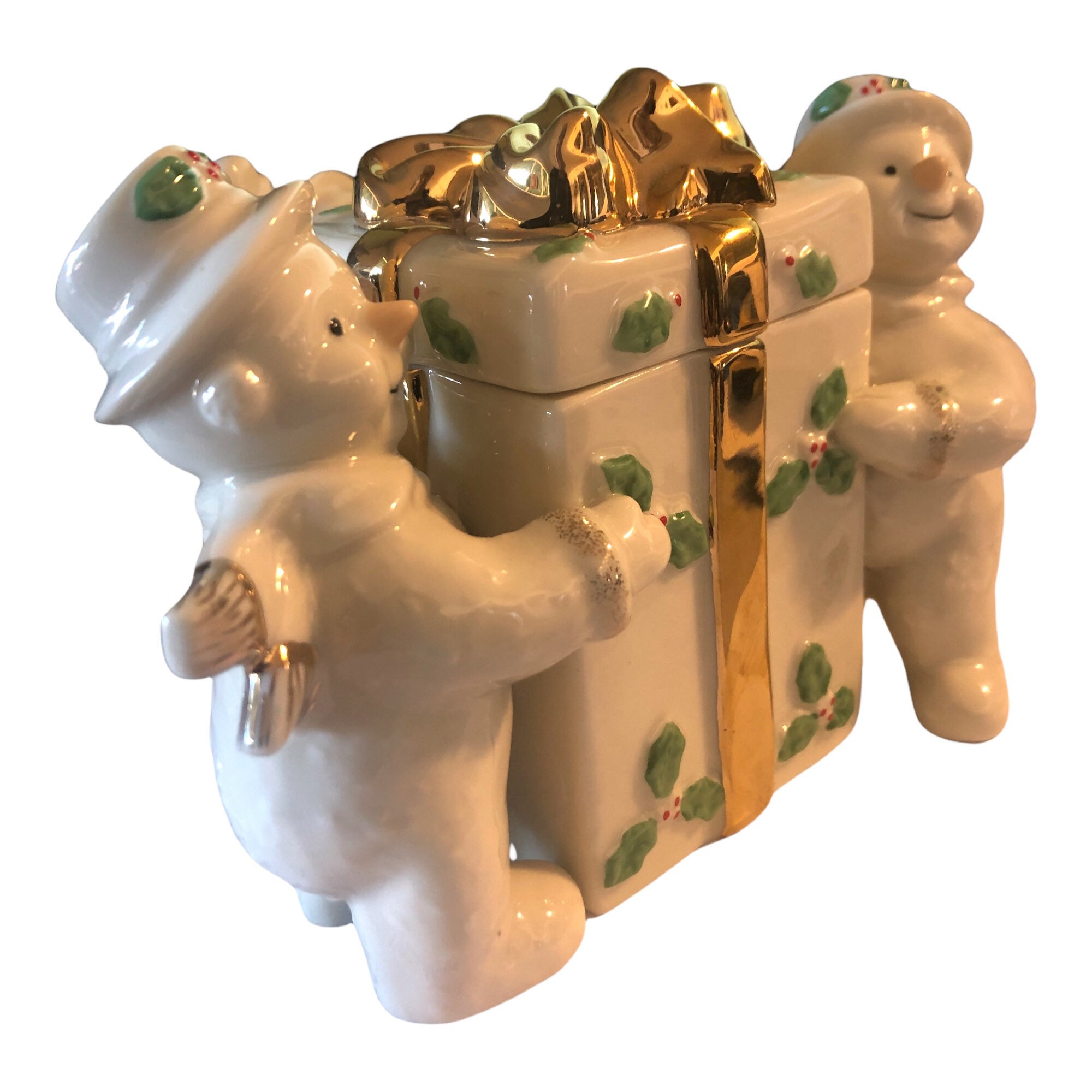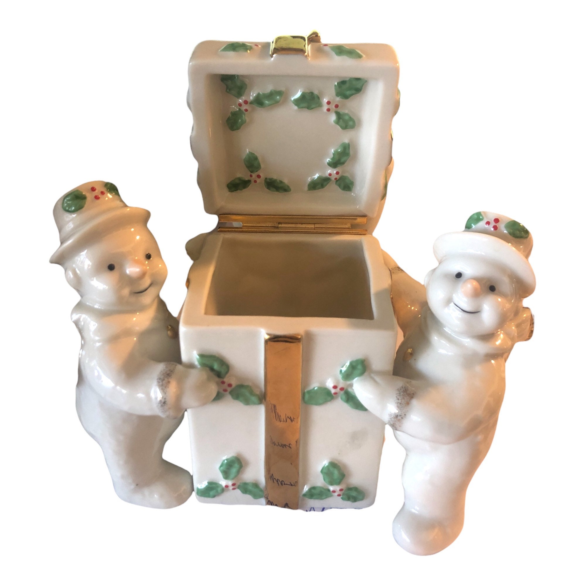 This is a Mikasa snowman family ceramic trinket dish with the original tag. It is in excellent condition. You can use it as a keepsake storage box. The snowman Christmas art box measures approximately 4" x 6" x 5". It is titled Ribbon Holly FK017/603. This cute trinket box is a great gift for Christmas.