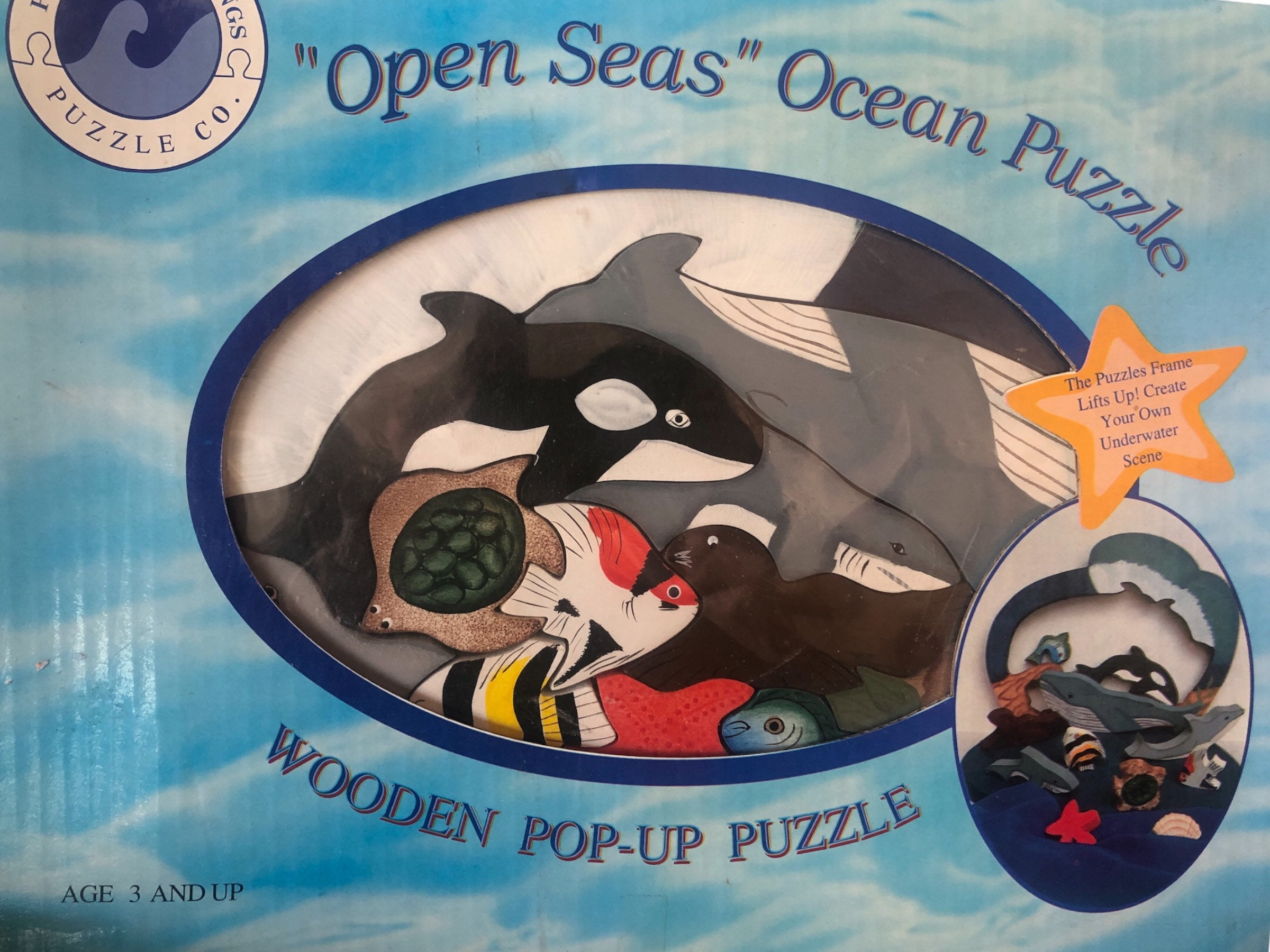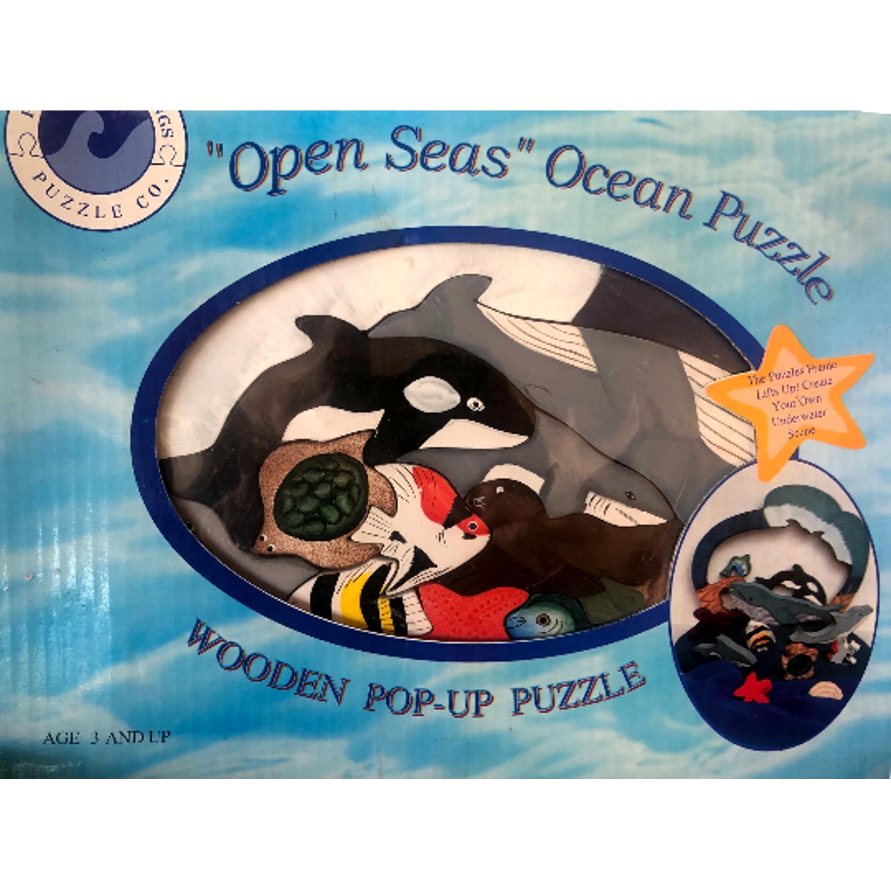 Vintage 3D wooden puzzle for kids age (3) three and up. Created by Peaceful Joinings. The factory sealed wooden puzzle is called "Open Seas". It comes in the original box.