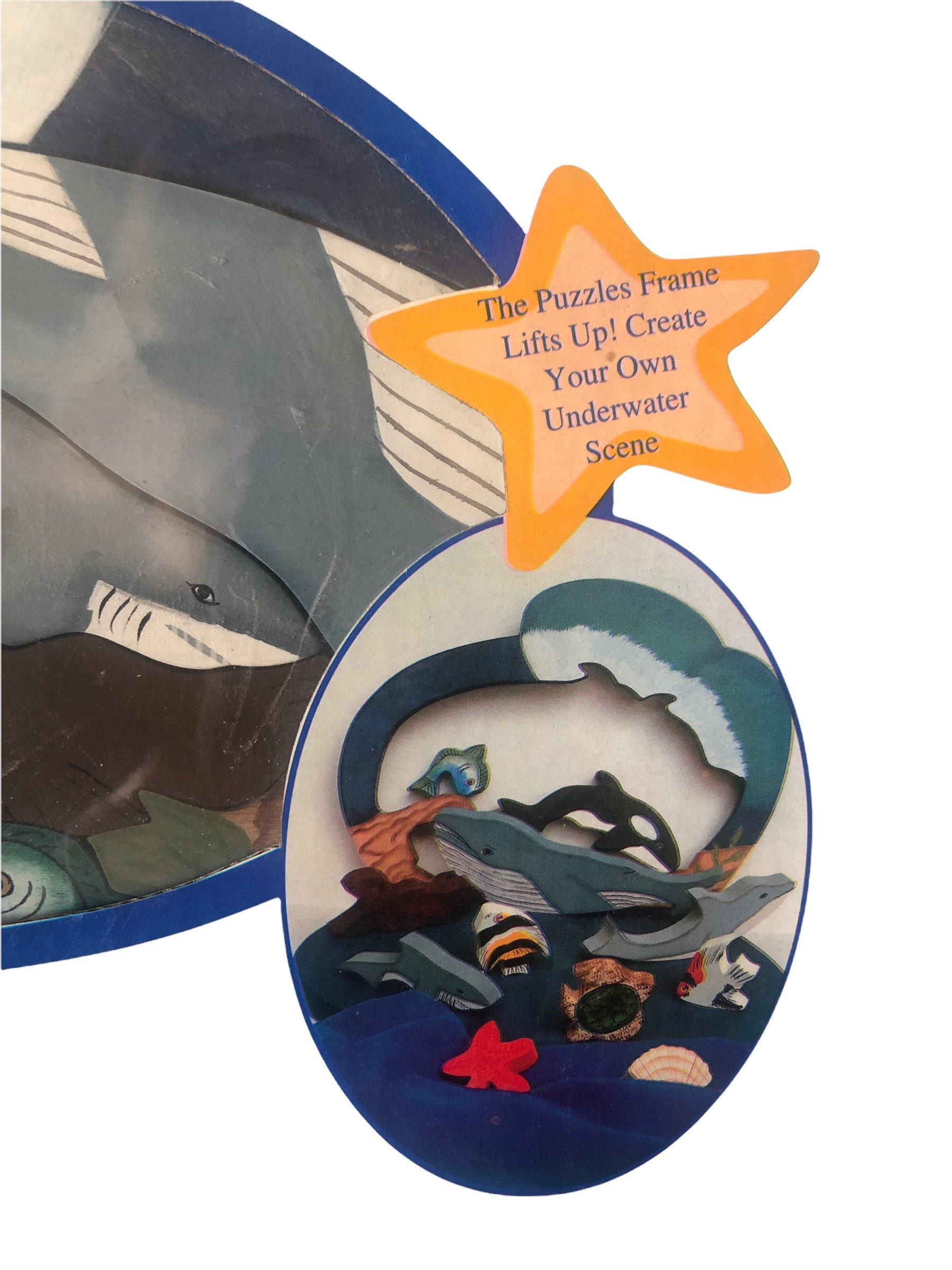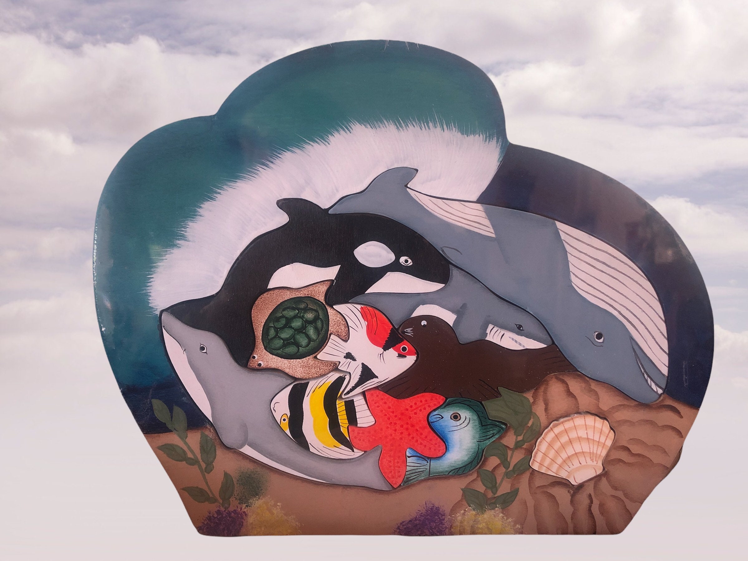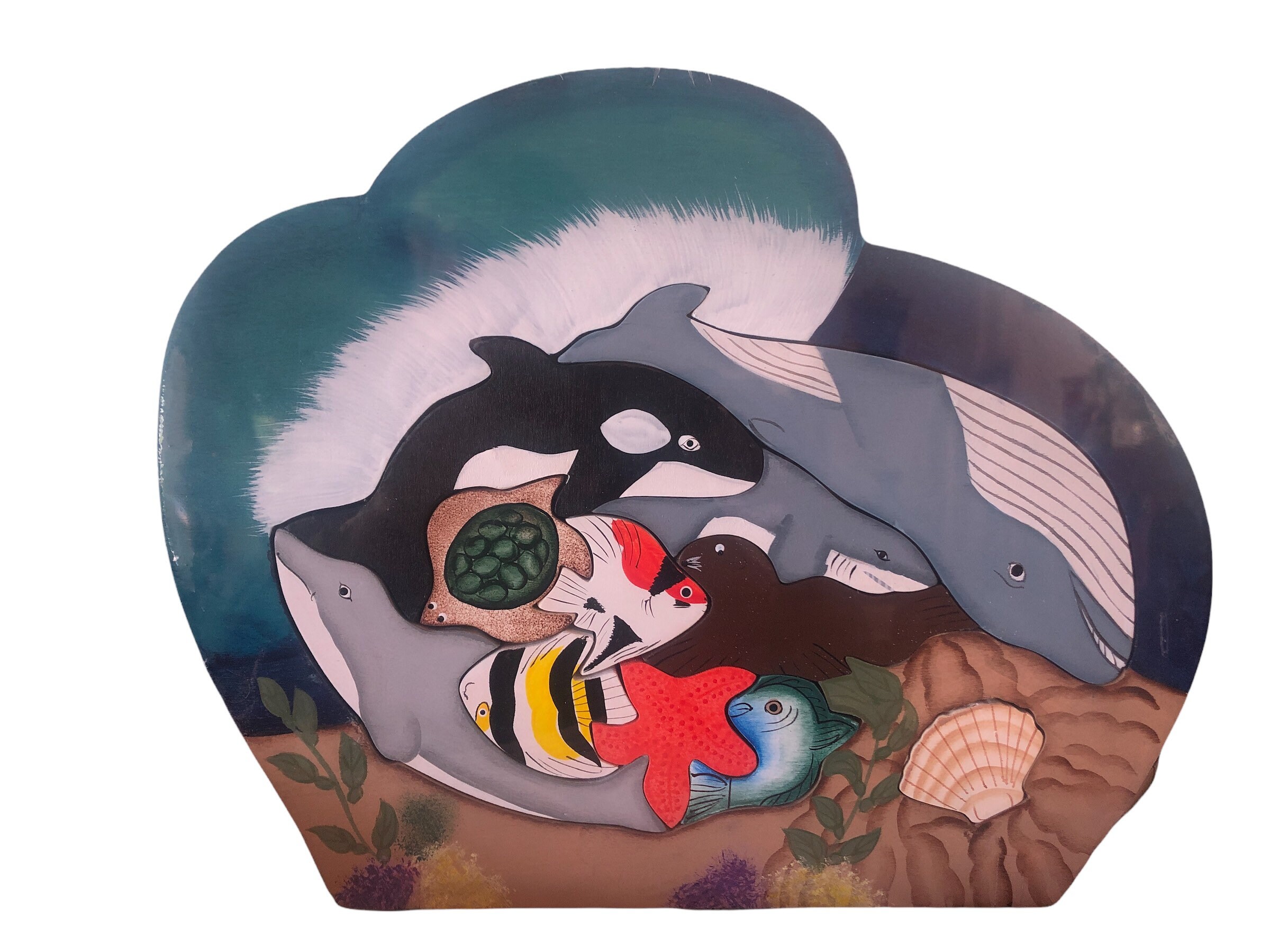 This puzzle is made with non-toxic paint and wood. It has eleven handcrafted and hand-painted figurines. I see whales, starfish, seals, seashells, and tropical fish. The pieces are durable and resistant to breakage.