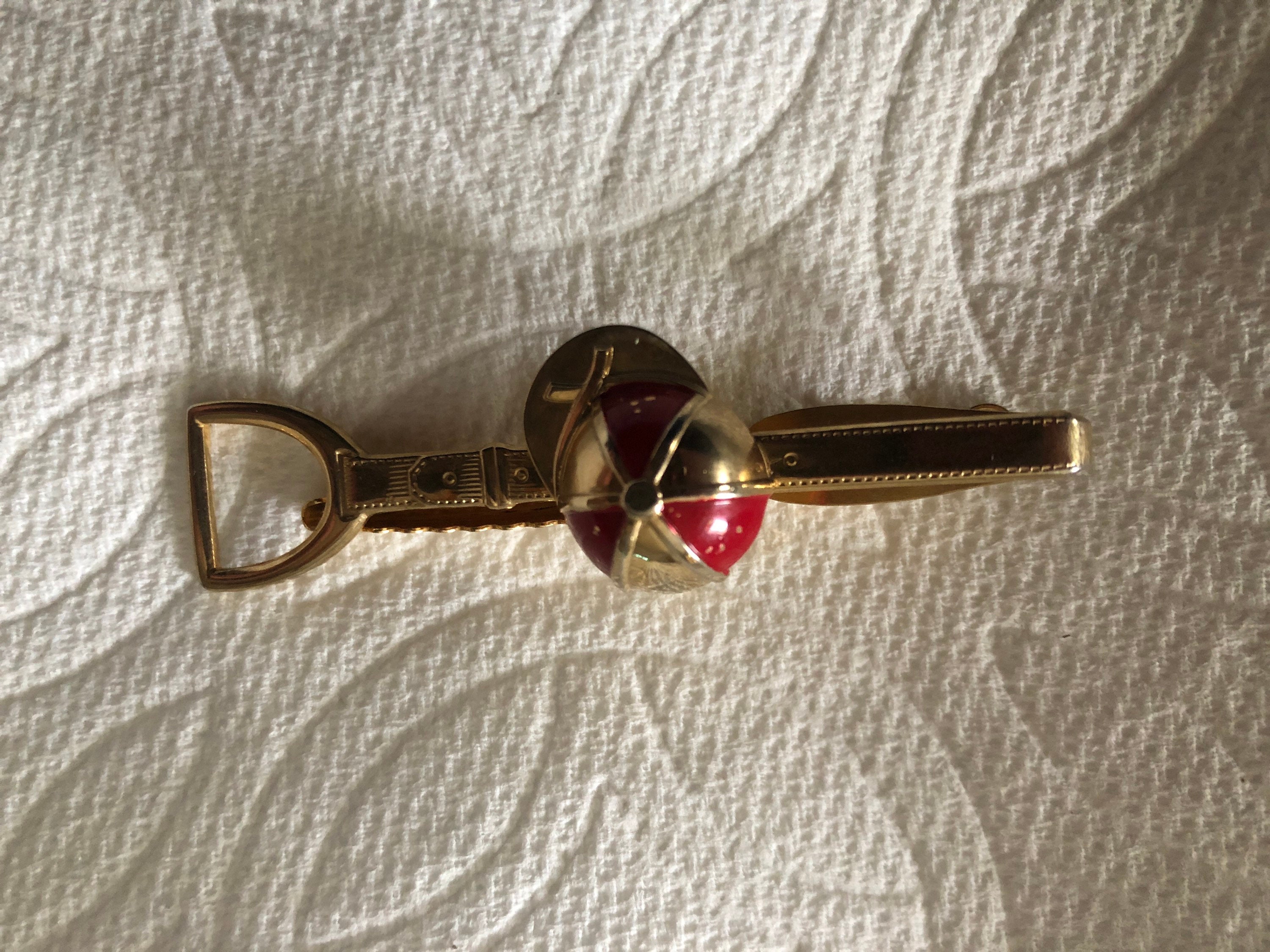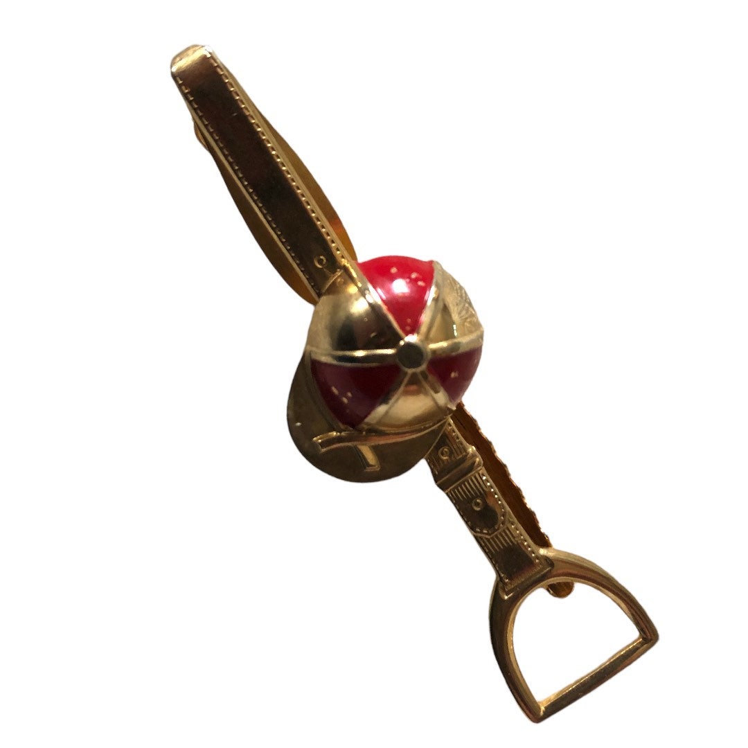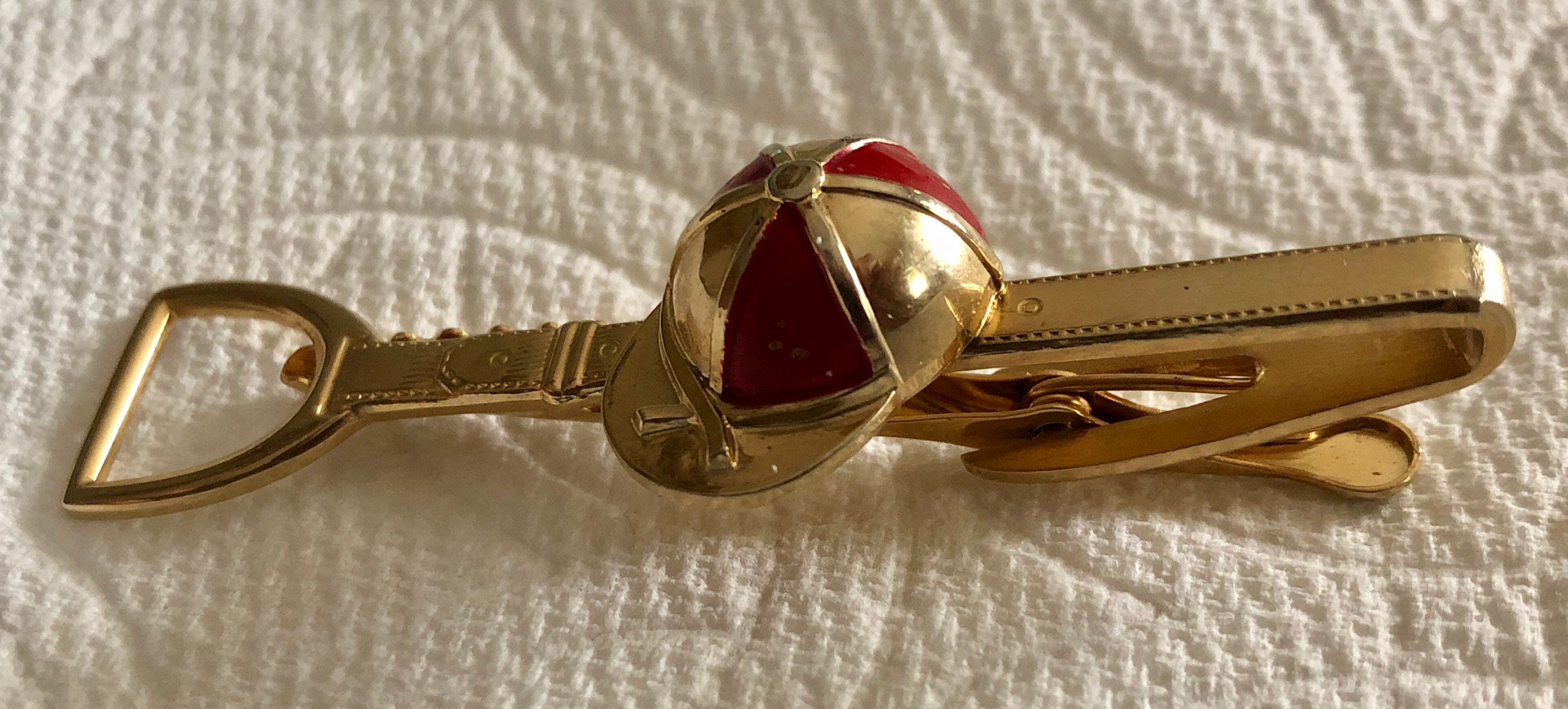 This is a vintage derby hat tie clip in red and gold. The derby cap sits on the strap and stirrup of the saddle. It is marked Hickok. Measures 2.75" wide. Very good condition. It comes in a gift box too!