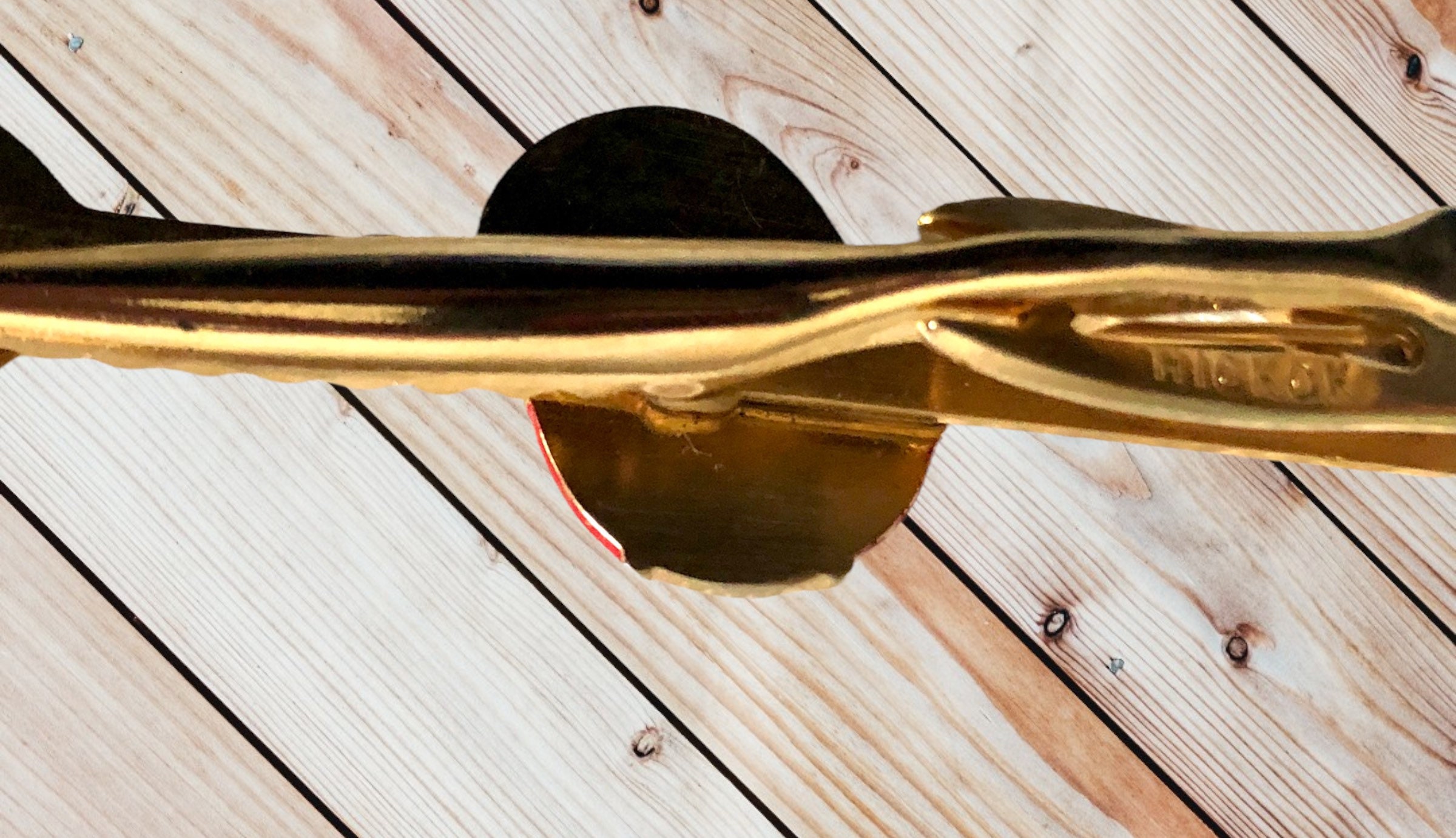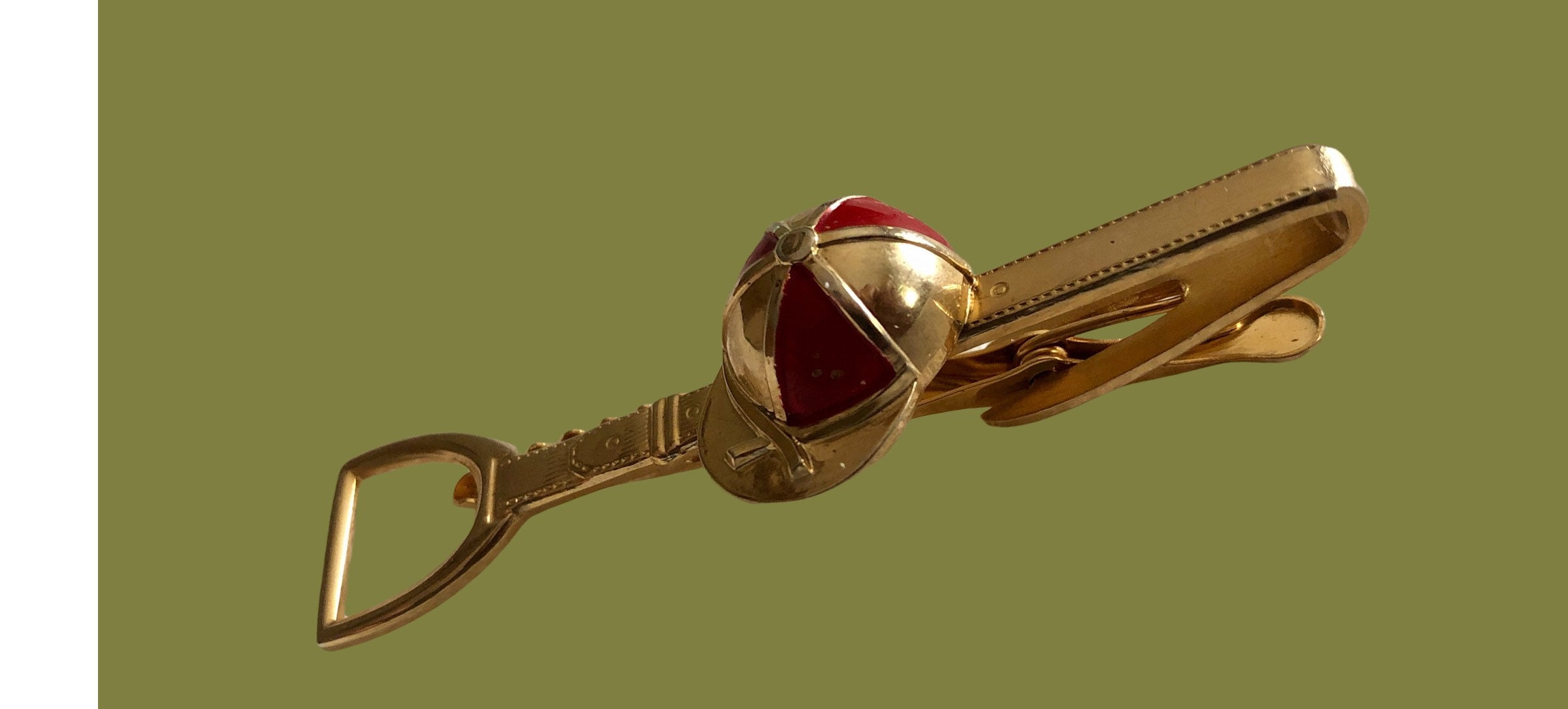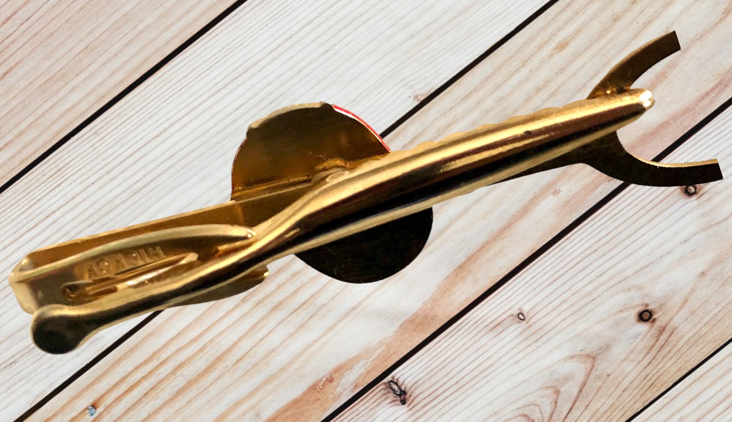 This is a vintage derby hat tie clip in red and gold. The derby cap sits on the strap and stirrup of the saddle. It is marked Hickok. Measures 2.75" wide. Very good condition. It comes in a gift box too!