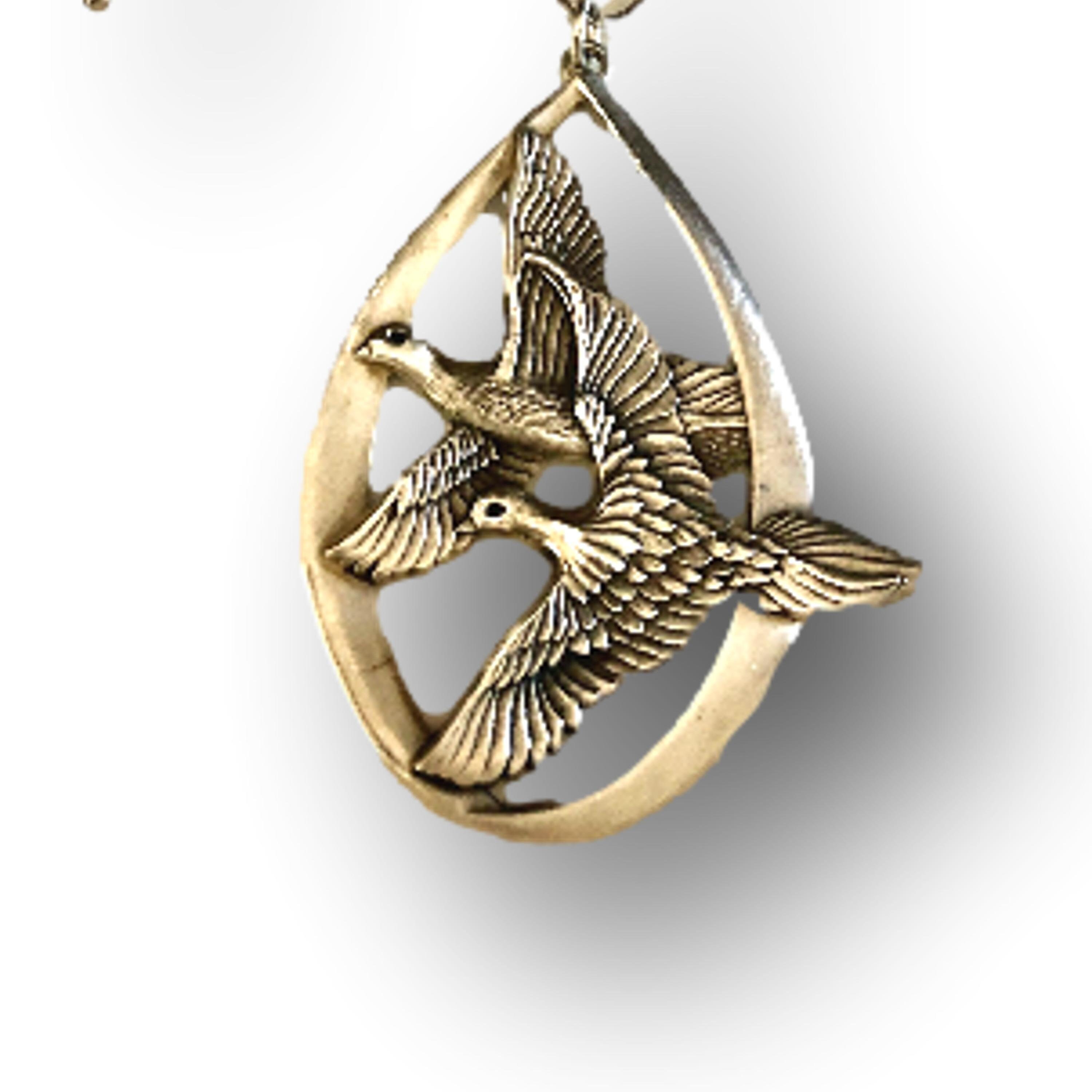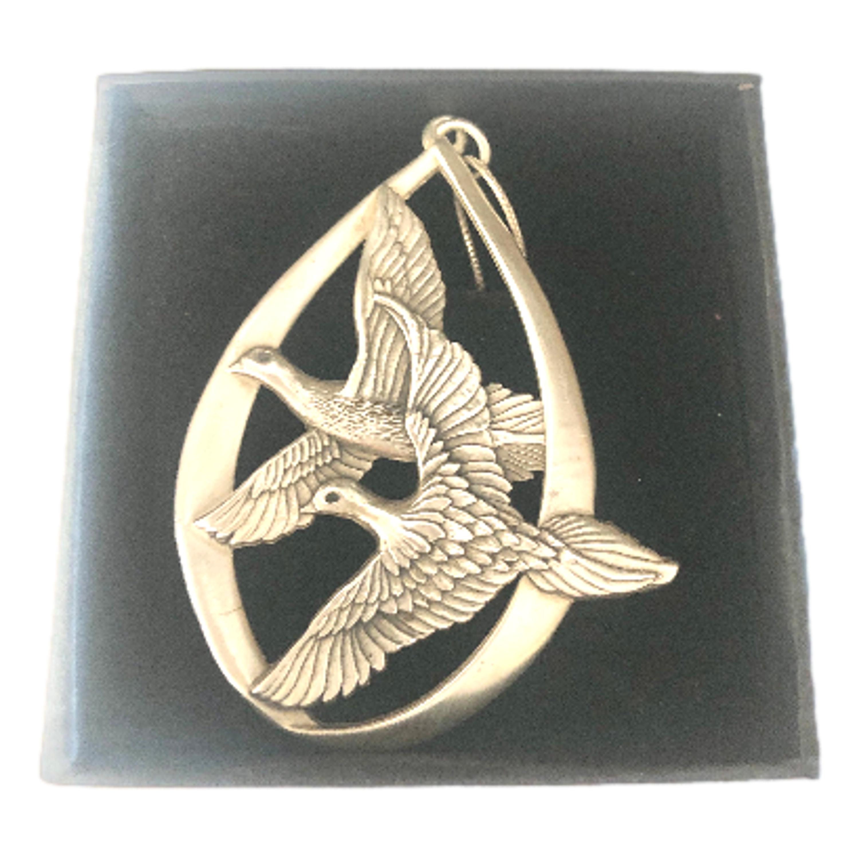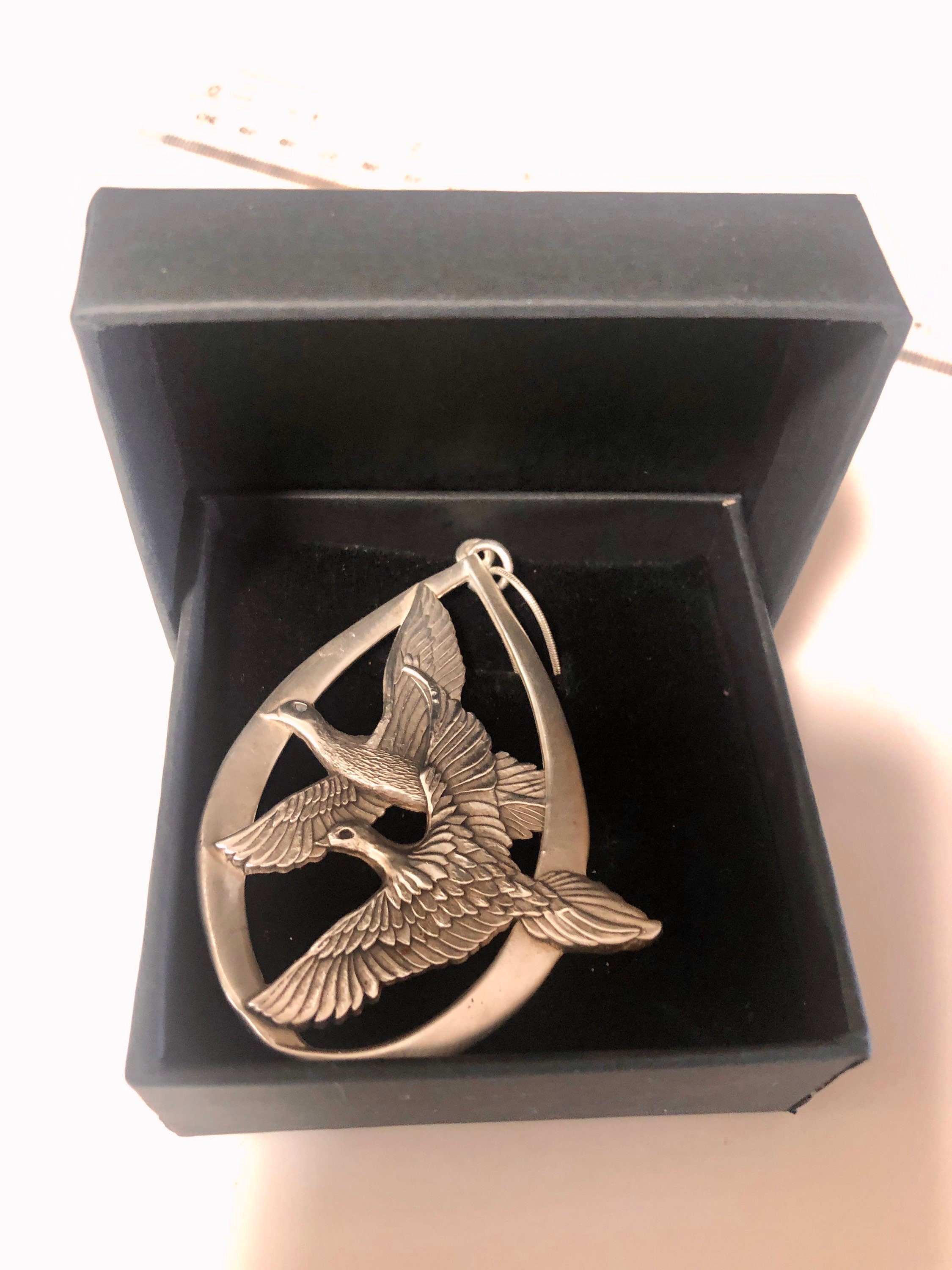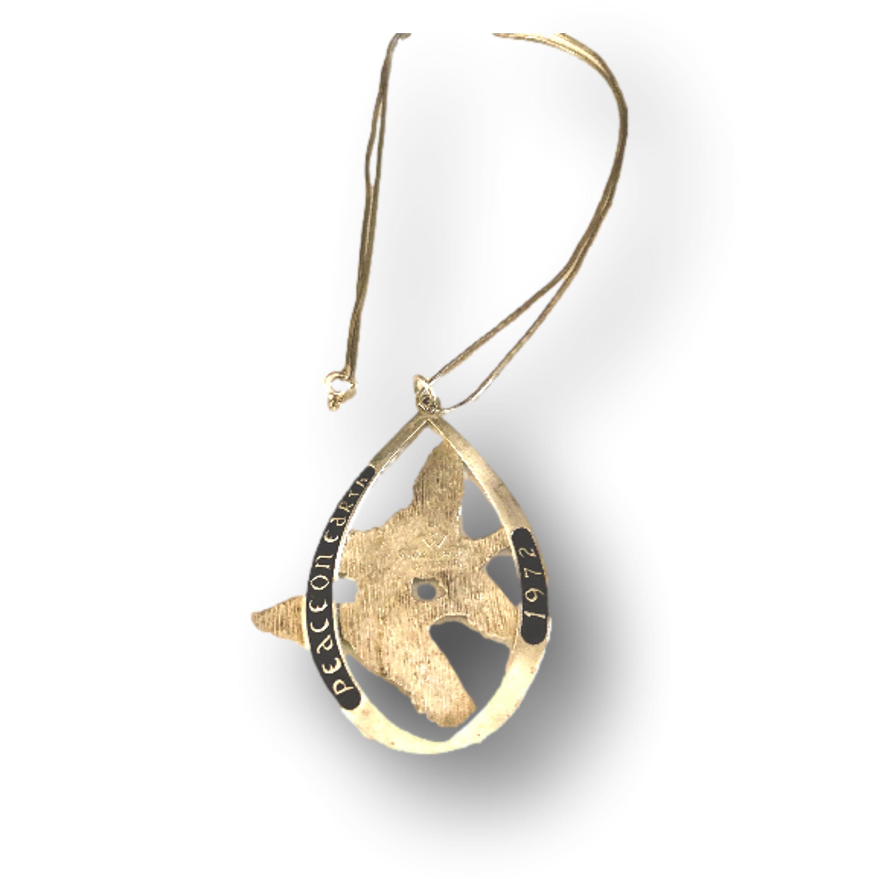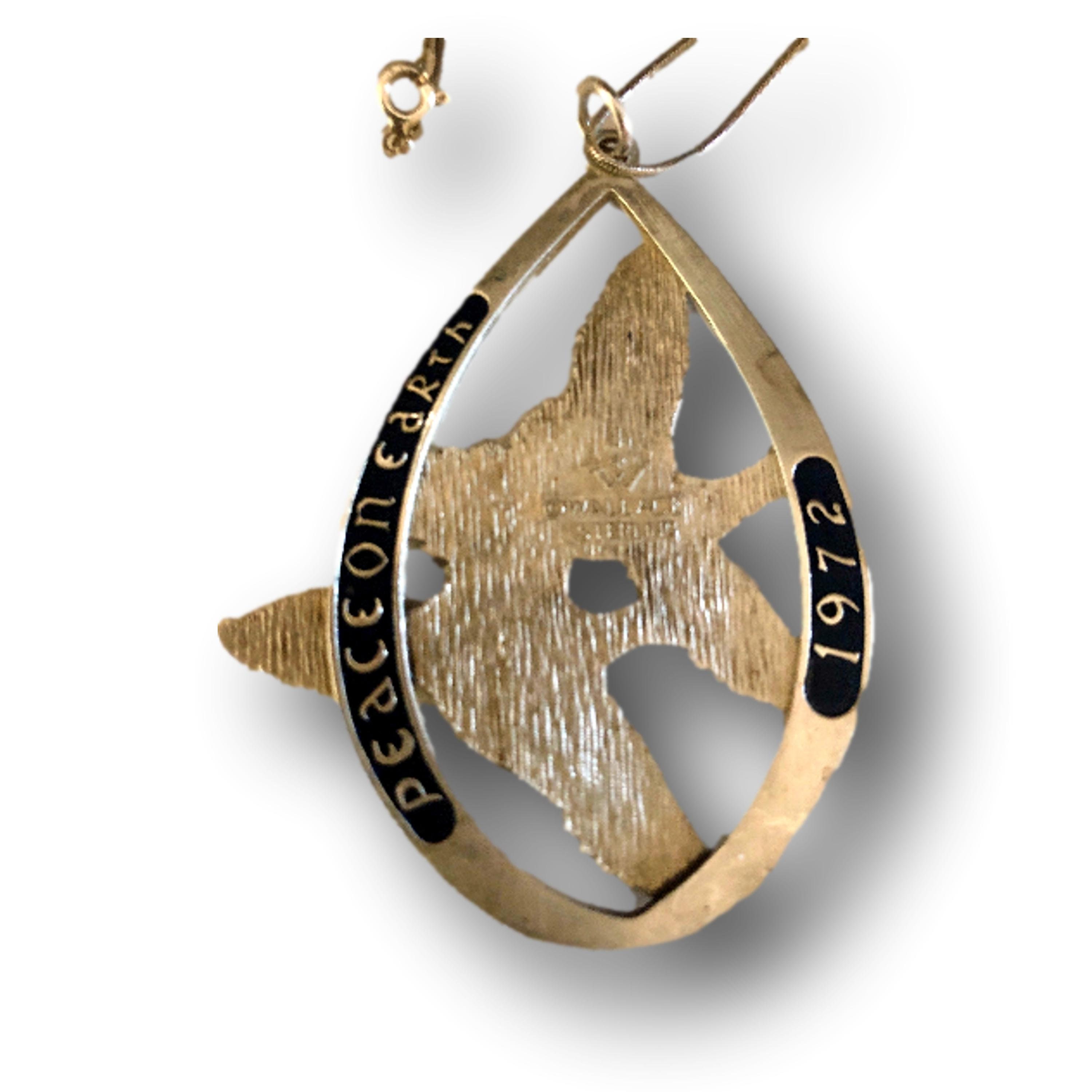 This is a vintage 1972 Wallace Sterling Silver Peace on Earth necklace. The chain measures 24" in length. Features is an oval silver pendant/ornament with two doves of peace. The statement jewelry gift for her measures approximately 2.5" high x 1.5" wide. This pendant necklace comes in a gift box. Great summer jewelry! Silver is 925 purity.