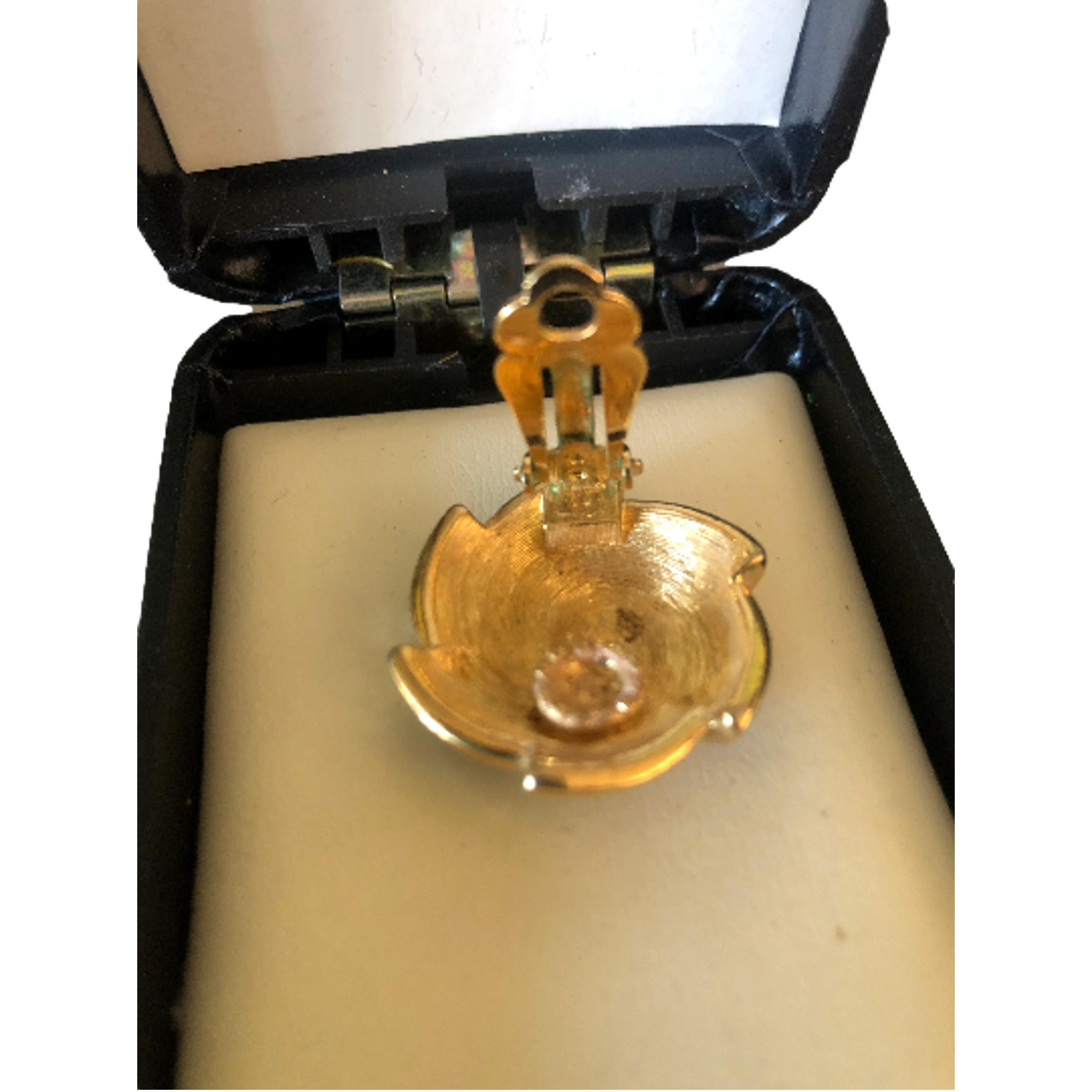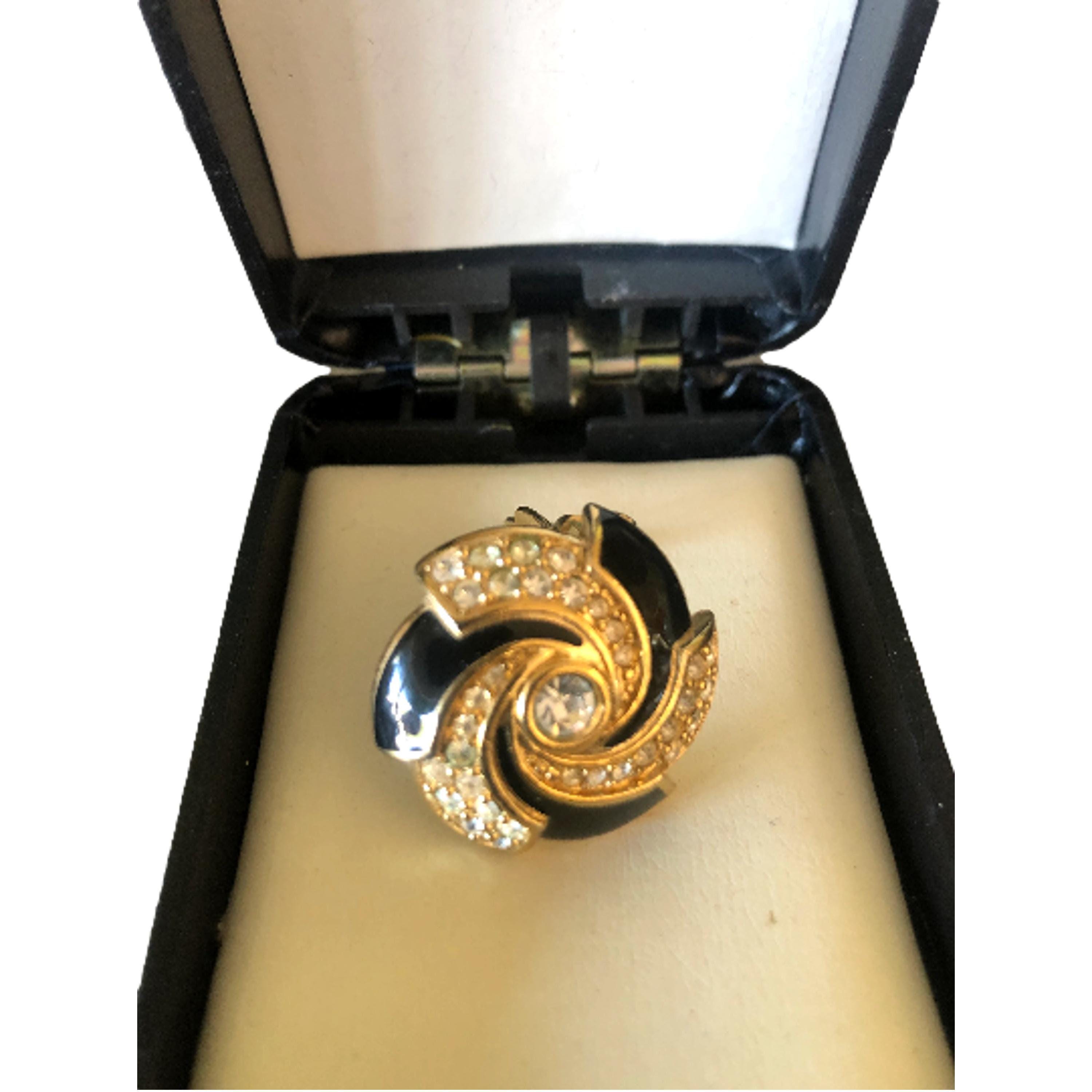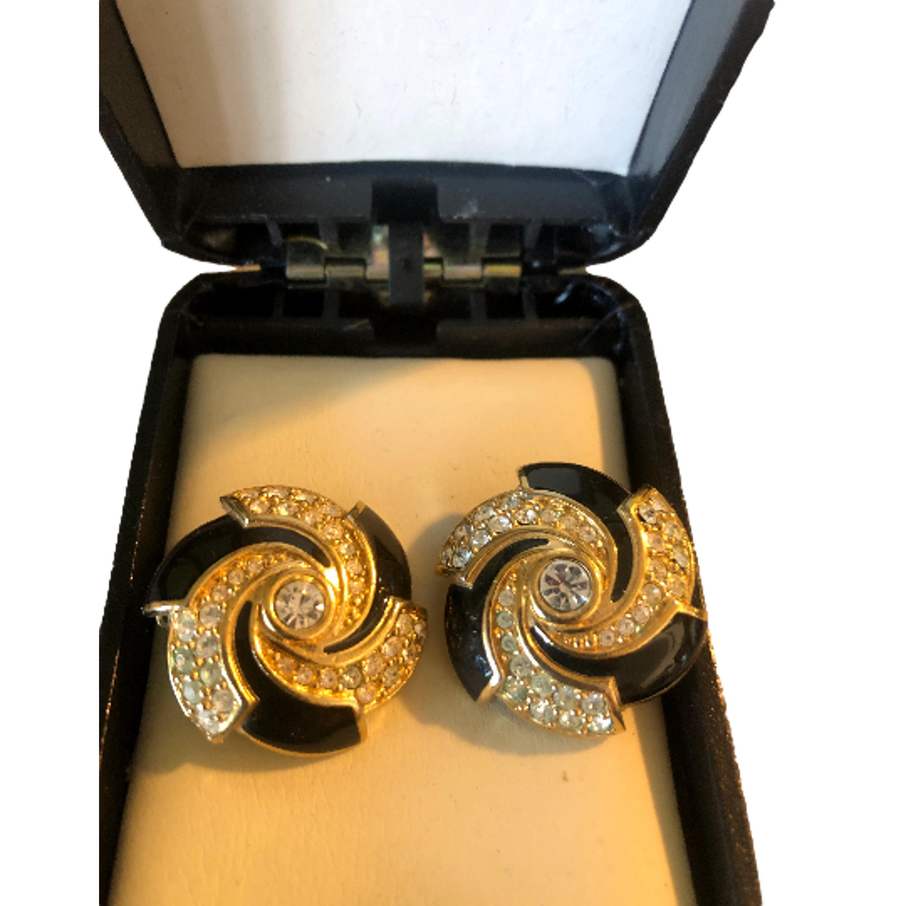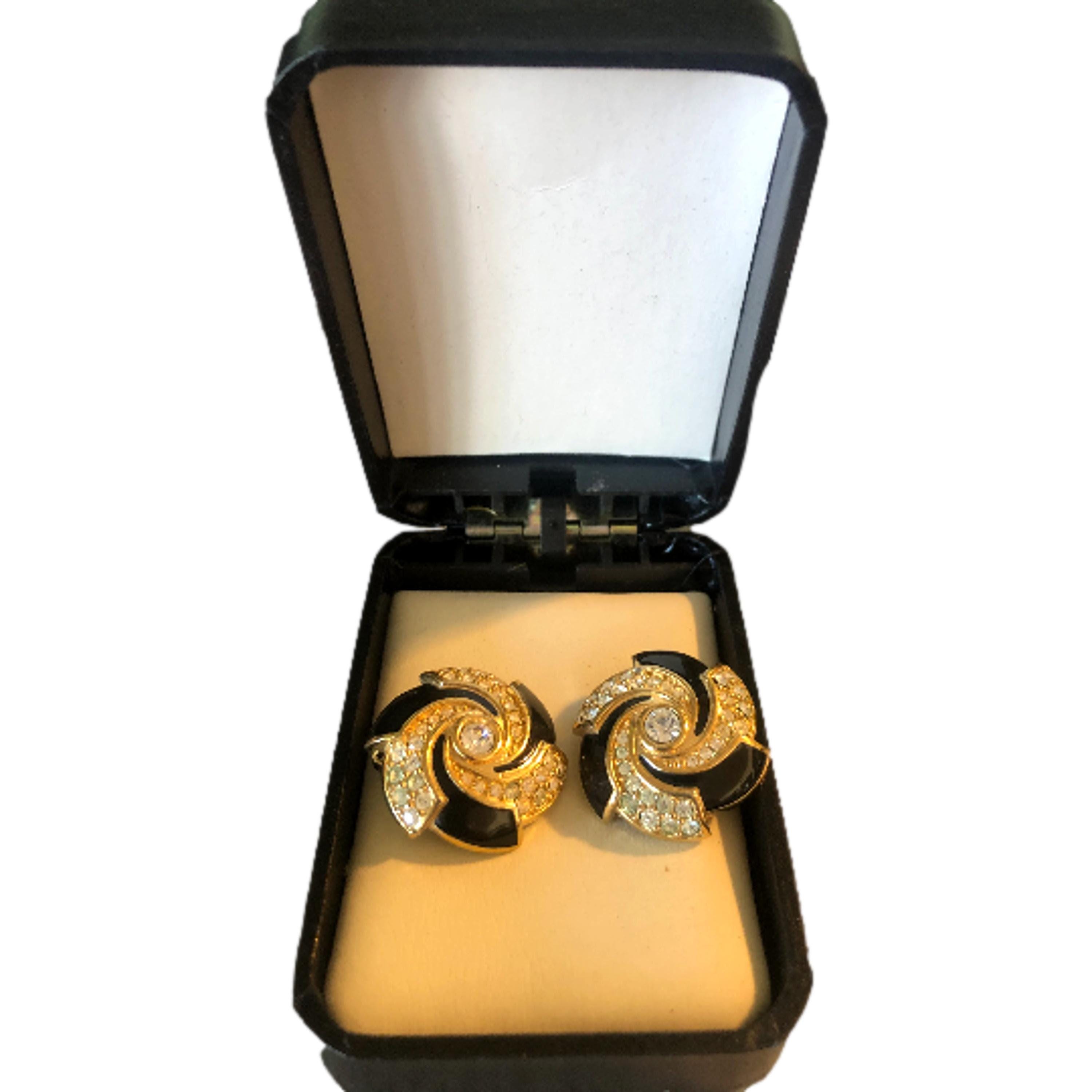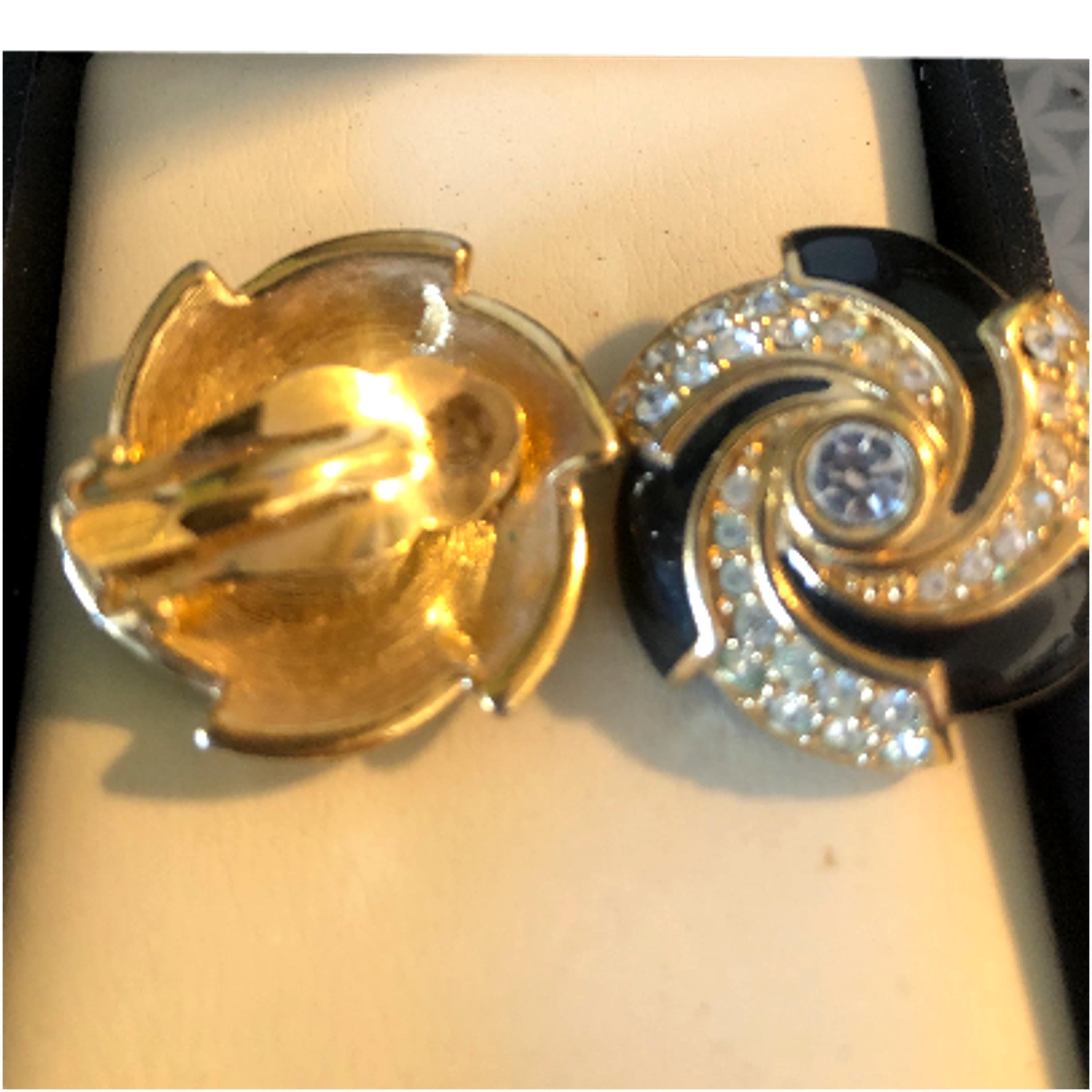 Great summer jewelry idea for wife birthday gift ideas. We have a vintage clip on earrings set in a gold tone metal with crystals. The colors of these stylish earrings are black, silver, and gold. All the silver crystal rhinestones are intact. I believe this was made by Swan although I see no maker's mark. It comes in a black stylish jewelry box.