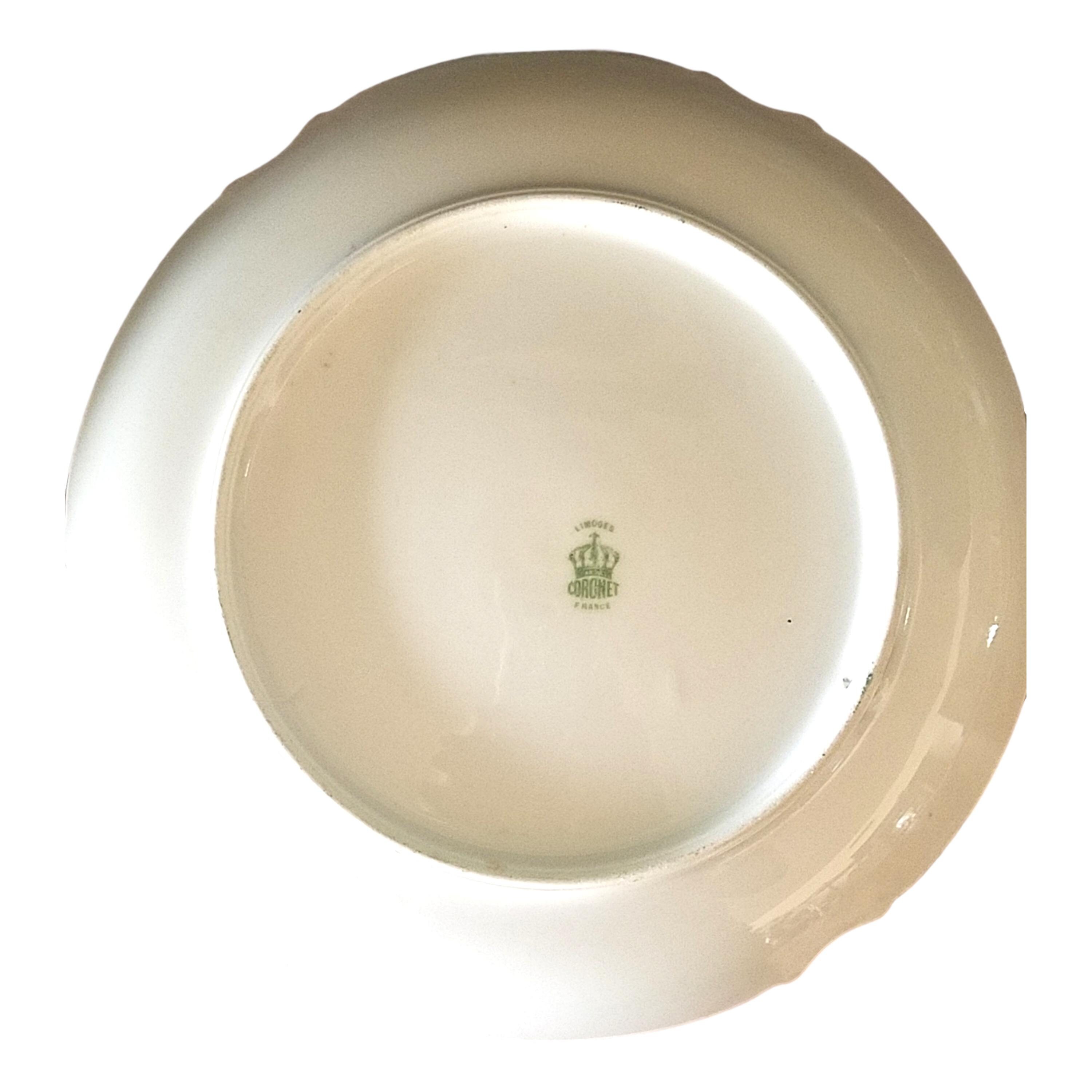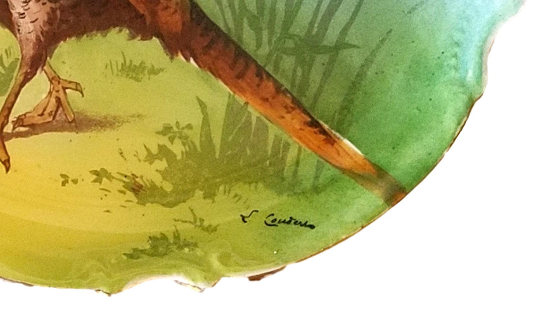 Get this stunning, vintage hand painted Limoges game birds wall hanging plate. It is artist signed wild game bird called a pheasant decor motif plate made by George Borgfeldt (an importer of items from France) under the Coronet trade name of Limoges, France from 1906 to 1920. The porcelain charger plate has scalloped edges. Measures 10 inches in diameter. Very good condition. No chips, cracks or crazing. Some paint loss on the rim of the plate.