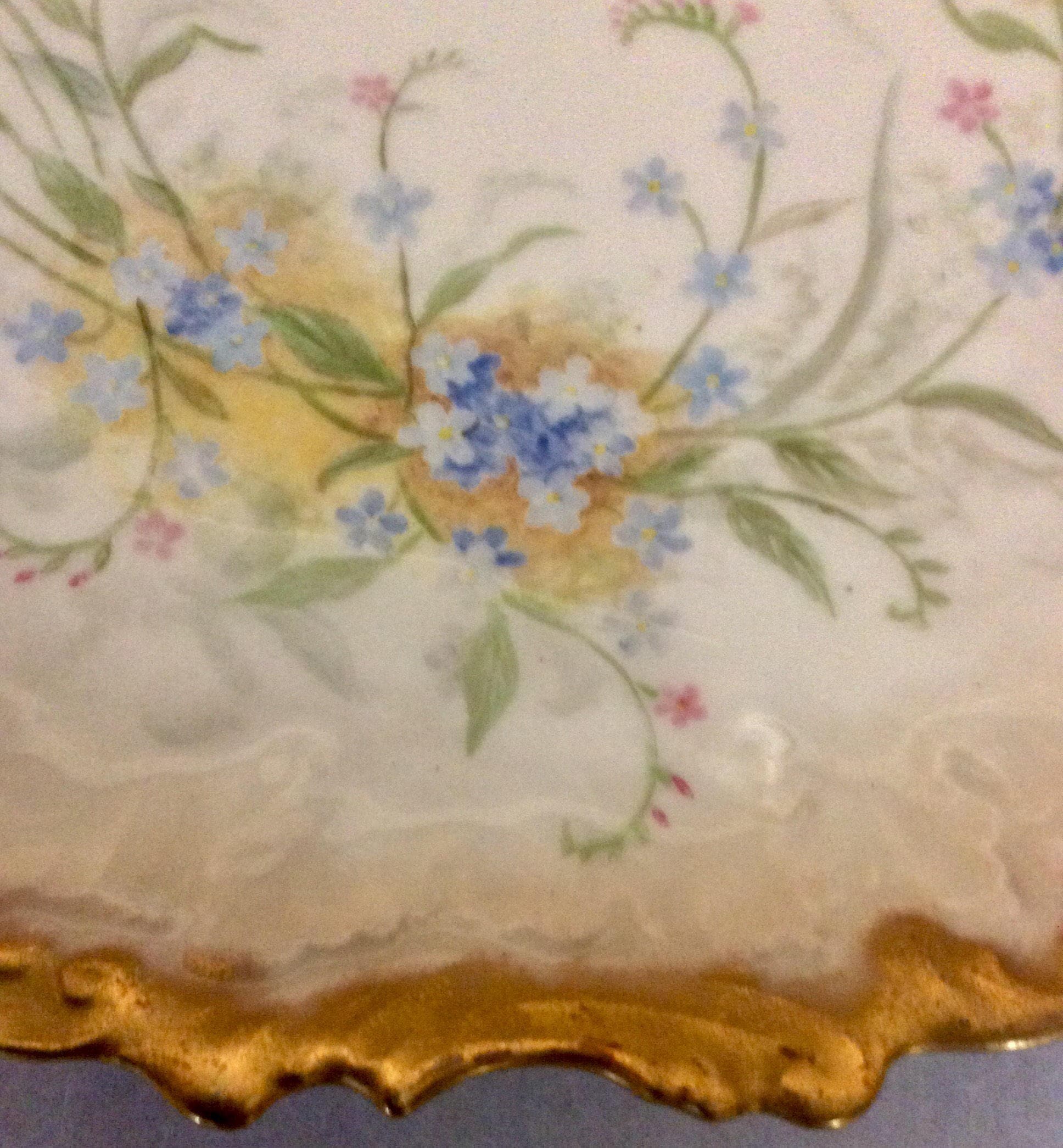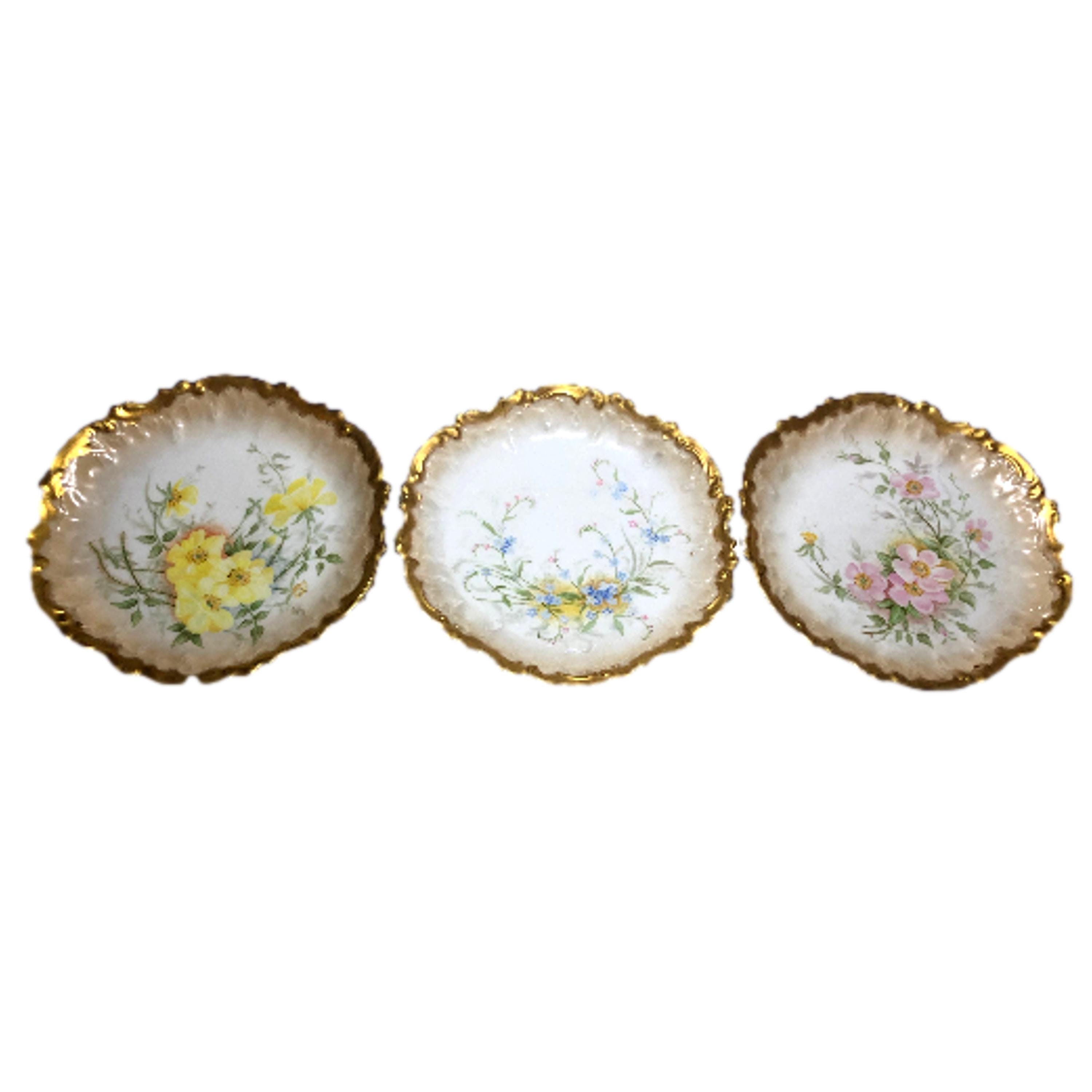 These Limoges china plates have a heavy, thick gilded gold band on the outer rims, and they have an embossed design. These unique floral Limoges ceramic plates have initials on the back of the plates. These Limoges wall plates are adorned with forget-me-knot flowers on one plate, yellow blossom flowers, and pink wild roses on the other plate. No chips, cracks, or crazing. Good condition. Buy all three and get combined free shipping.