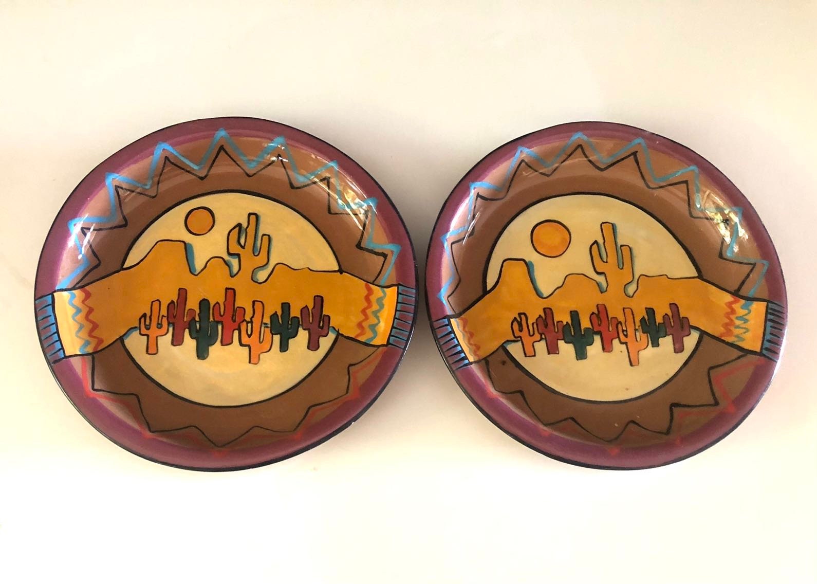 This is for a set of two 6.75" diameter small plates. The plates are decorated with a saguaro cactus print on a Mexican serape blanket and are hand painted.