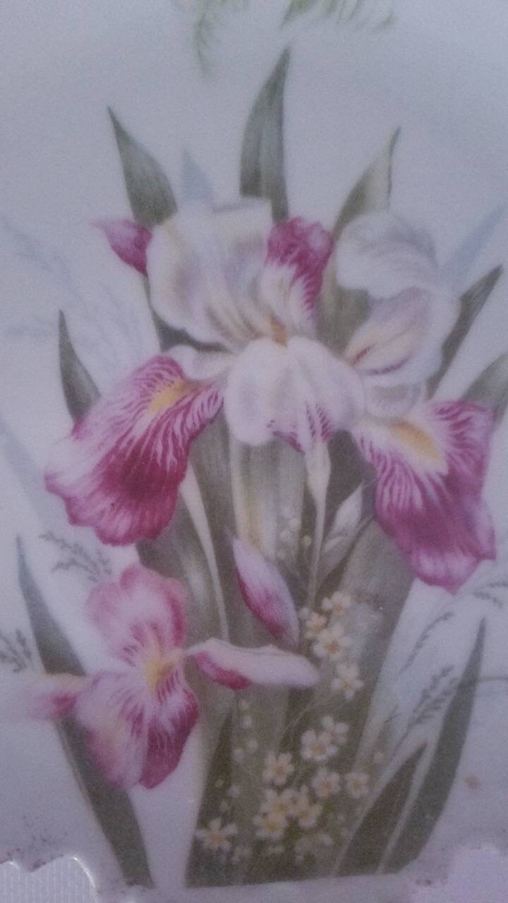 There is a very faint hairline on the back that does not go through to the front. The flower is a hand-painted iris.