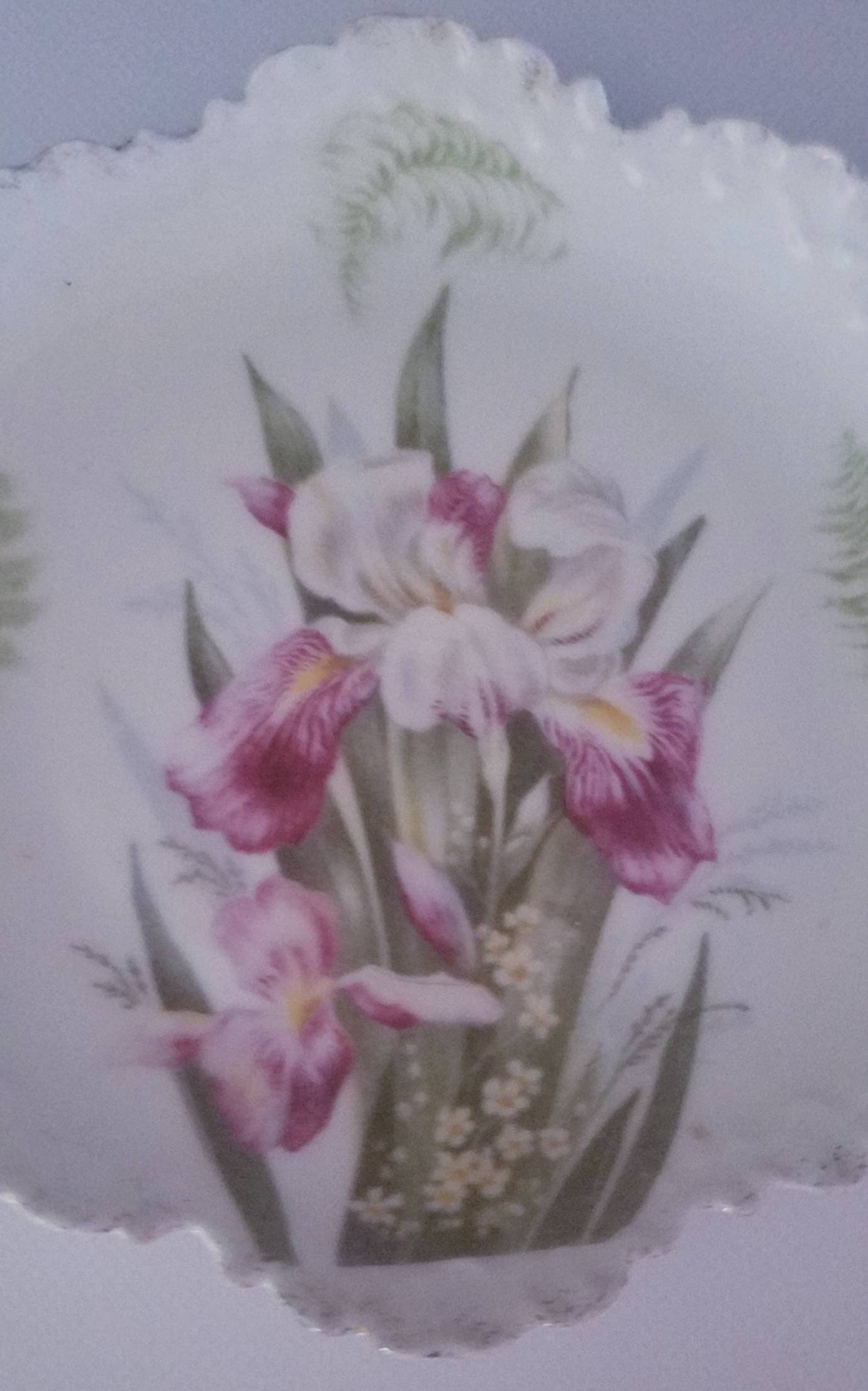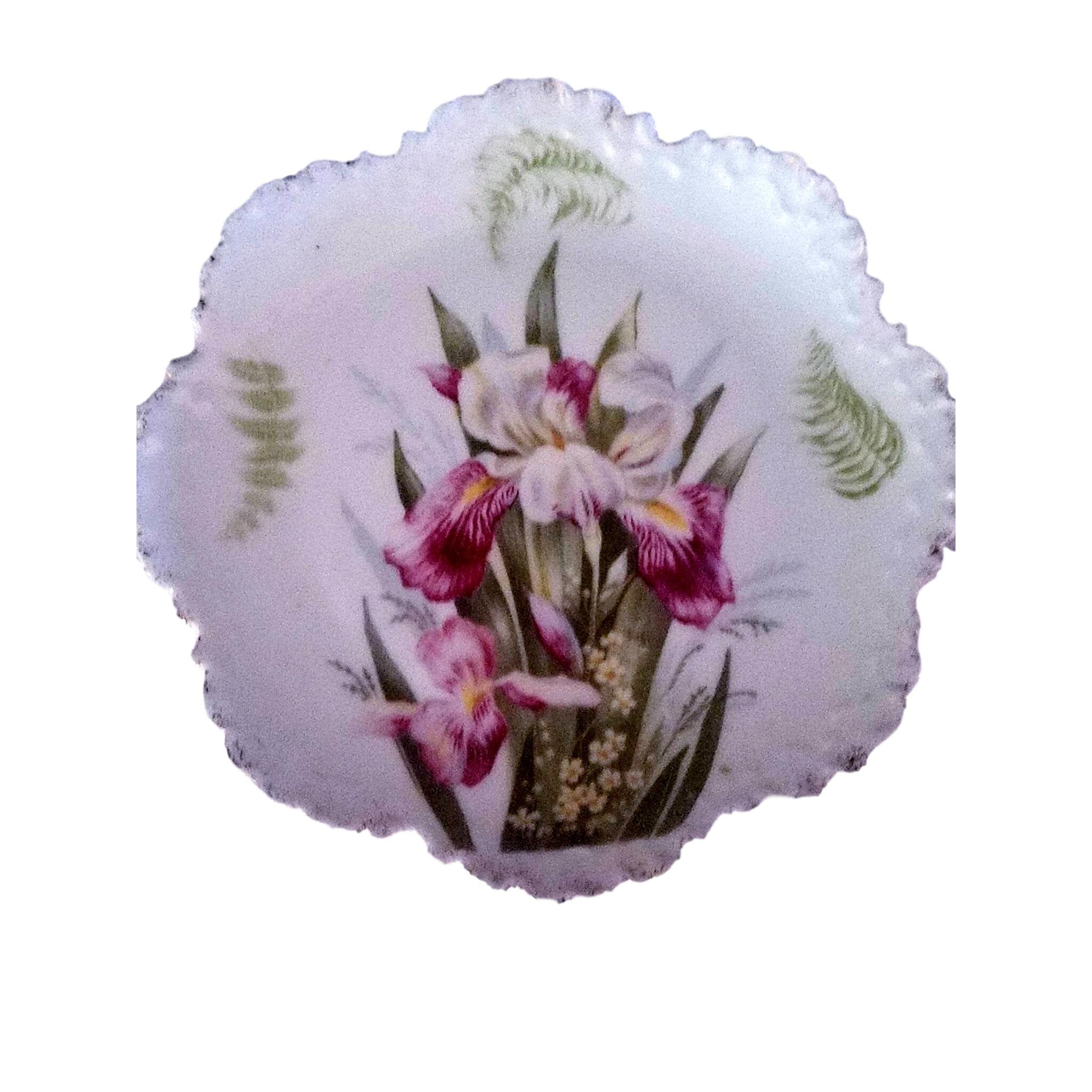 This is an antique, hand-painted scalloped plate. This is a Monbijou china plate from Bavaria by RC Rosenthal. It measures 6 inches in diameter, or 15.24 cm in diameter, with a scalloped or ruffled shape. The small plate was made between 1896 and 1907. This is a floral dish in purple, pink, and green colors on a white background.