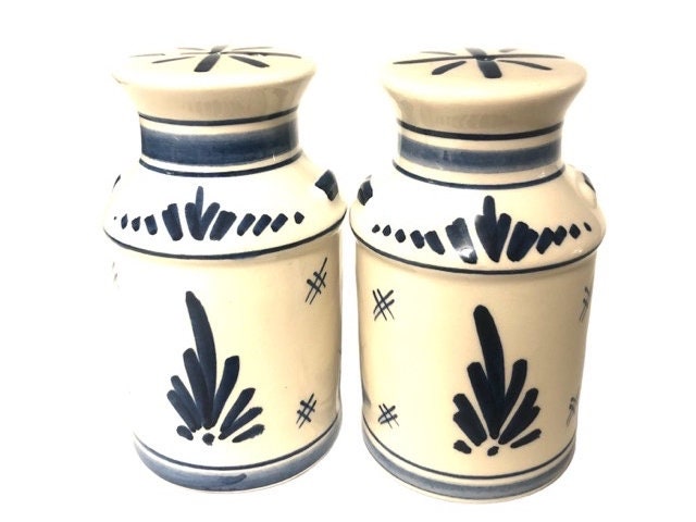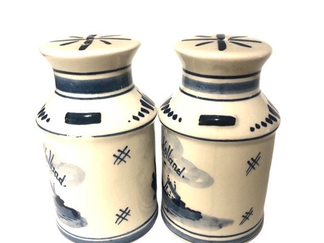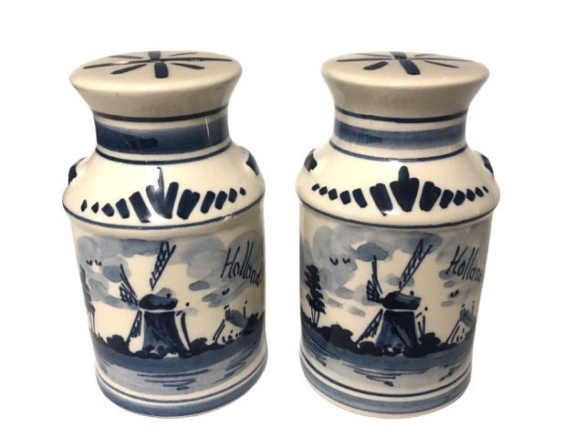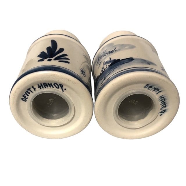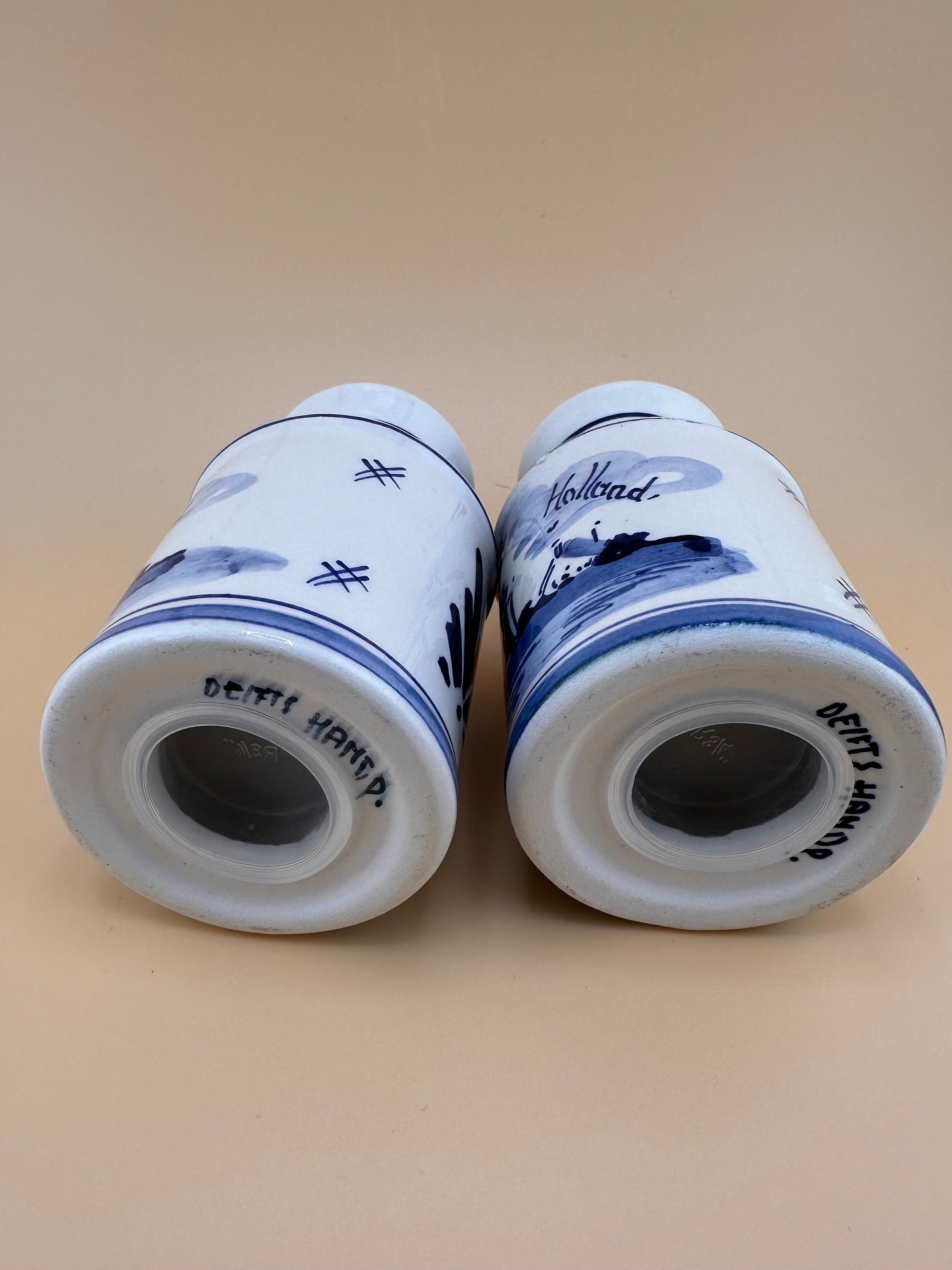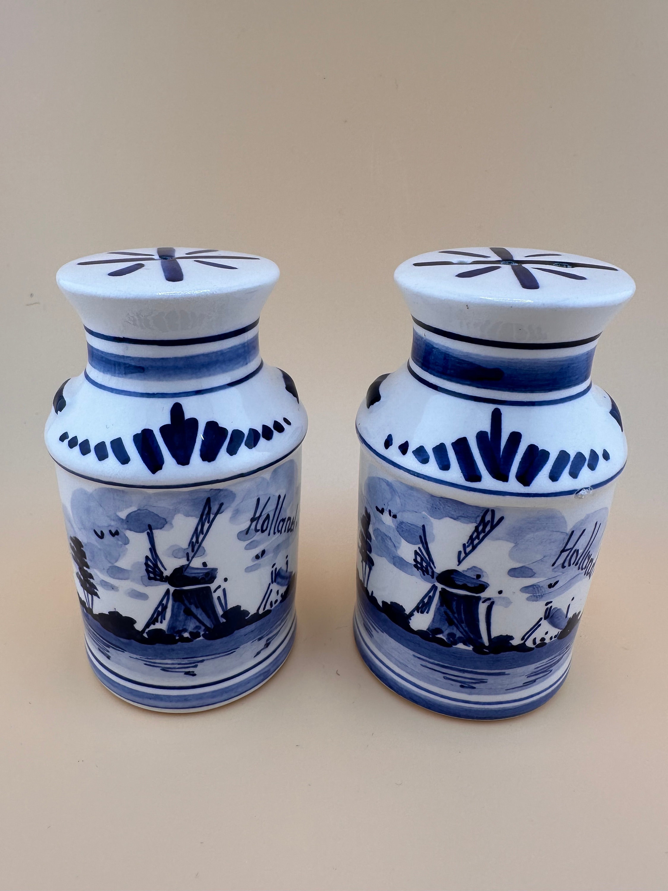 Vintage pair of hand painted blue and white Delft shakers in perfect condition. There is a windmill and a home scene and the word "Holland" on each shaker.