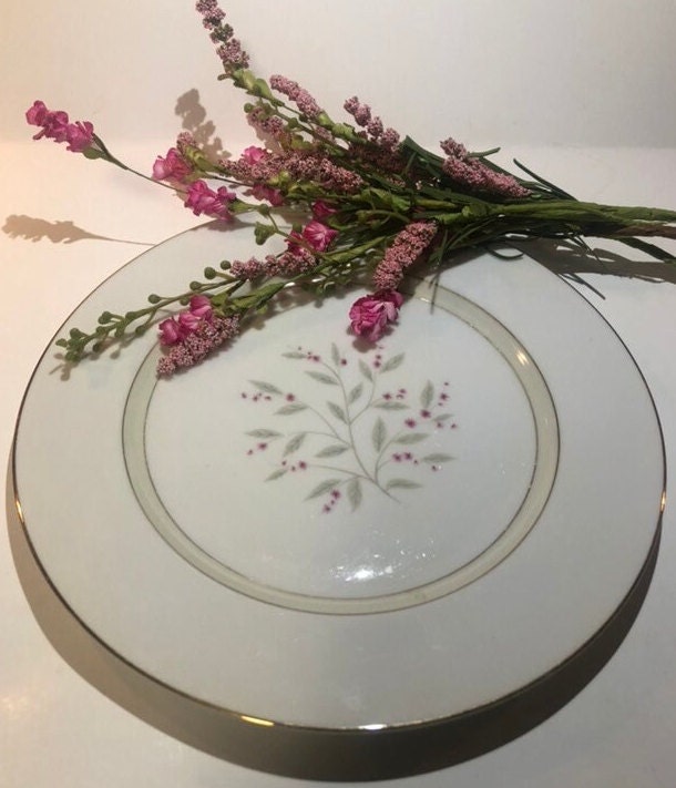 This is a mid century Mikado china dinner plate made in Occupied Japan. The vintage plate measures 10 5/8" in diameter. It has pink flowers with green leaves along with a cream band edge in gold. The beautiful plate has a delicate floral design that you are sure to love. The pattern is called "Debutante". Very good condition!