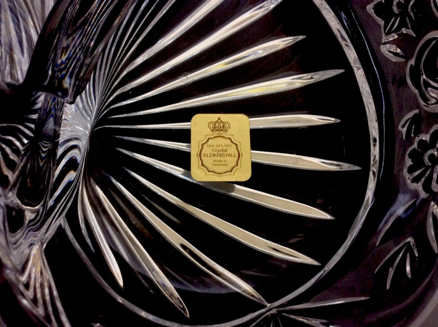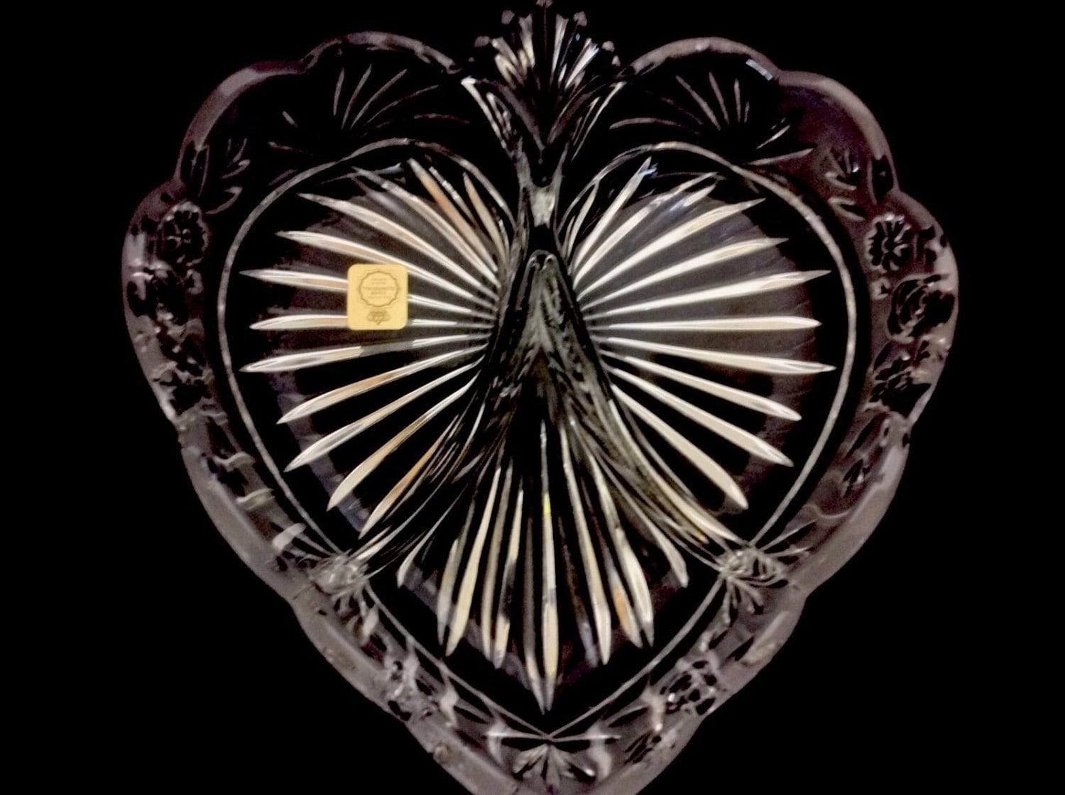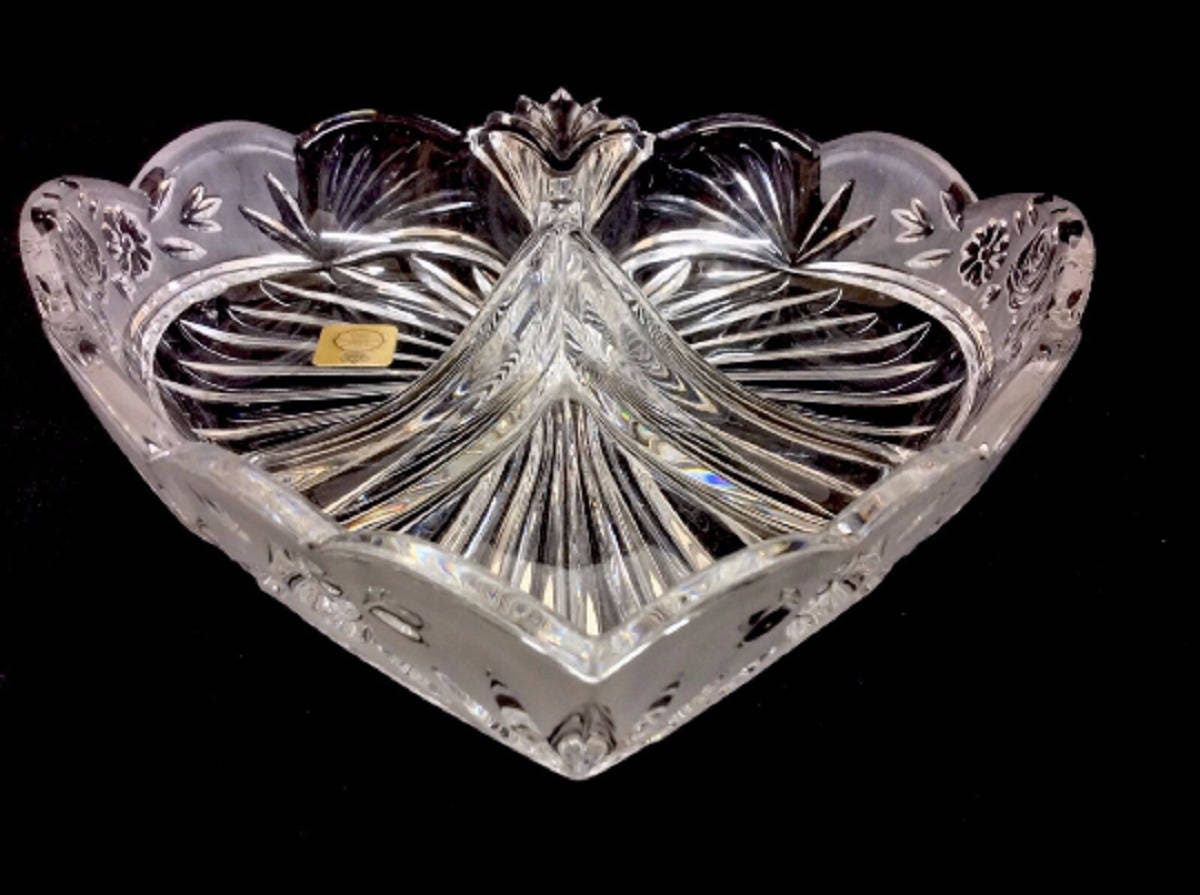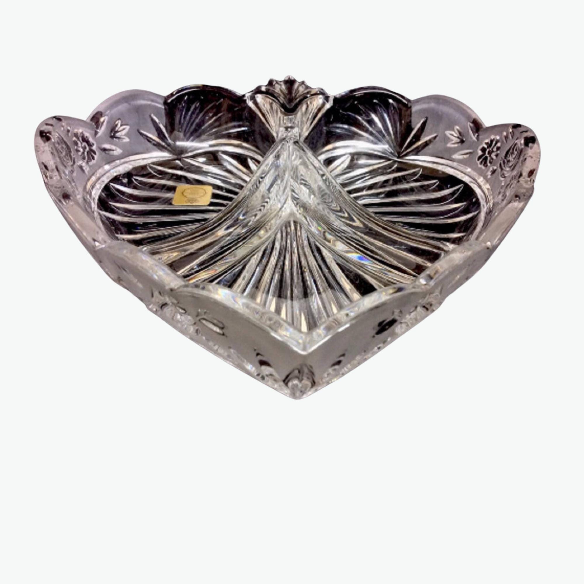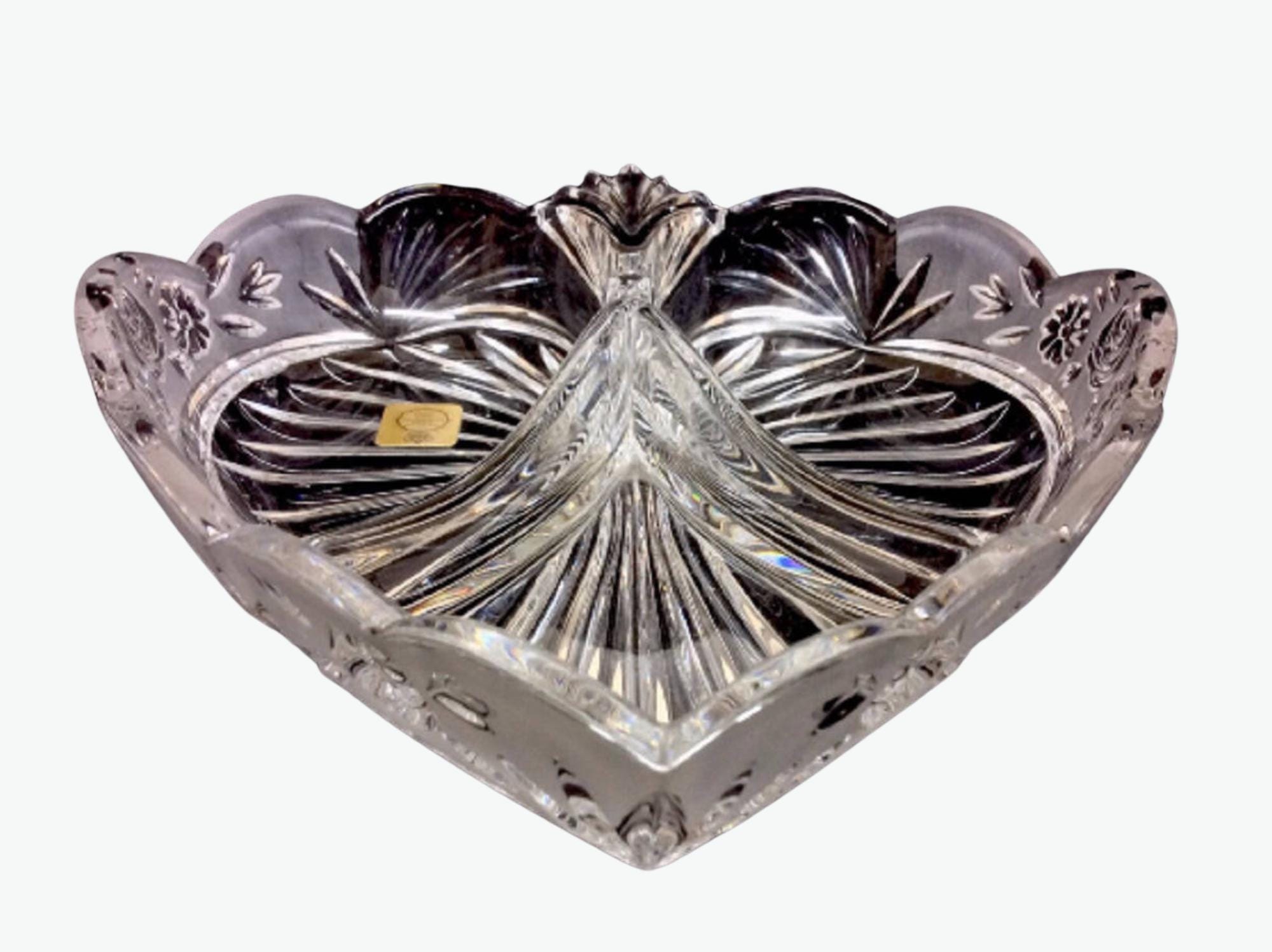 Bleikristall Oneida Southern Garden heart-shaped 3 part relish dish made in Germany. This German crystal has a frosted band with cut flowers. It has the original tag.