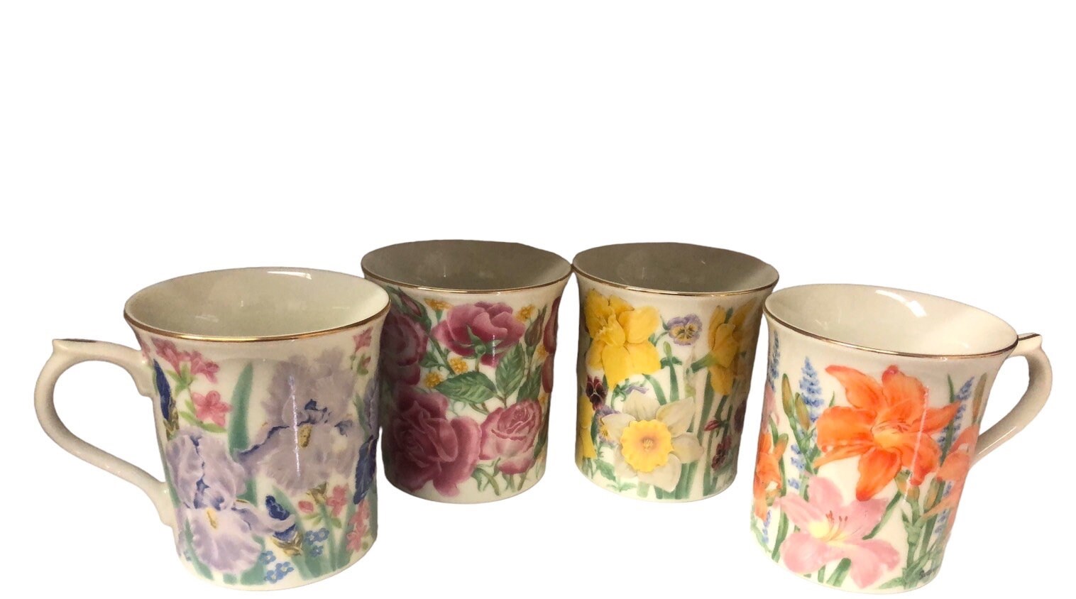 Vintage Lenox China Seasonal Flower Blossom Mug Collection of 4 fine porcelain coffee cups or mugs by Suzanne Clee.