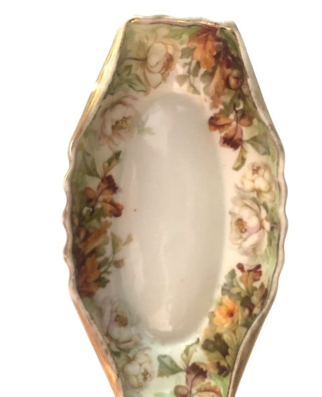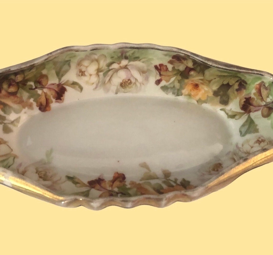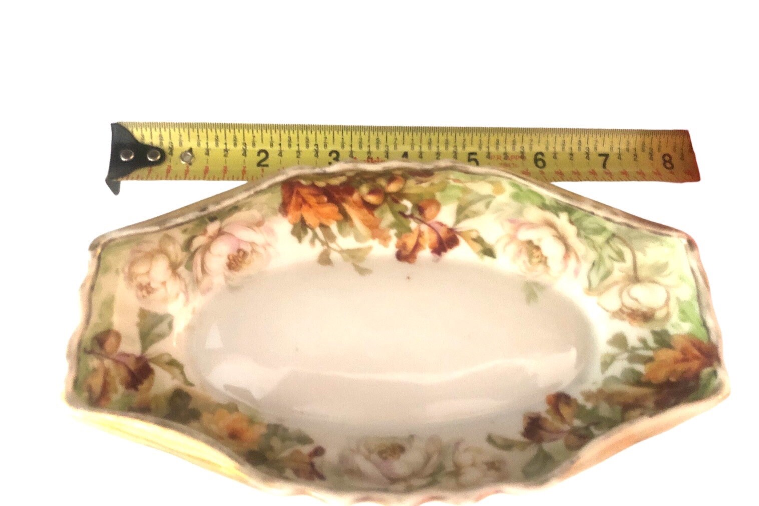 This old dish does show some wear on the gold painted scalloped rim. It measures 7.5 inches in length and 1" tall.