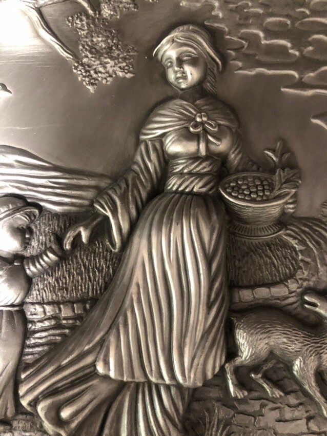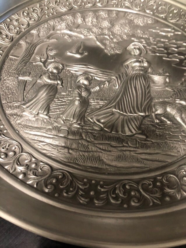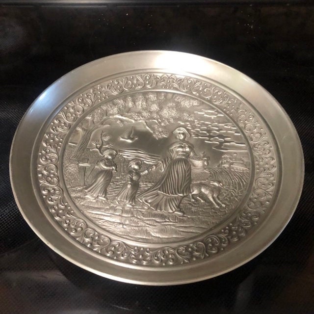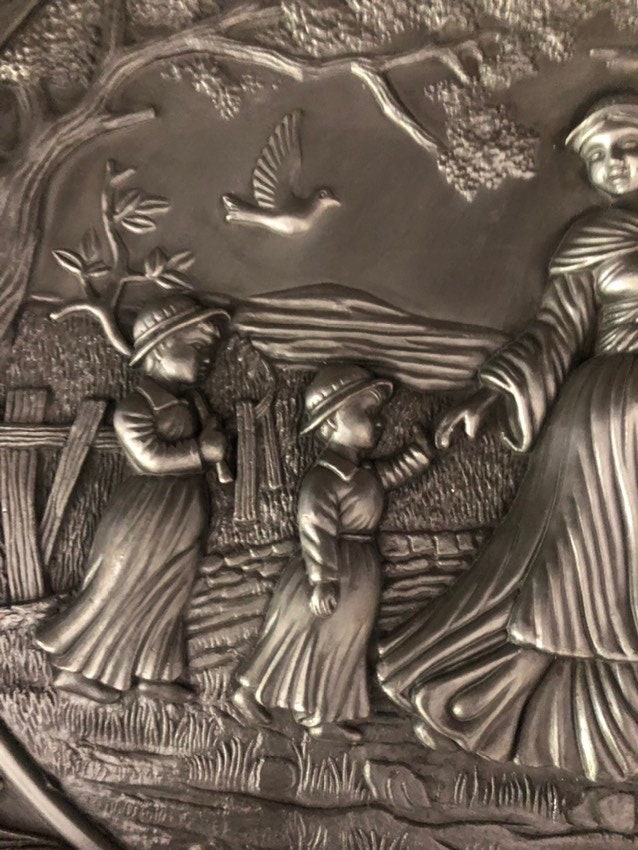 Vintage Pewter Wall Plate: High Relief Mother and Children Decor
