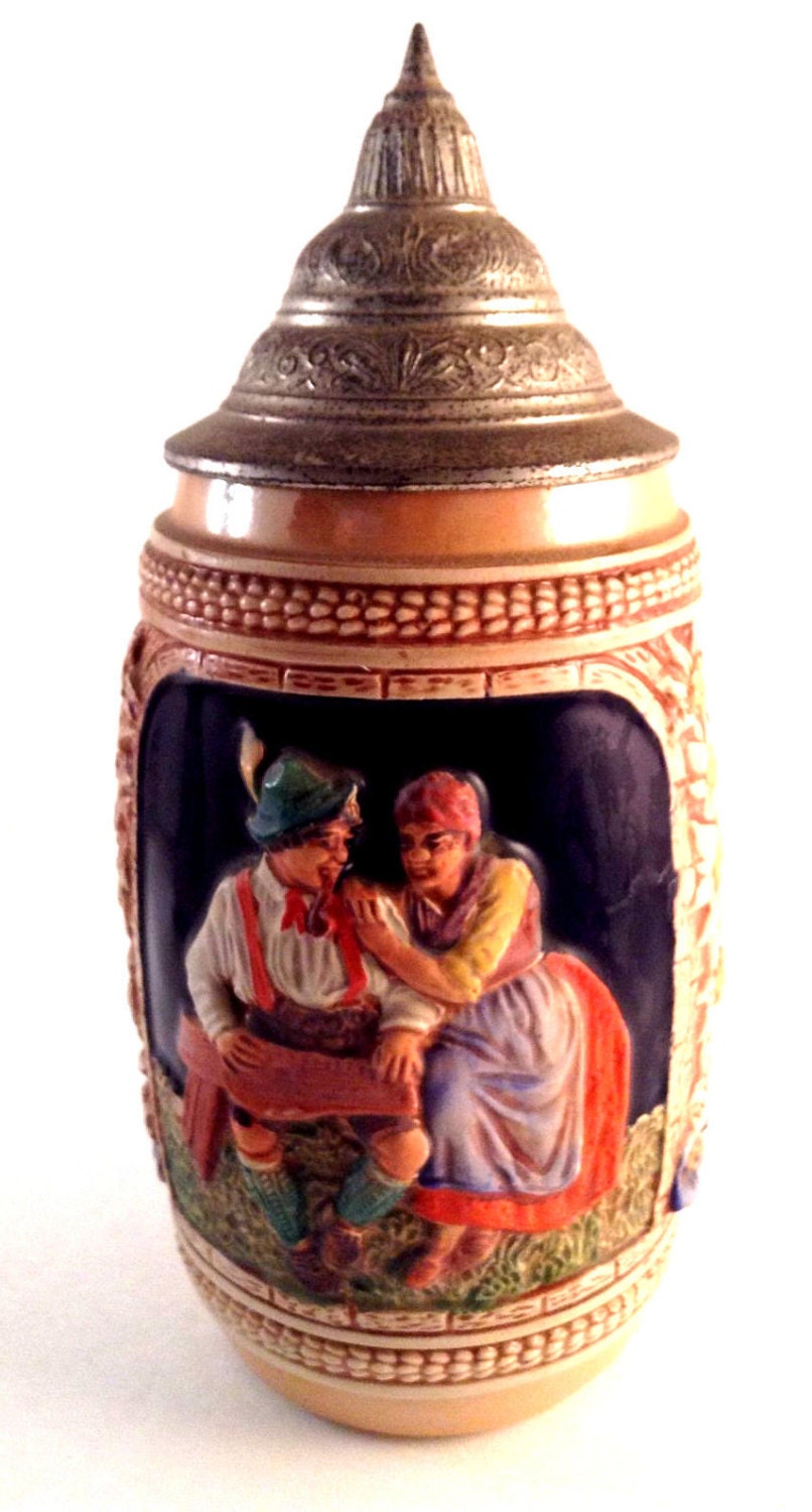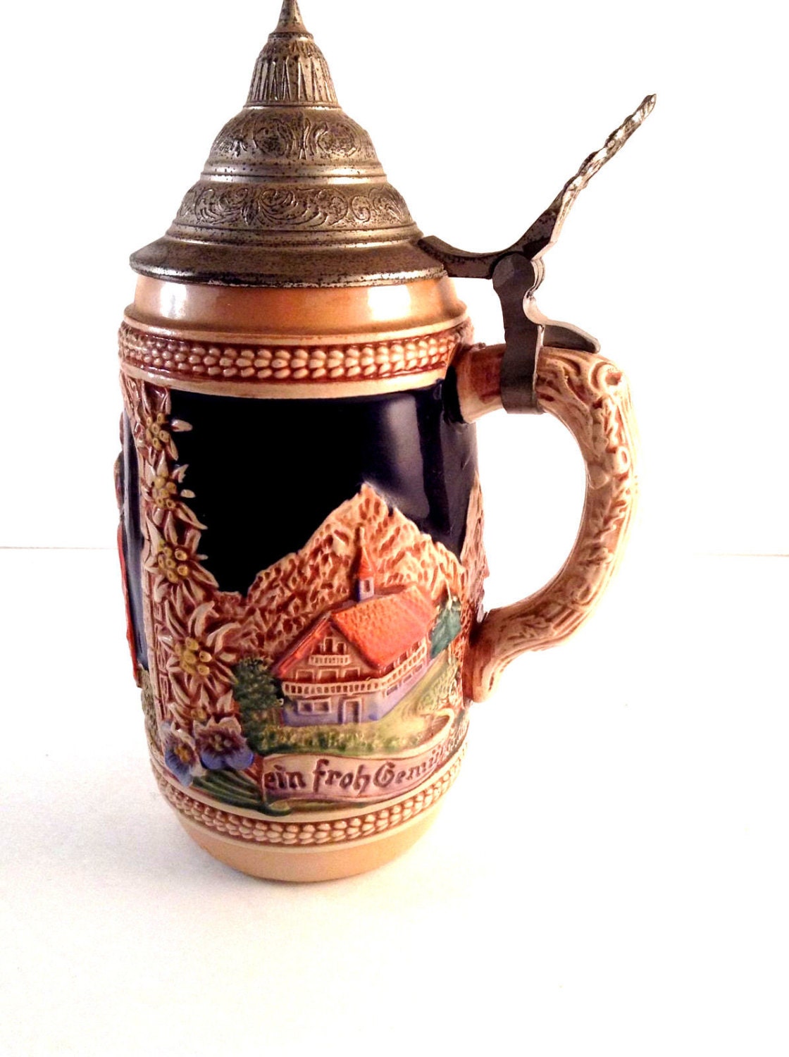 Here is a gift idea for dad for Father's Day. This is a vintage hand painted German beer stein. The beer mug has an attached metal lid and has a three-dimensional design.