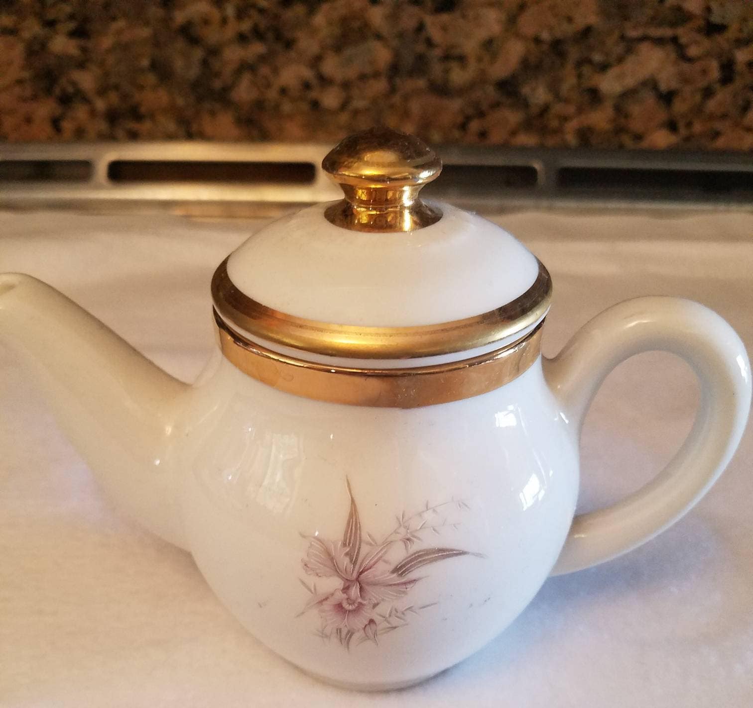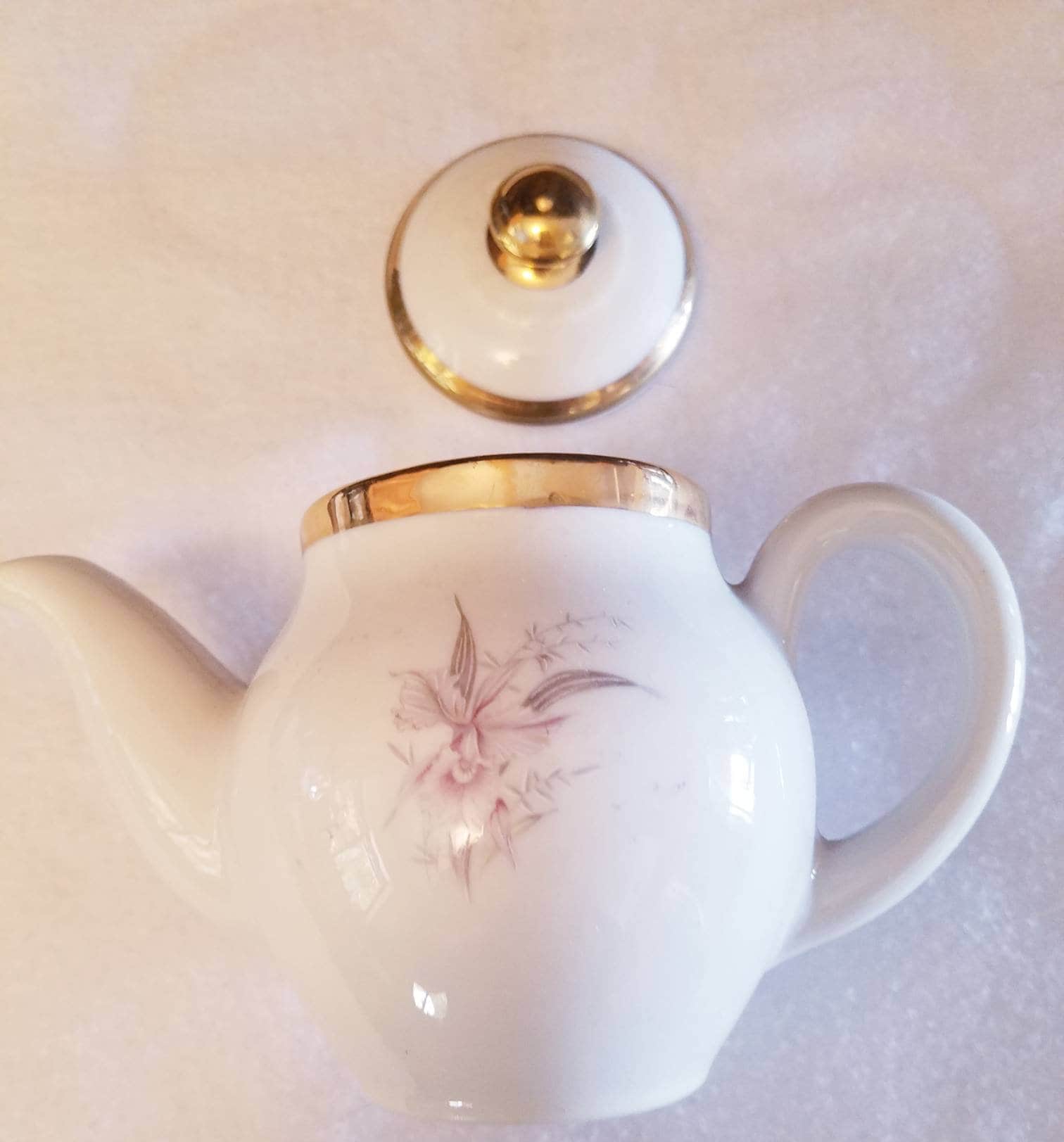 Syracuse China ceramic teapot vintage with orchid flowers. The small teapot measures 5" high and from spout to handle measures 7 inches. What a great gift for for her!