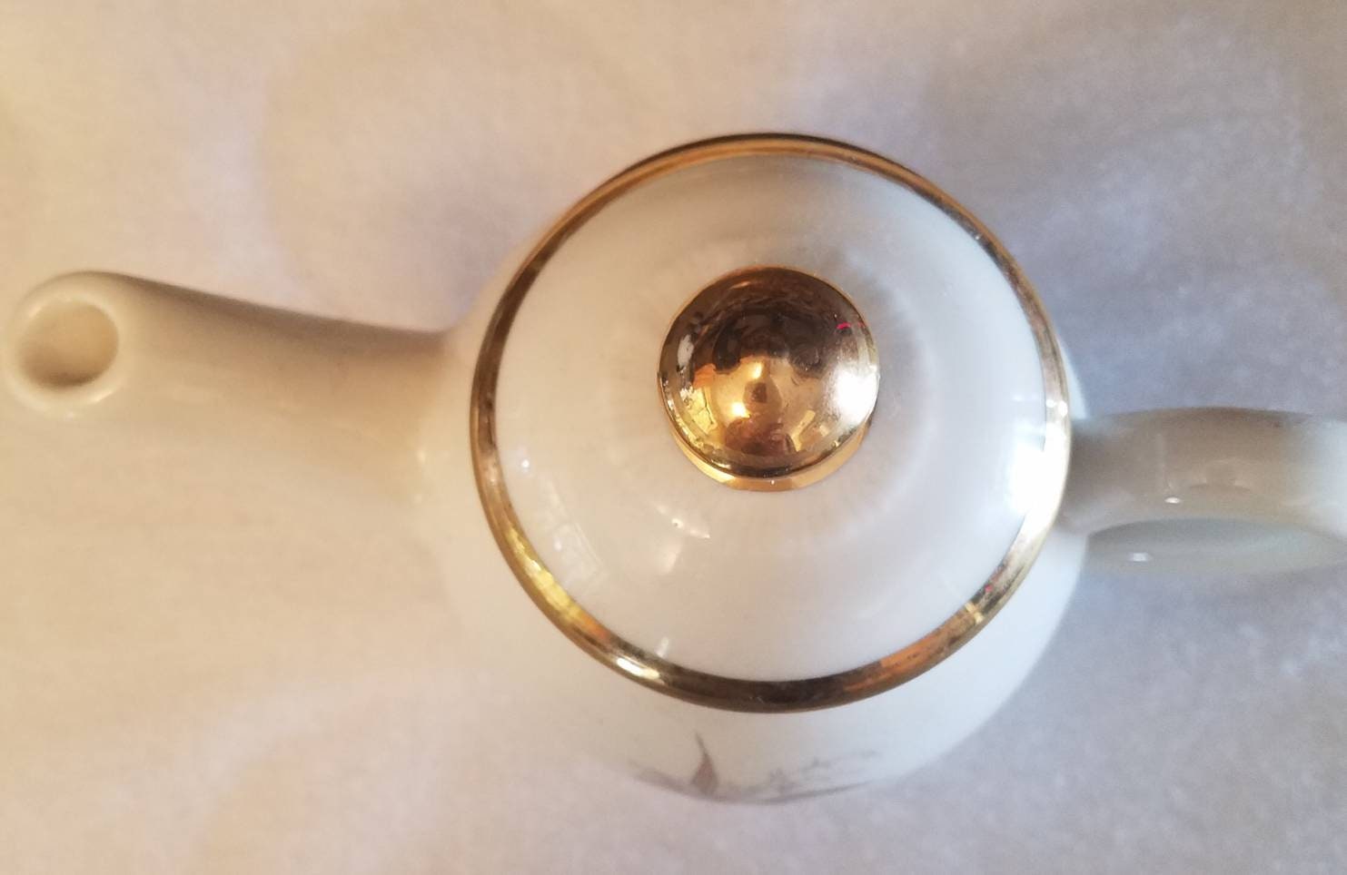 The floral teapot is trimmed in gold and has a purple orchid flower on the front. There is a little paint loss on the knob lid. No chips, cracks or crazing. You will enjoy sipping tea for one from this orchid teapot! Great gift under $50