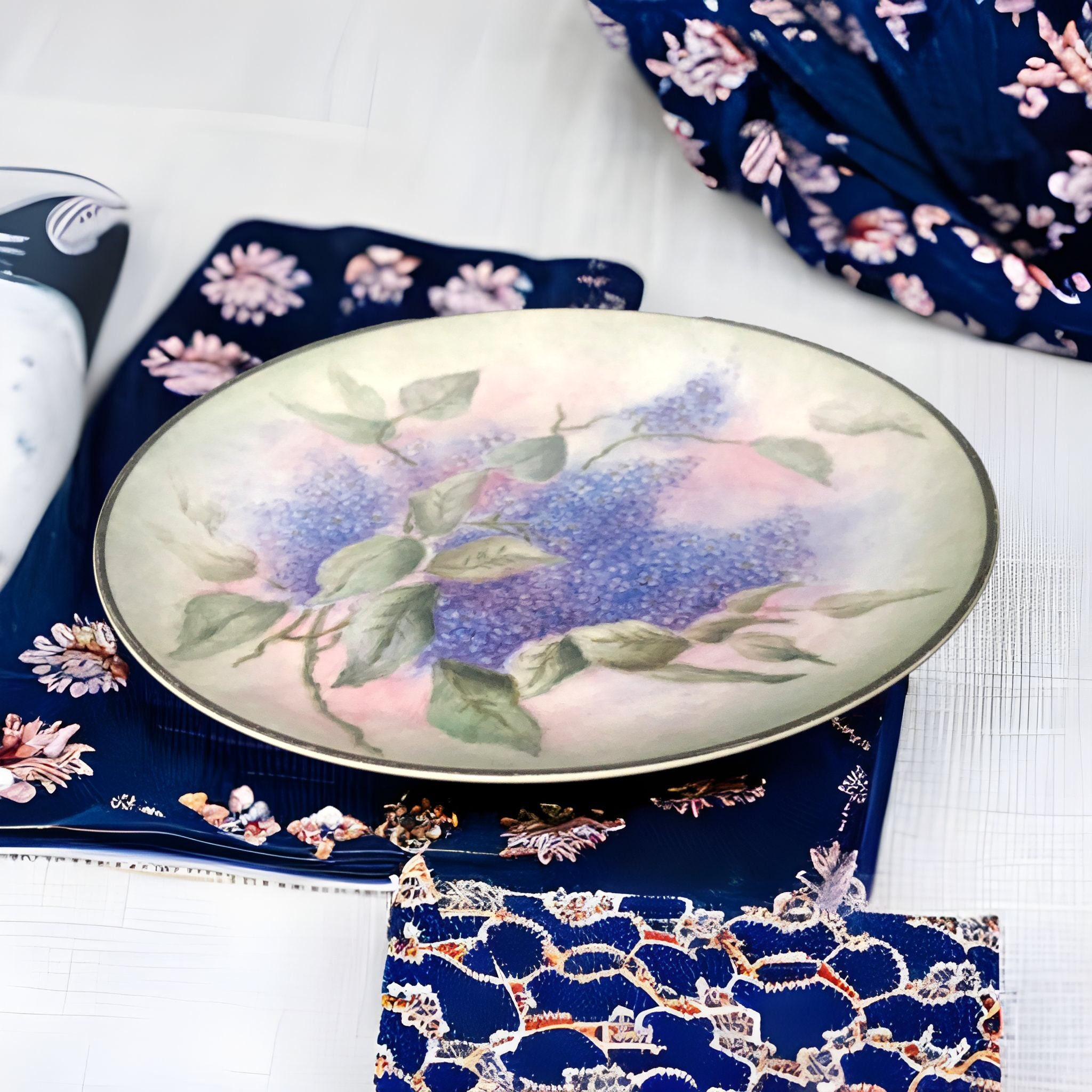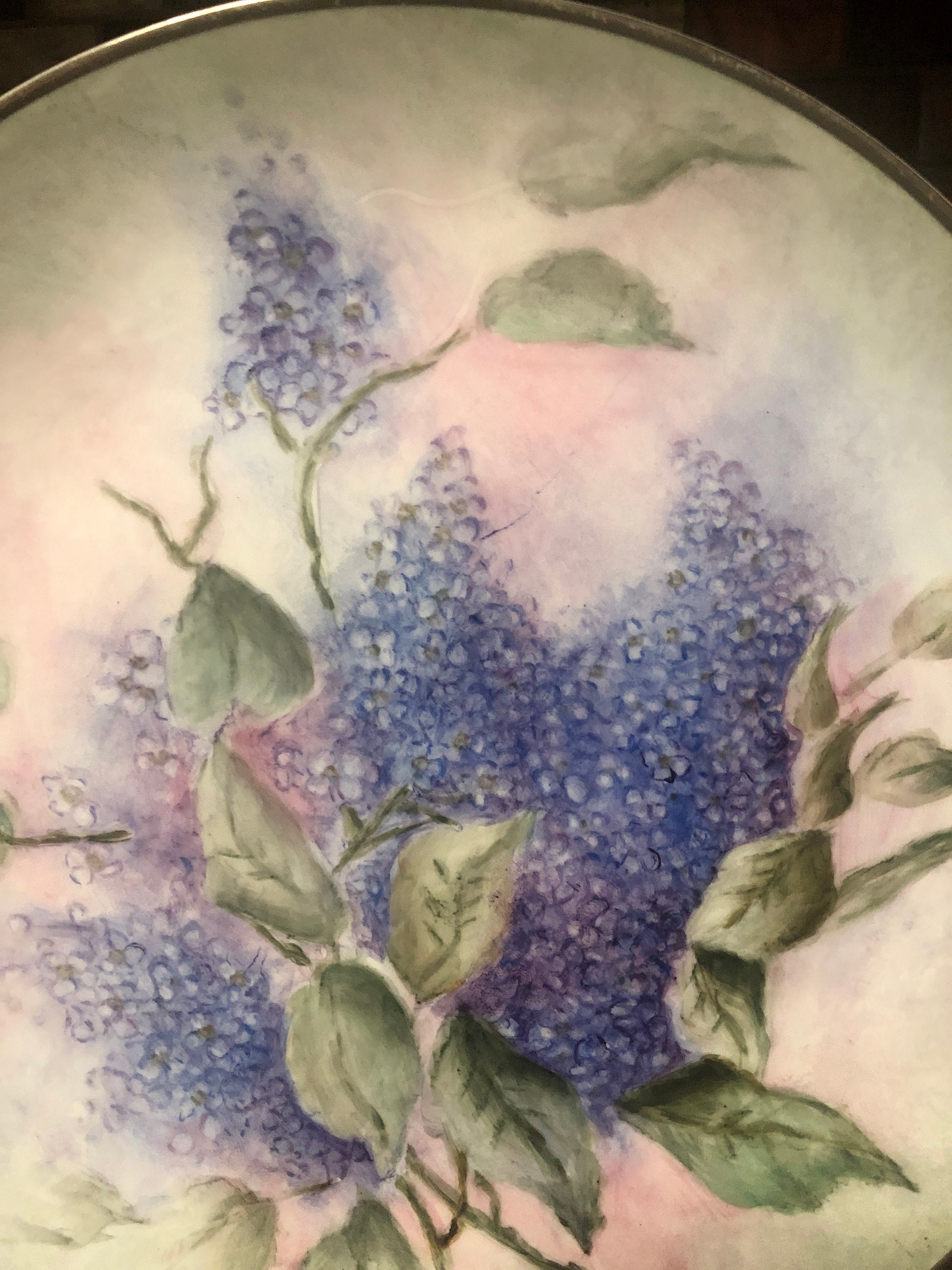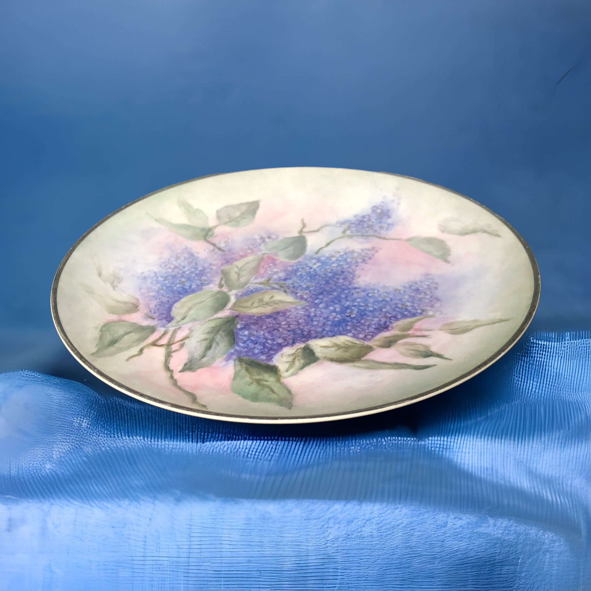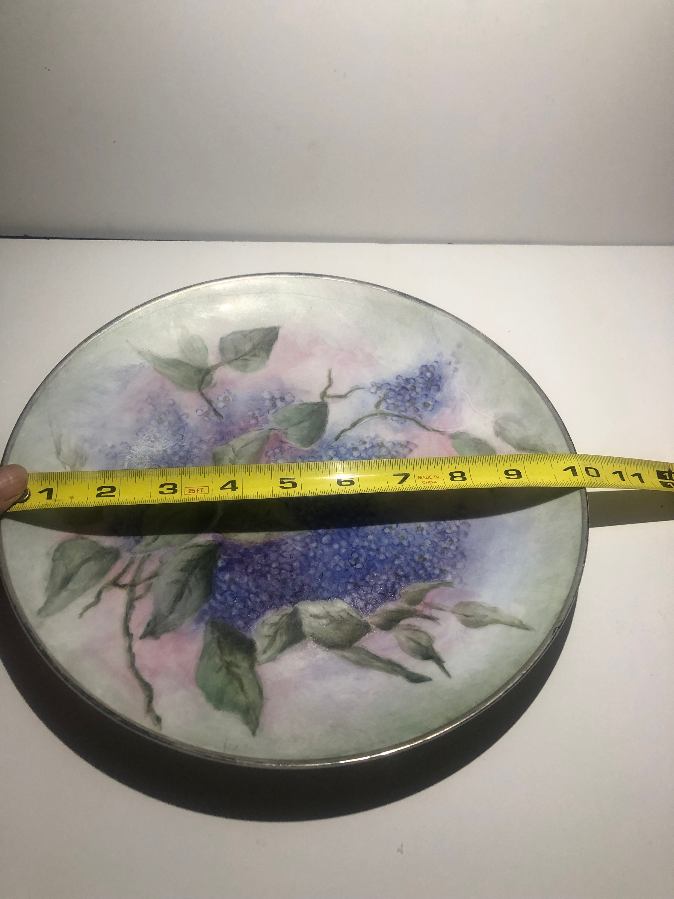 The flowers appear to be lilacs. It has a silver border on the rim. The vintage plate measures 10" in diameter.