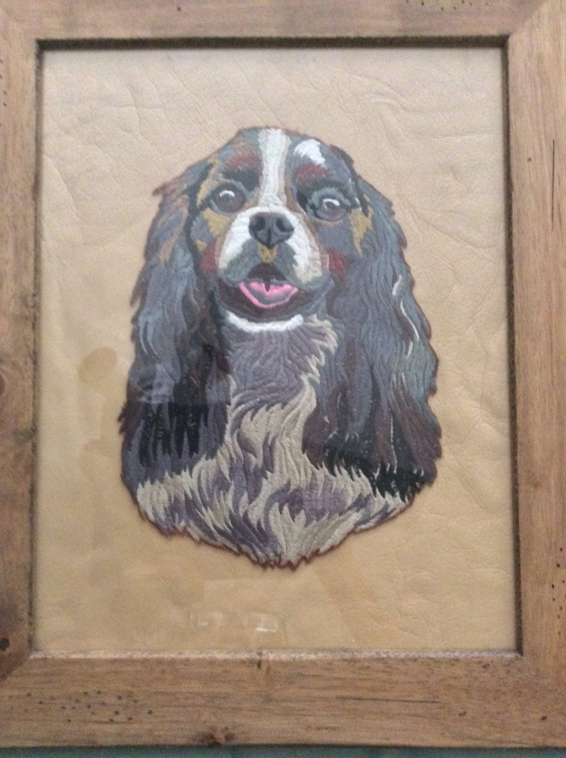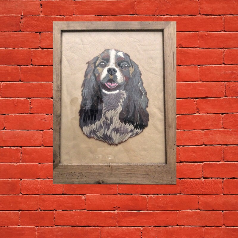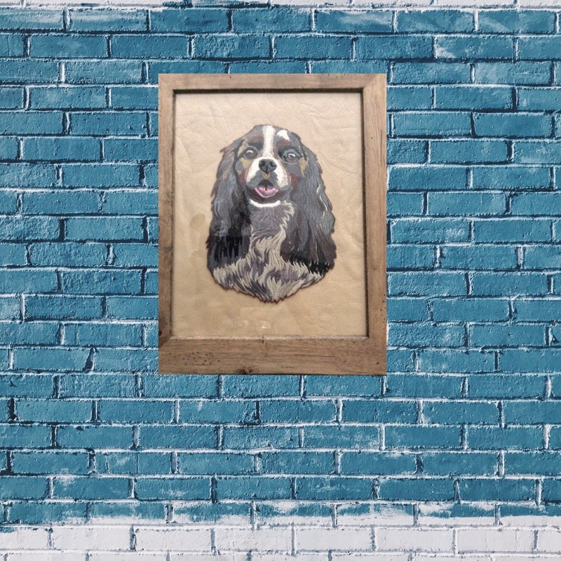 This dog memorial was embroidered on 100% genuine rawhide leather. It is mounted in a beautiful wooden frame.