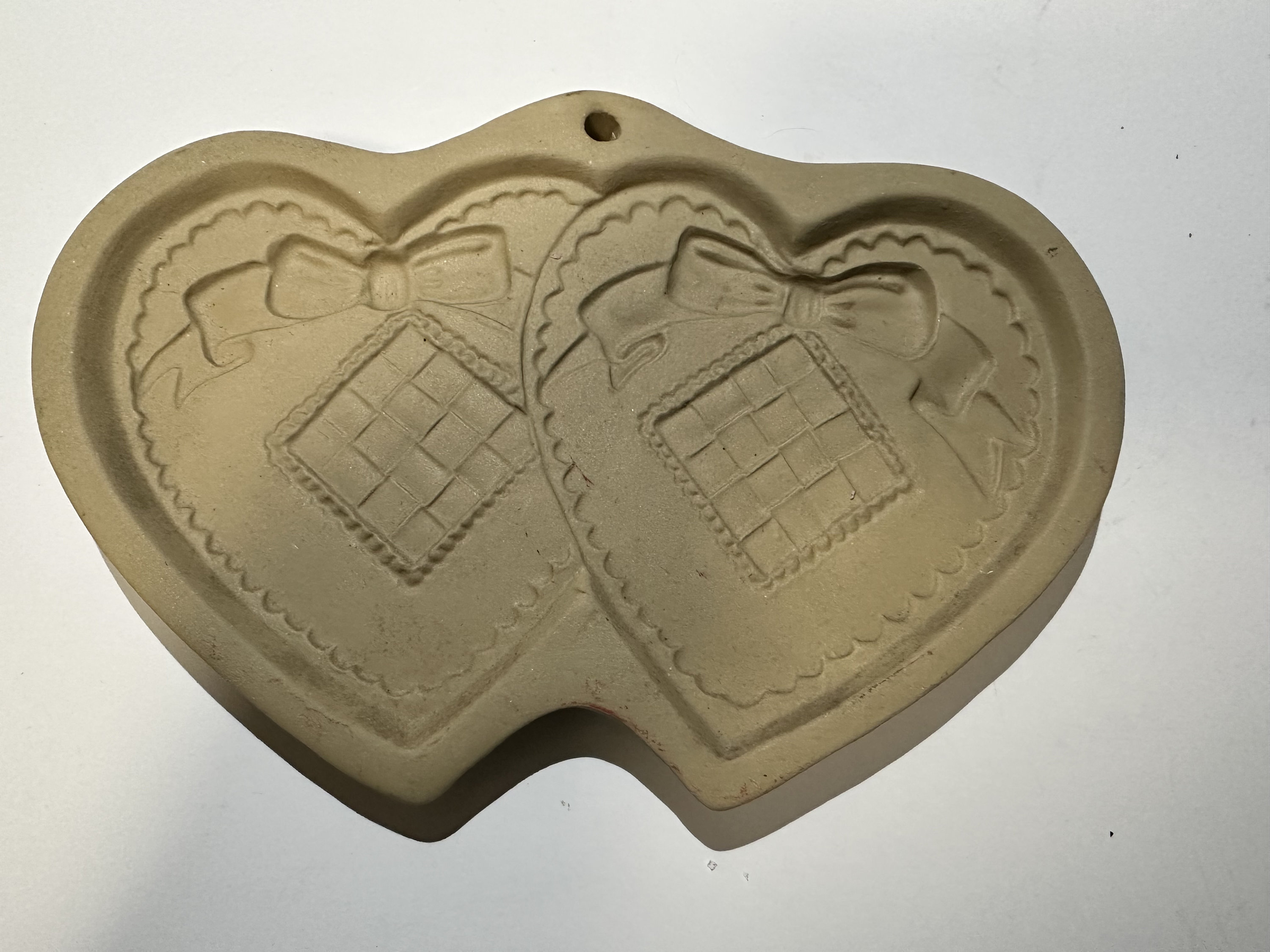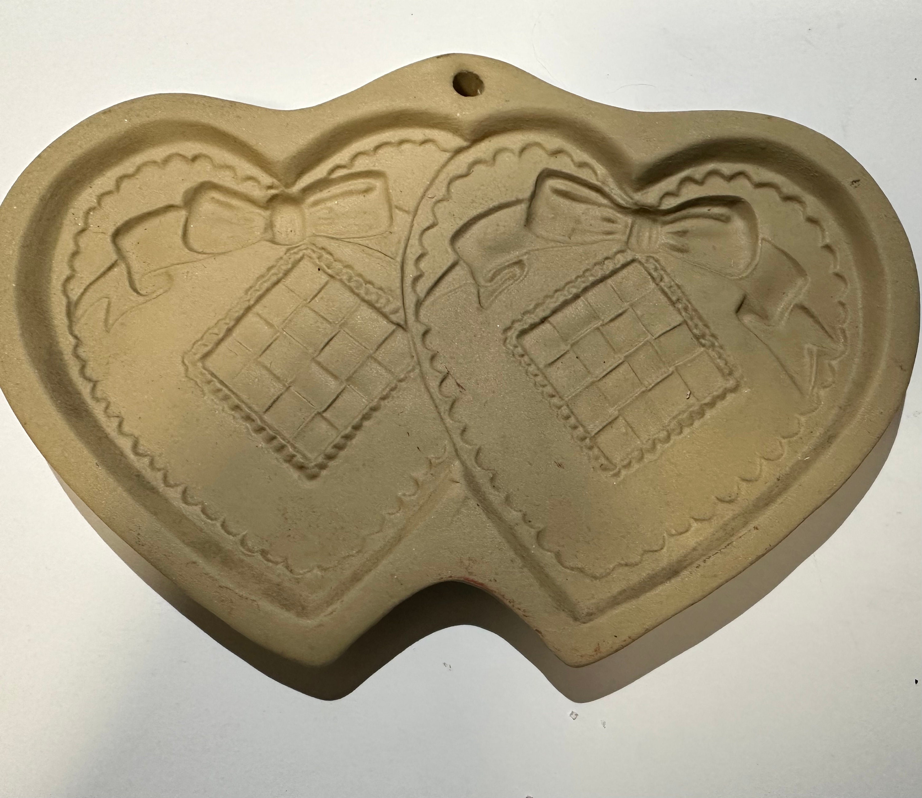 This a vintage stoneware Brown Bag Cookie Art mold with a double hearts design. Its deep detail will give your finished artwork more dynamic beauty.