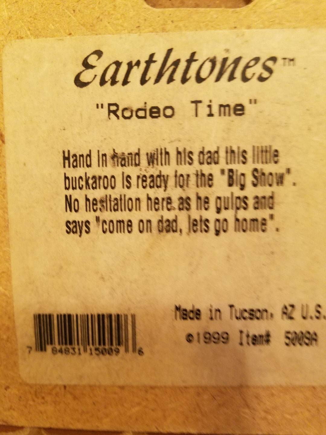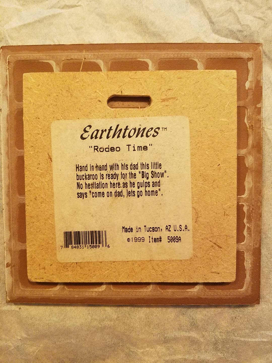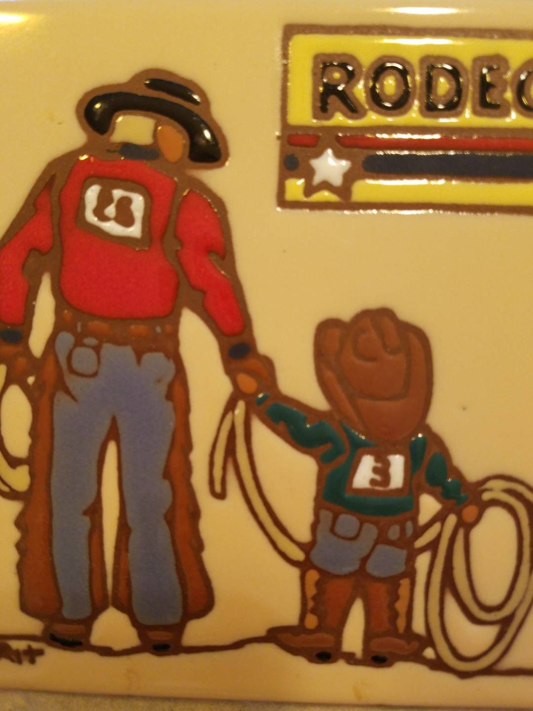 This is a 6x6 ceramic art tile by Earthtones. The tile art is called "Rodeo Time". Hand in hand with his dad this little buckaroo is ready for the "Big Show". No hesitation here as he gulps and says, "come on dad, let's go home". This kiln fired tile was made in Tucson in 1999.