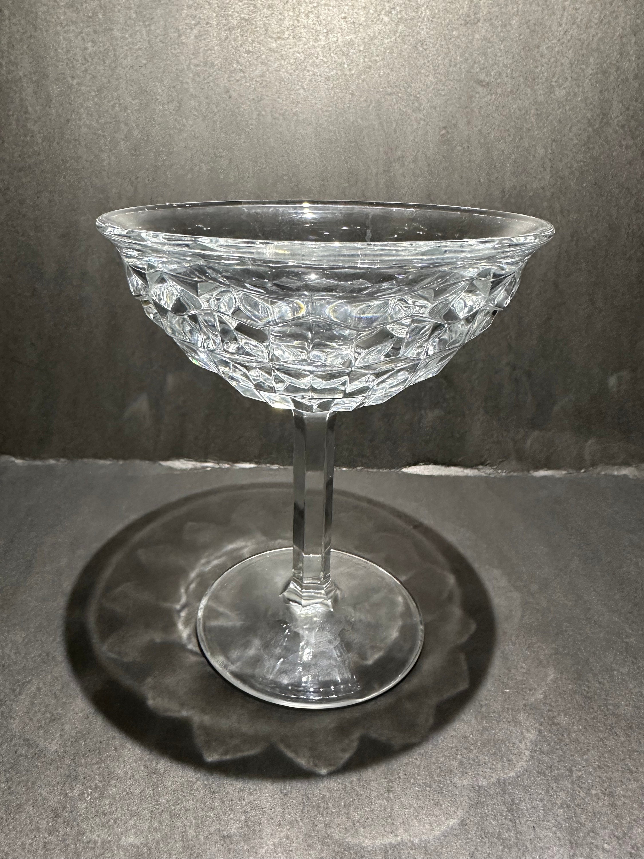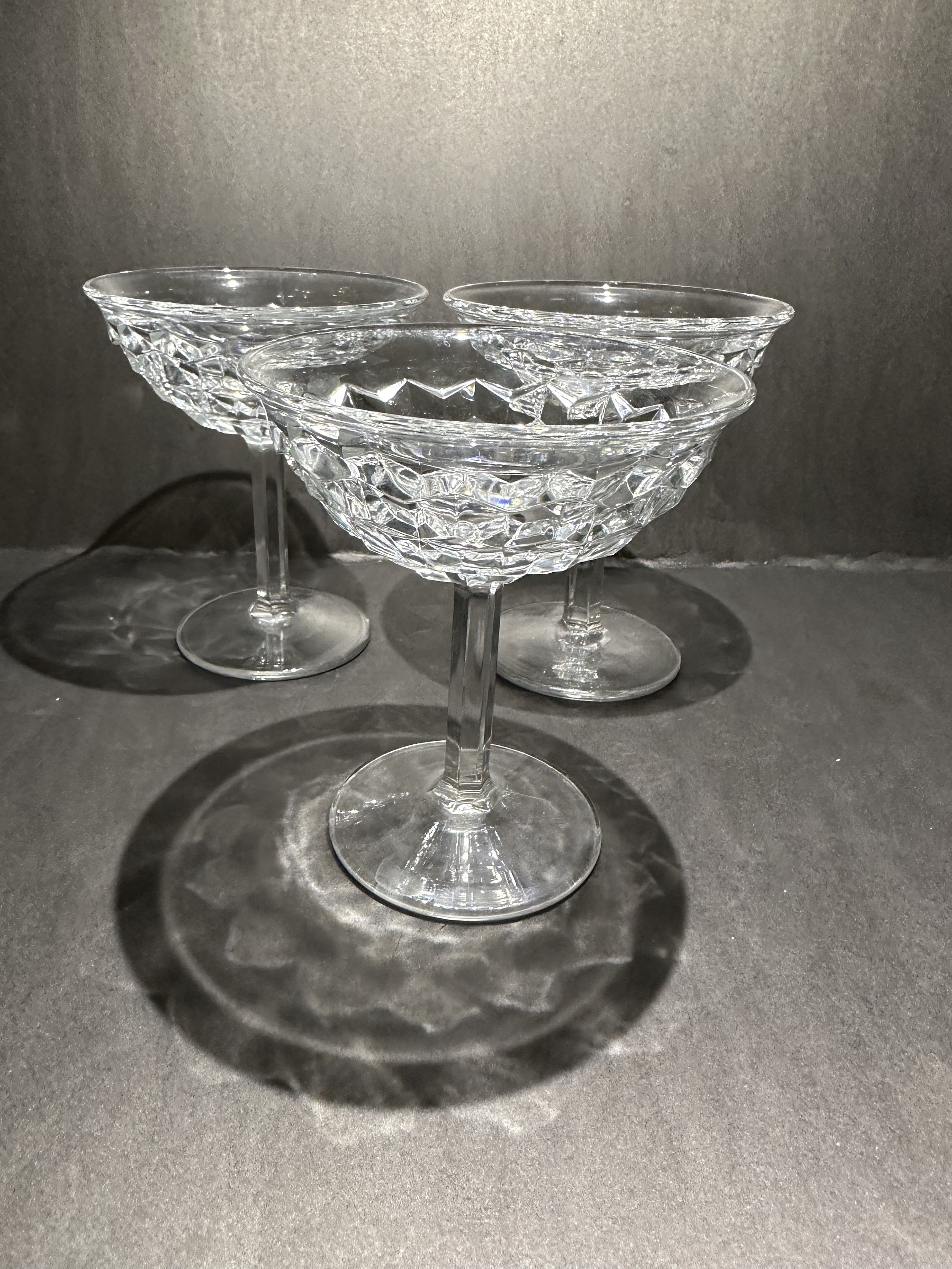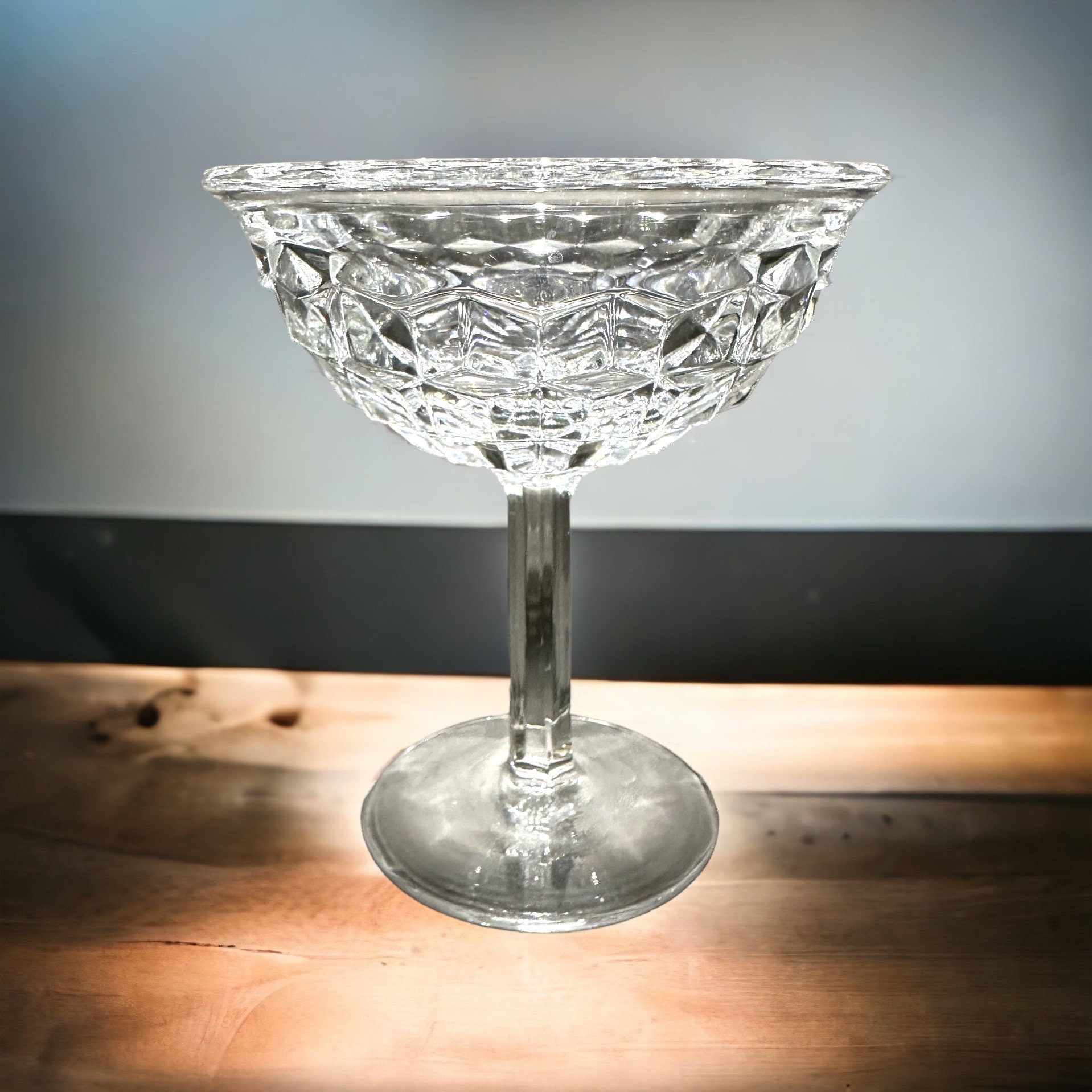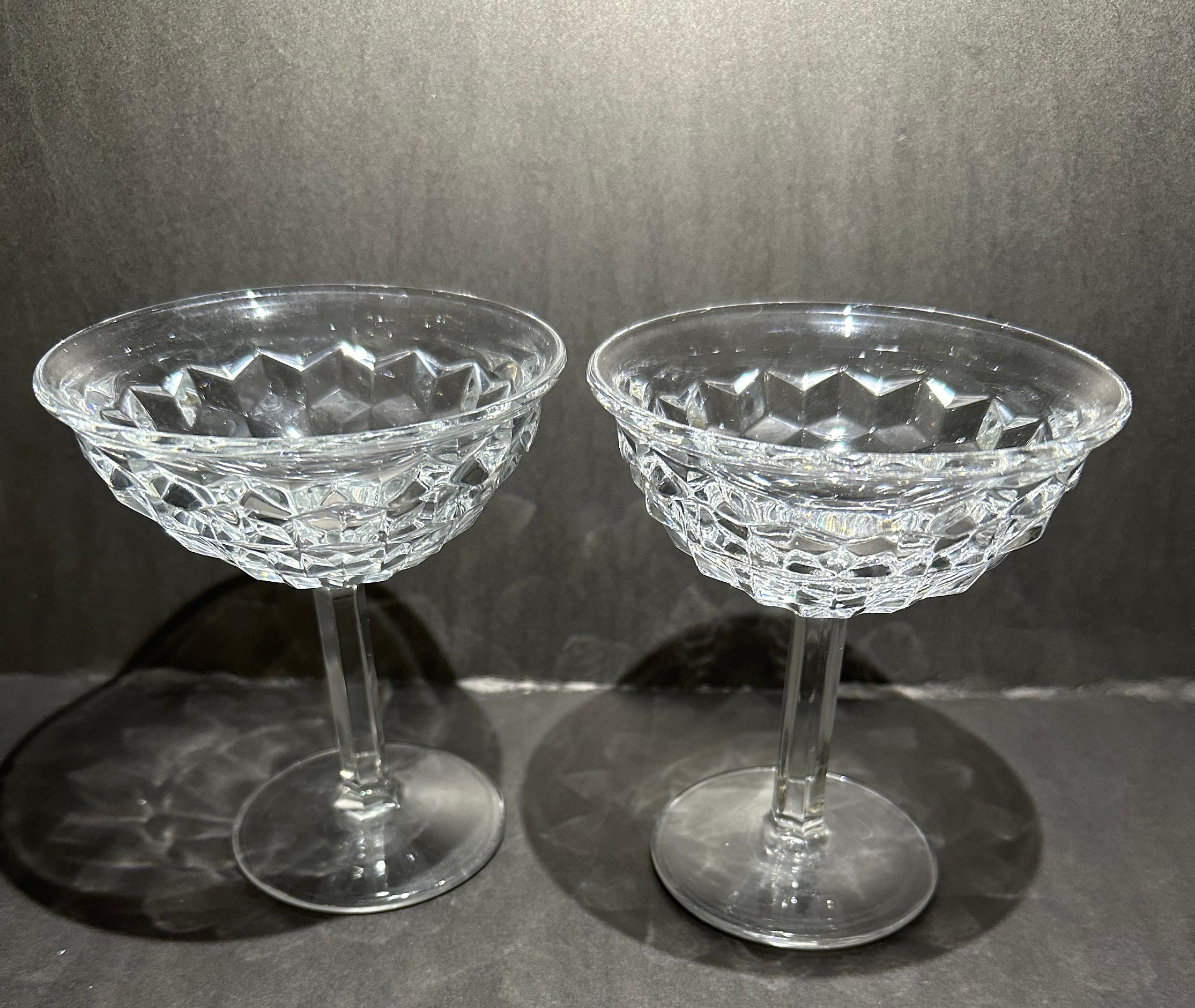 Elevate your celebratory moments with these stunning vintage Fostoria glass American stemware champagne goblets, radiating timeless elegance and sophistication. Crafted from clear crystal, these exquisite goblets are perfect for toasting life's special occasions or simply enjoying a bubbly drink, making them a must-have addition to your vintage glassware collection—grab yours today and savor the joy they bring!Mid-century vintage Fostoria American crystal, tall champagne/sherbets.