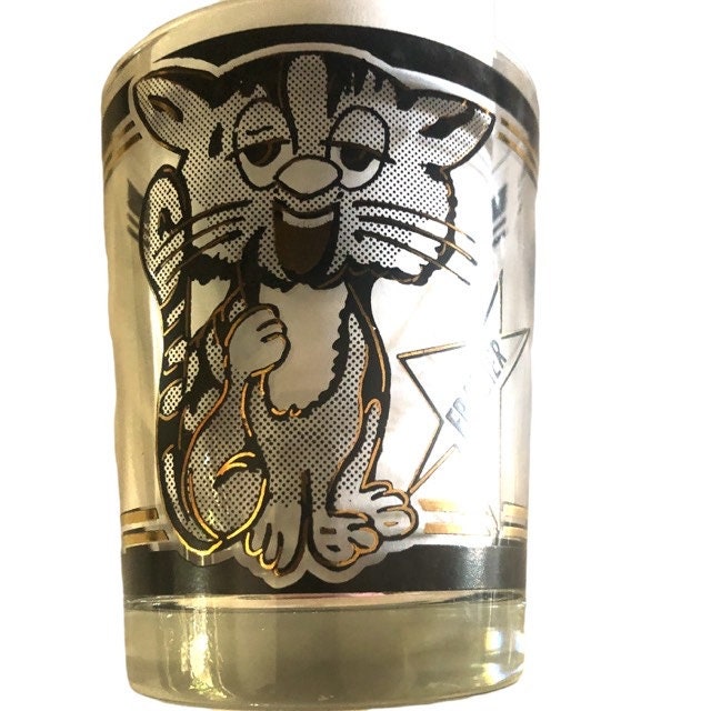 These collectible glasses are part of a charming series showcasing various animals with unique names, making each piece a delightful conversation starter or gift for feline enthusiasts. Whether you're adding to your vintage barware collection or searching for a fun, nostalgic gift for a cat lover, these glasses are sure to bring a touch of whimsy and elegance to any occasion.
