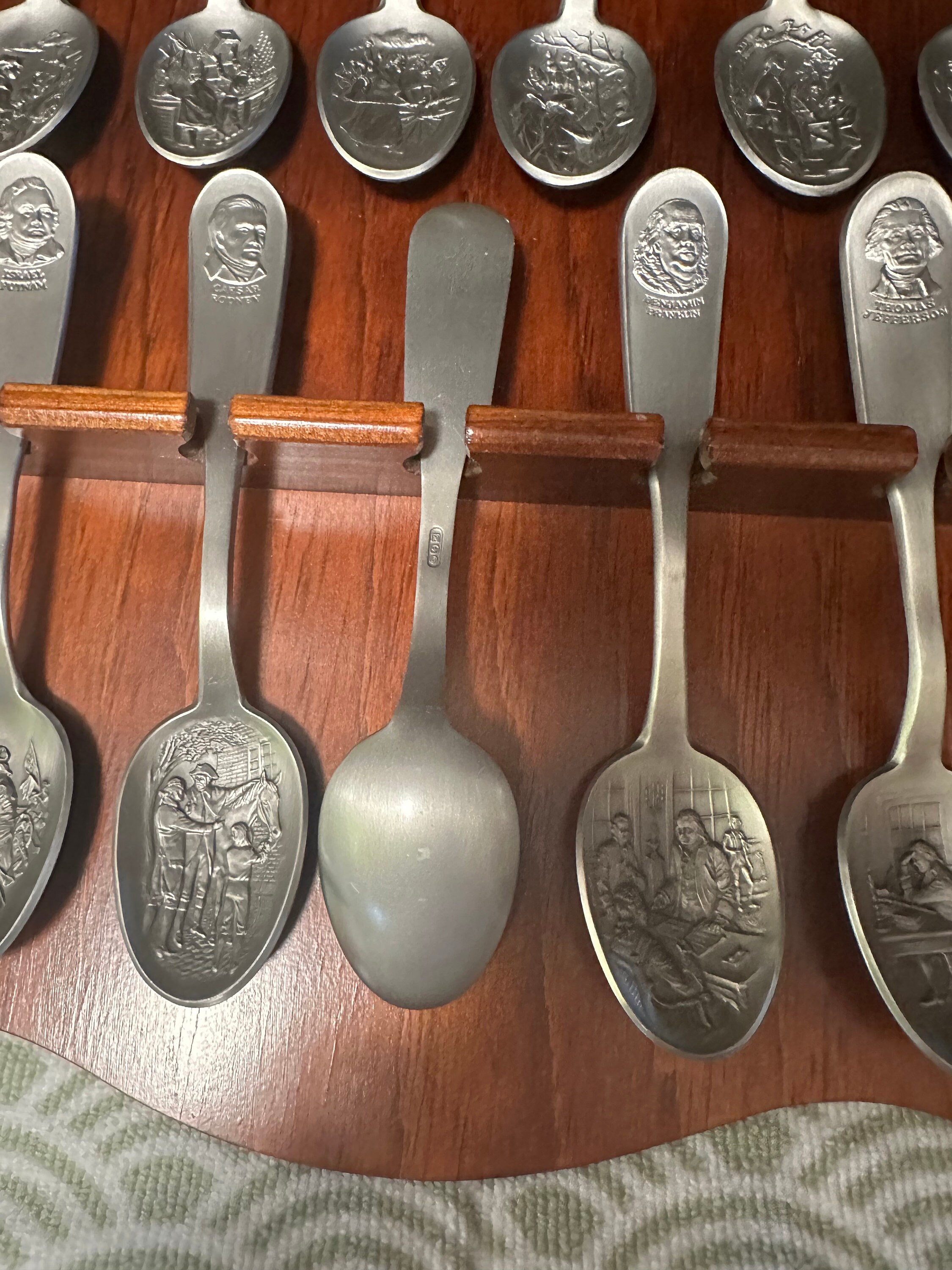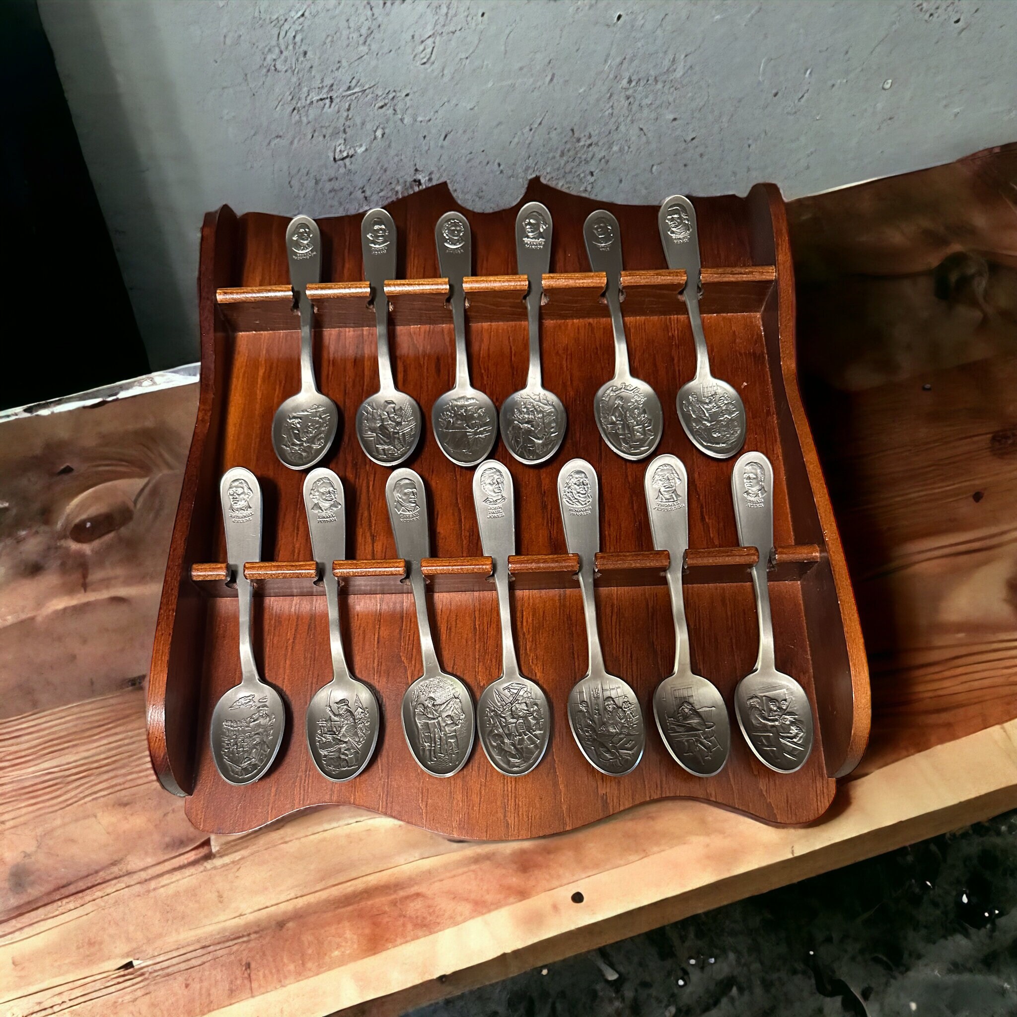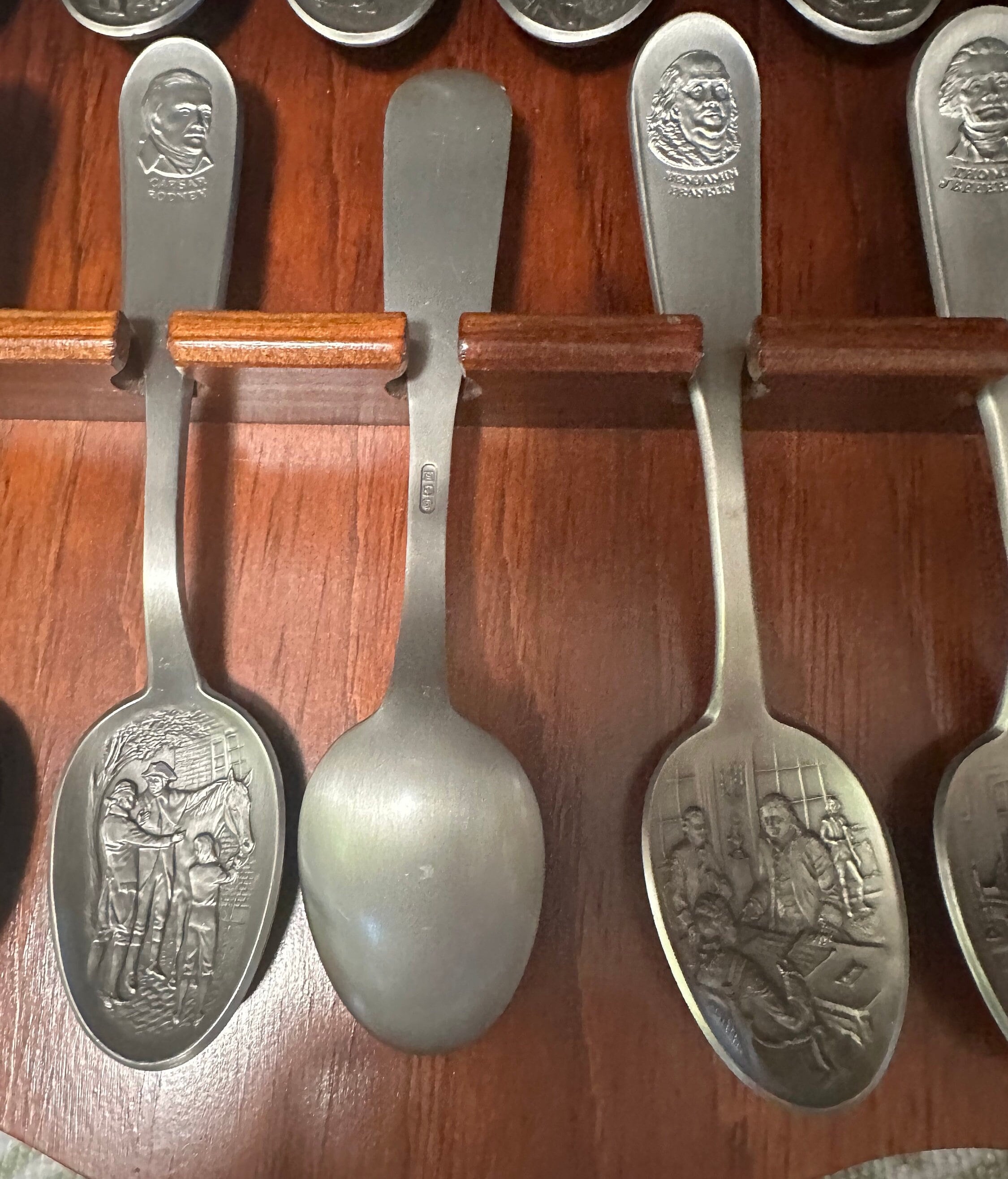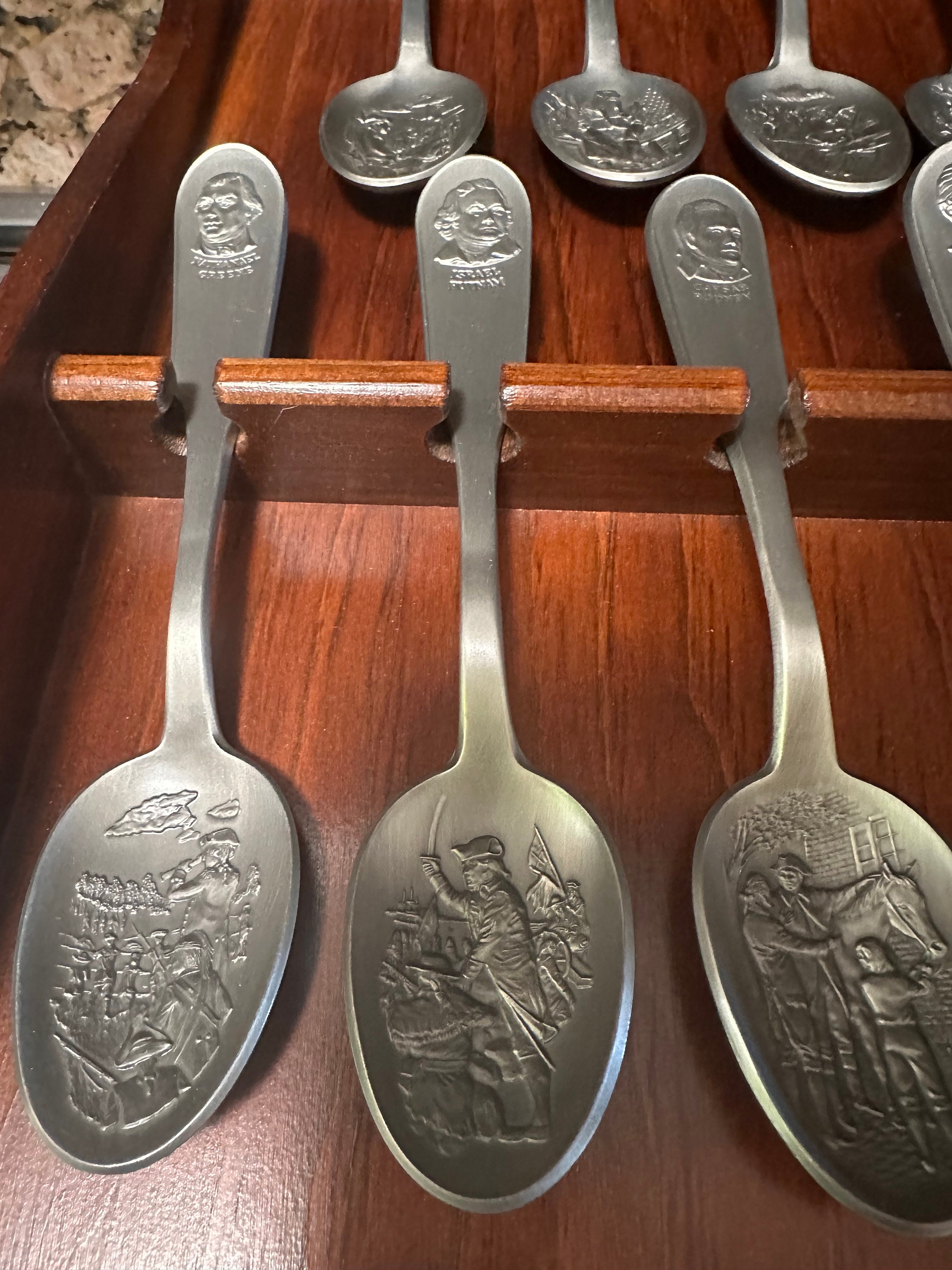 "Vintage 1970s Franklin Mint Bicentennial Spoon Collection with Wooden Wall Rack - 13 Pewter Collectible Spoons in Excellent Condition".