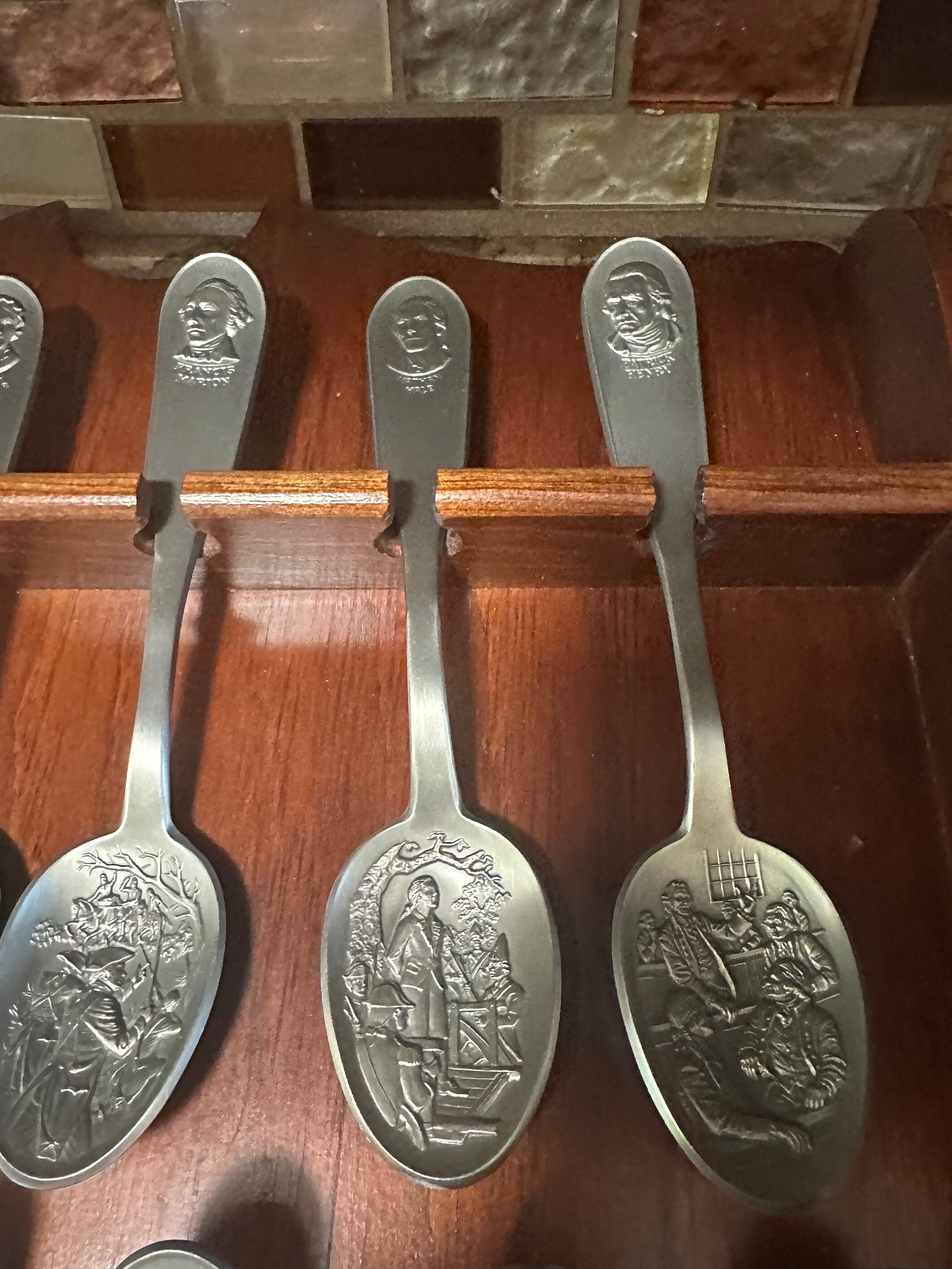 The handle of each spoon bears a sculptured portrait of an outstanding American patriot and the bowl bears the original art work depicting that patriot's great contribution to the success of the American Revolution.