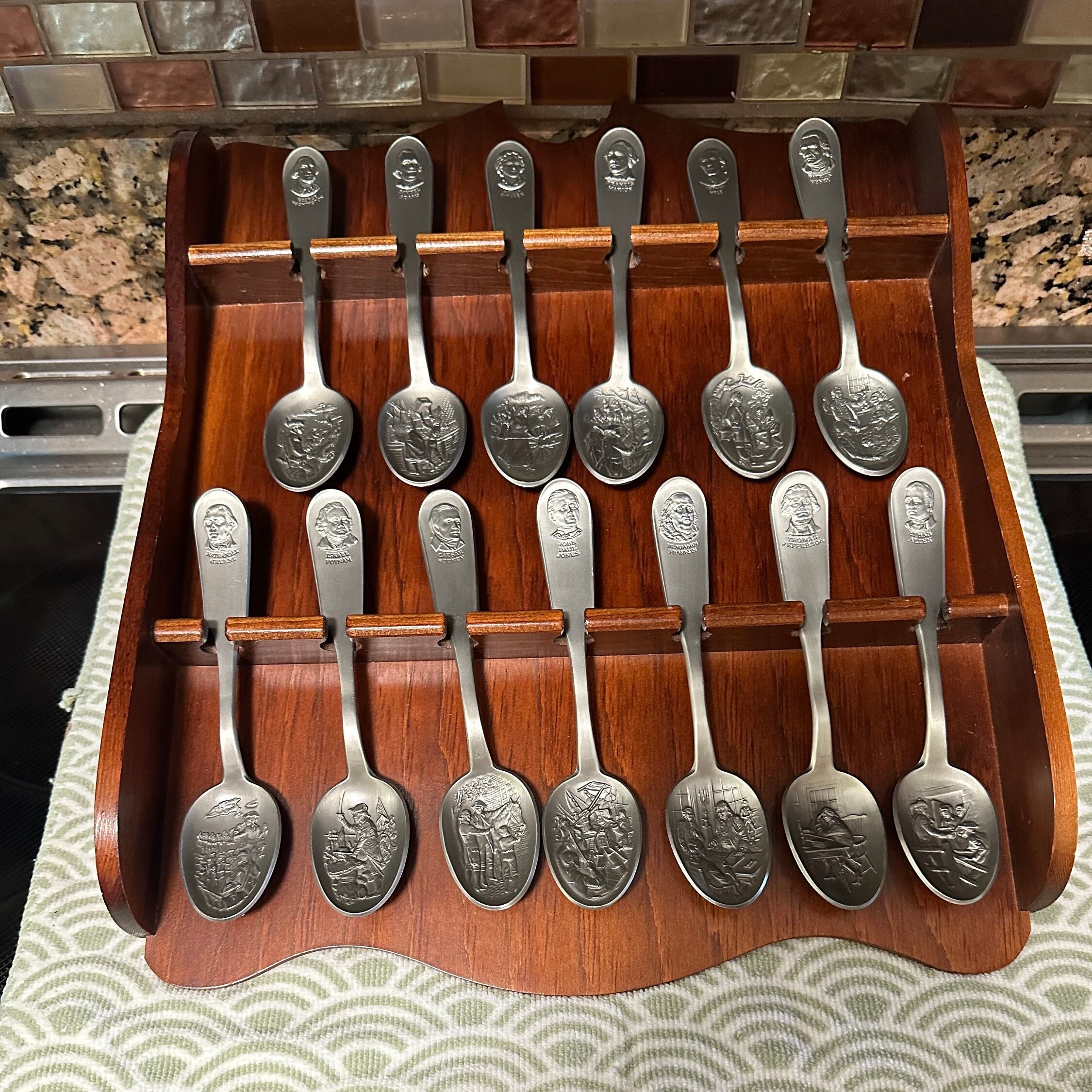 It also comes with a wooden rack for displaying the spoons as a wall hanging. You will also receive the original booklet telling about each person.