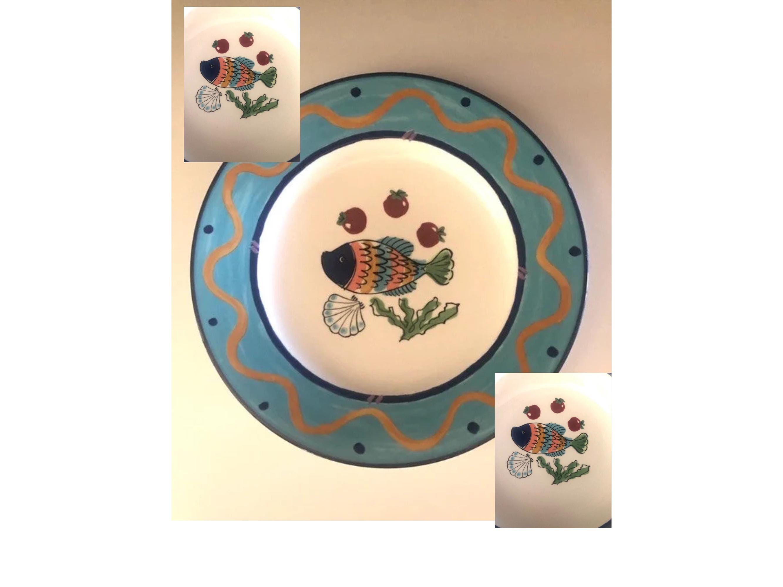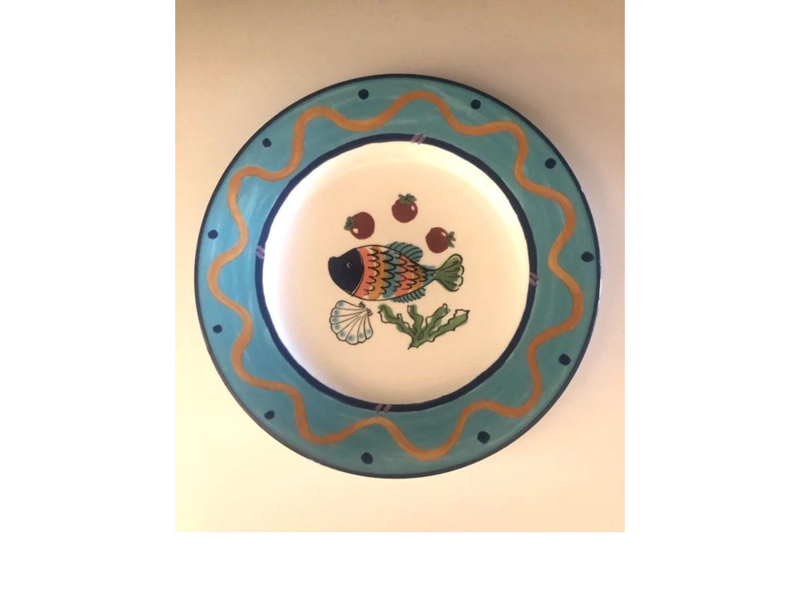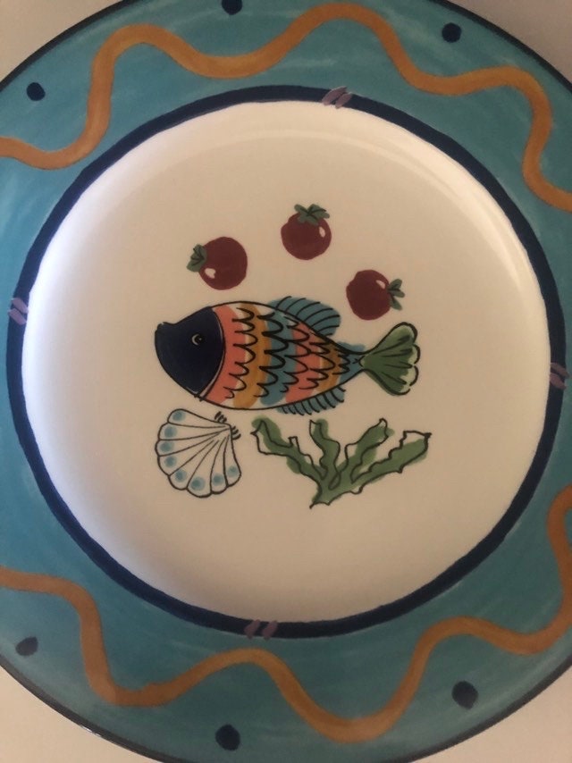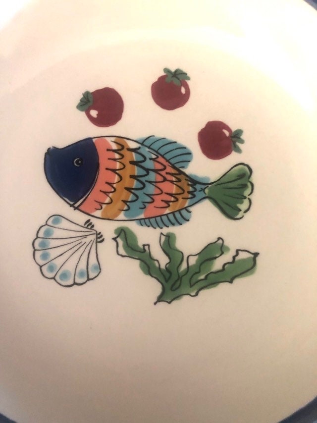 These decorative fish plates were made in the 1990's and are now discontinued. Features a colorful fish with fruit in center with a large aqua band. Made in Malaysia.