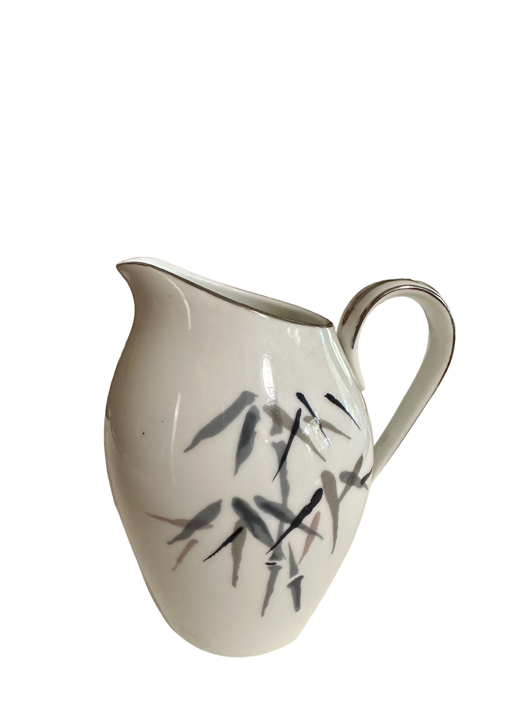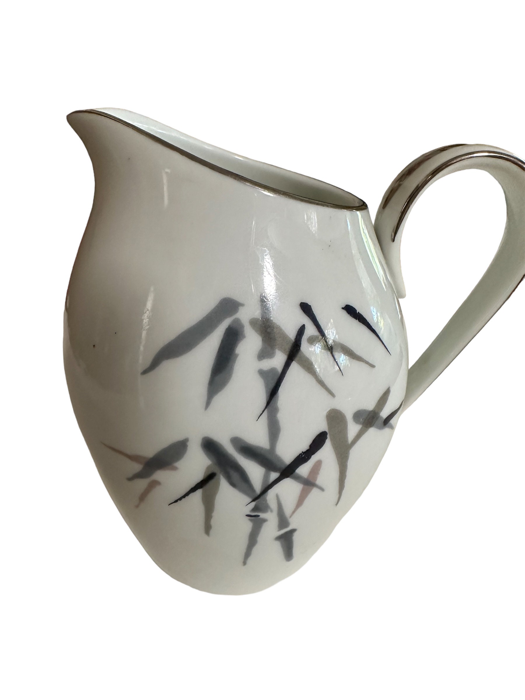 This is a beautiful Noritake Toki Kaisha porcelain creamer with a black and gray bamboo pattern. The cream pitcher has a platinum trim. It is numbered 2133 and it was made in Japan.
