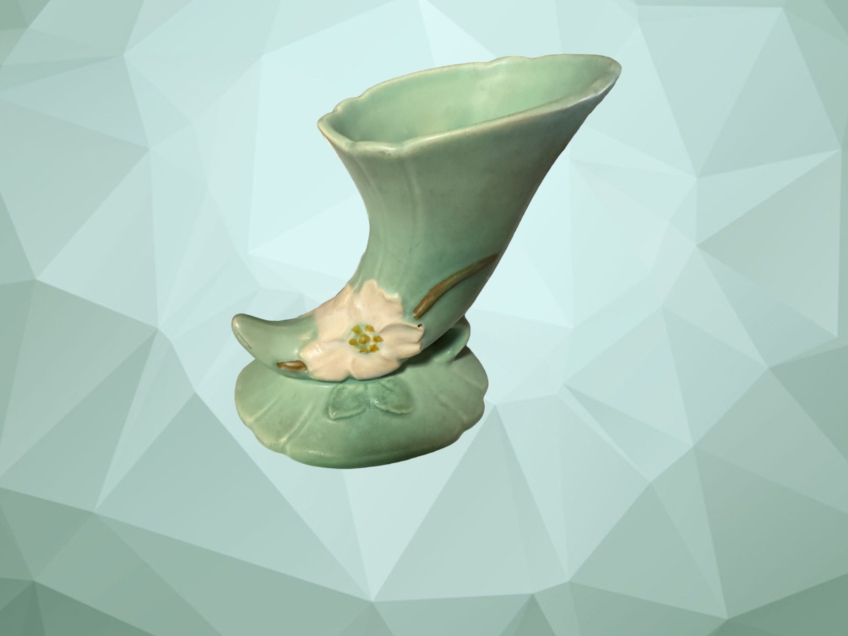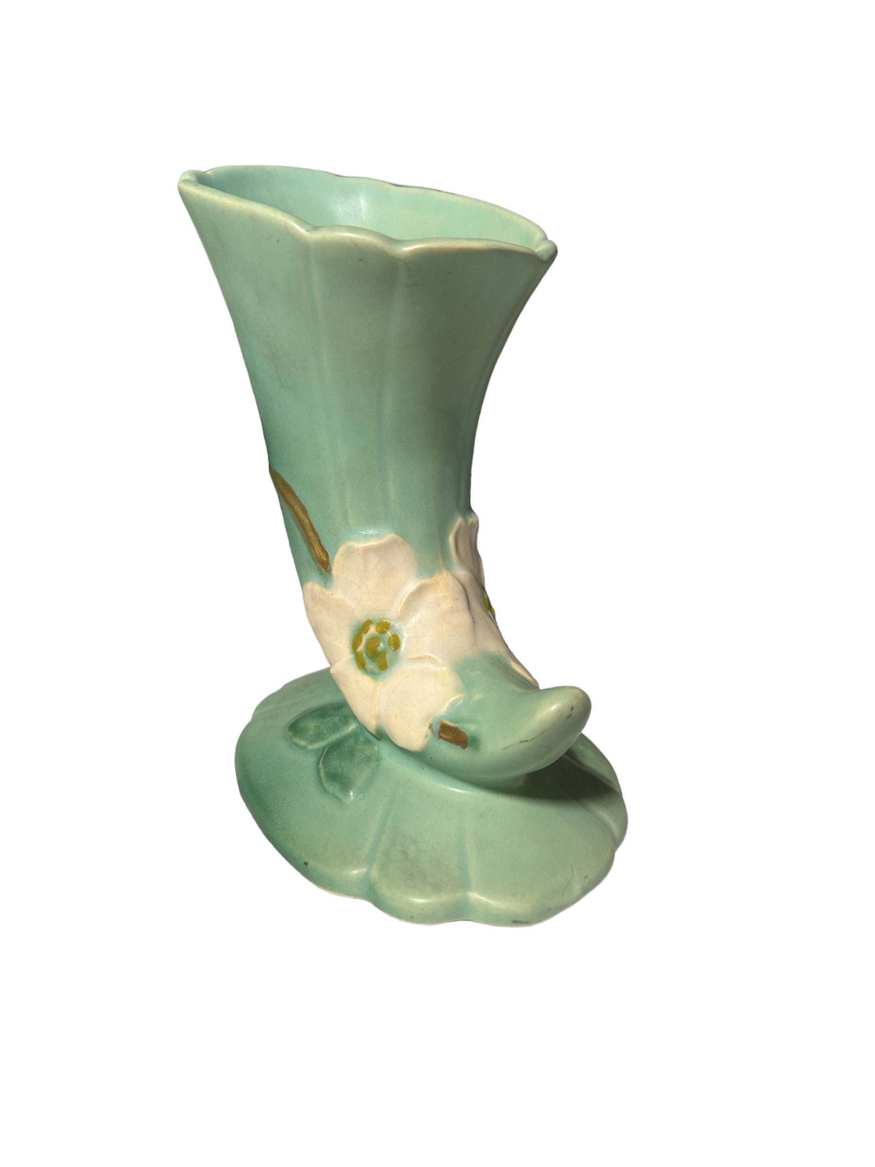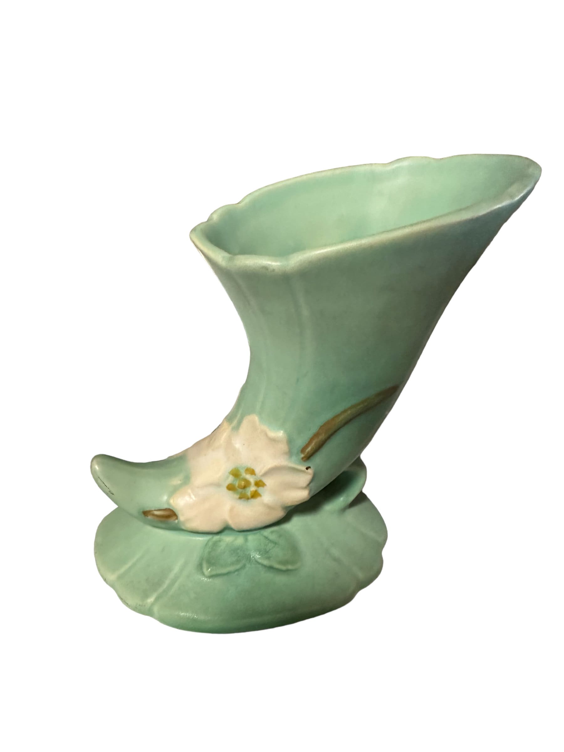 This is for a pair of Weller art pottery cornucopia vases. The matte green pottery vases with white flower on each side.are in excellent condition. The vintage vases measures 6 inches. The base measures 5" x 3.25". It is signed Weller on the bottom of the vase. This is a great gift for her!