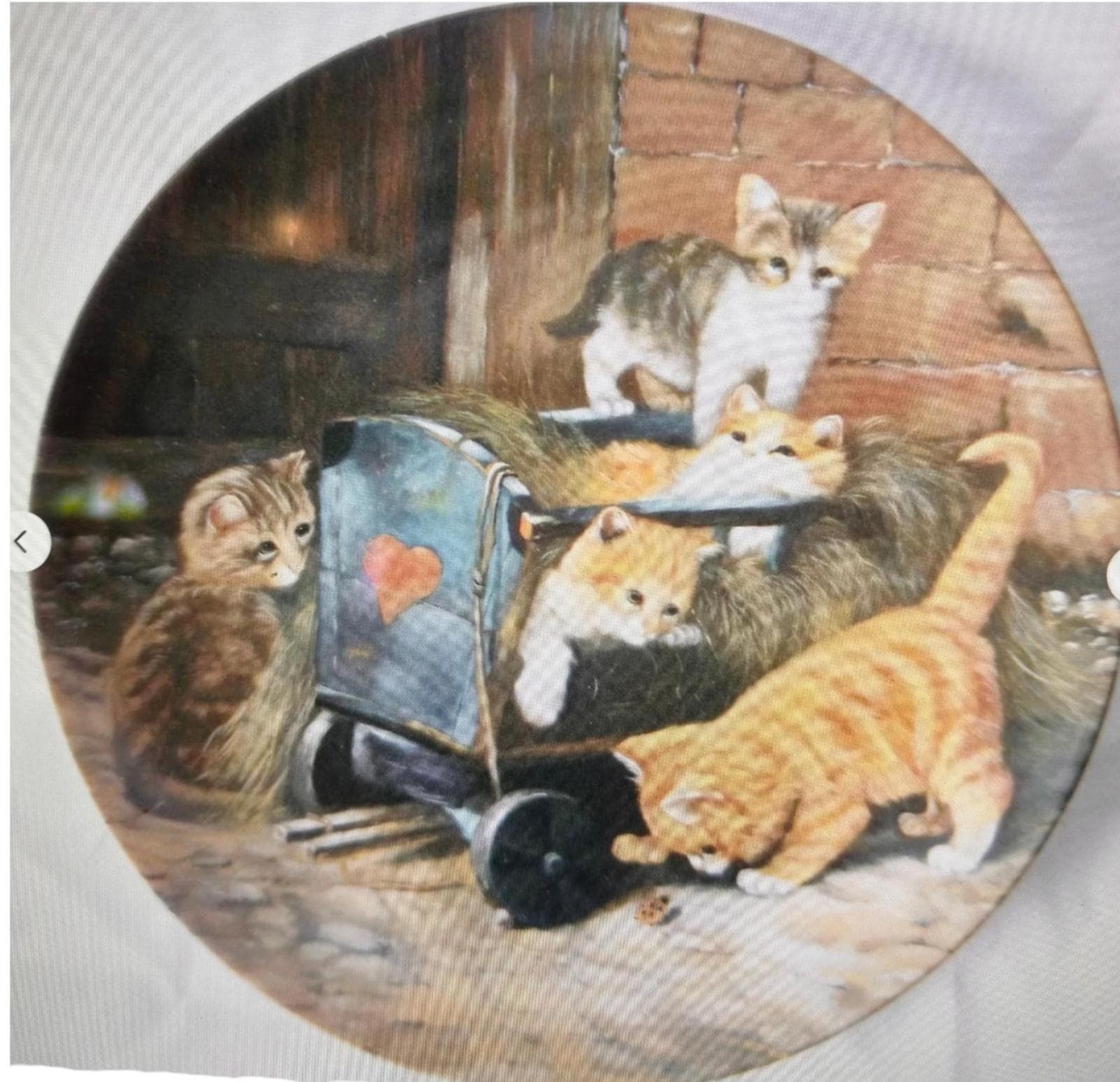 This is a Seltmann Weiden cute kitten plate, play time wall hanging by Wolfgang Kaiser. It measures approximately 8 inches in diameter. The cat decoration features little baby kittens at play. The plate was made in Germany. It is plate # M3465